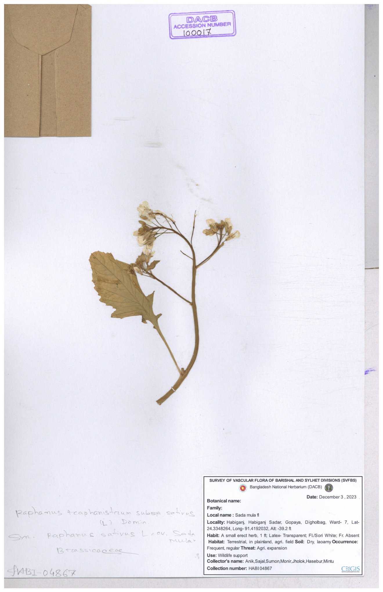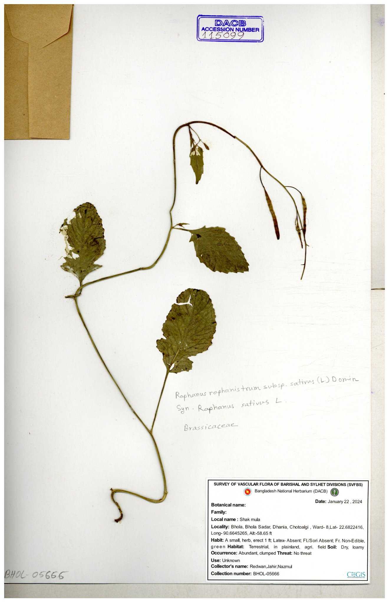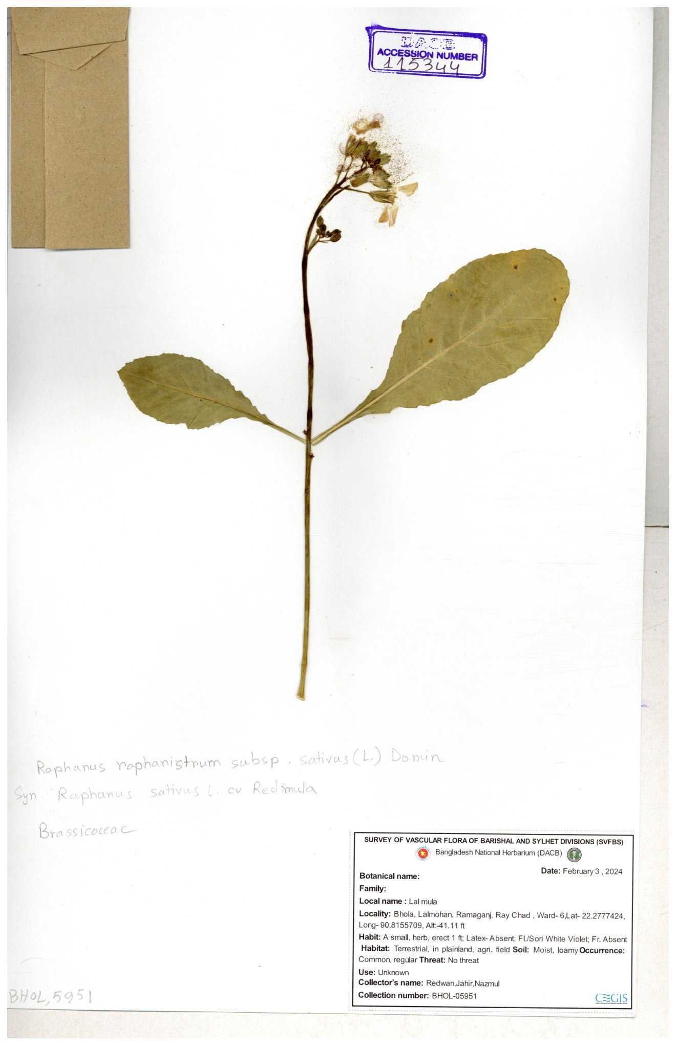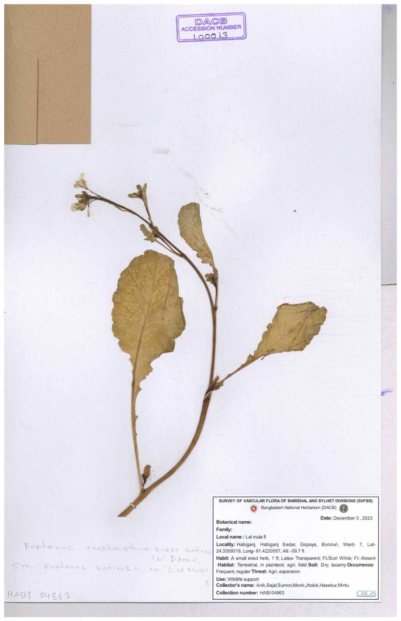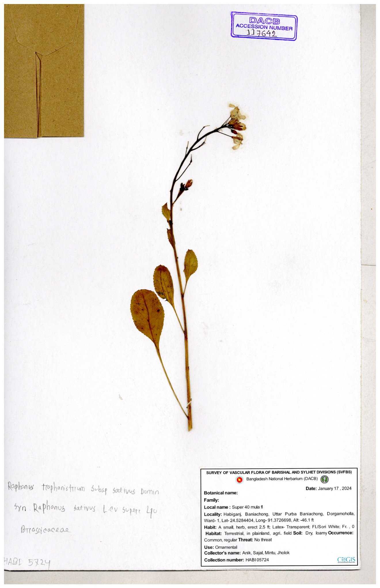 | 67352 | Brassicaceae | Raphanus sativus L. | Mula | I Hossen et al | IH-3419 17-01-2017 |
