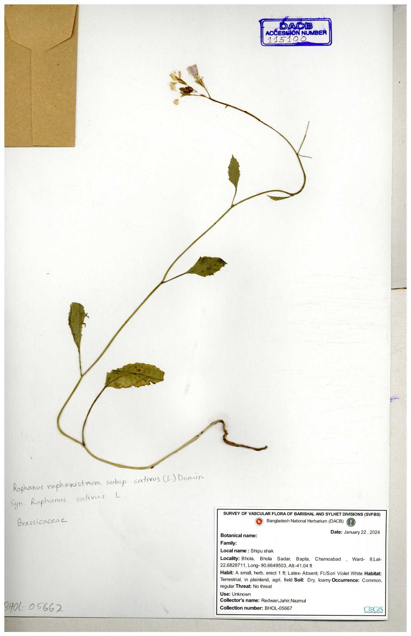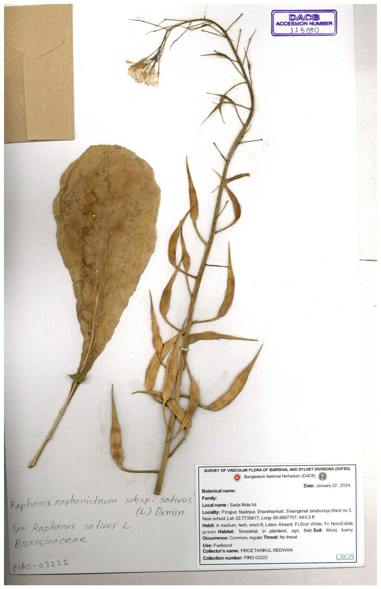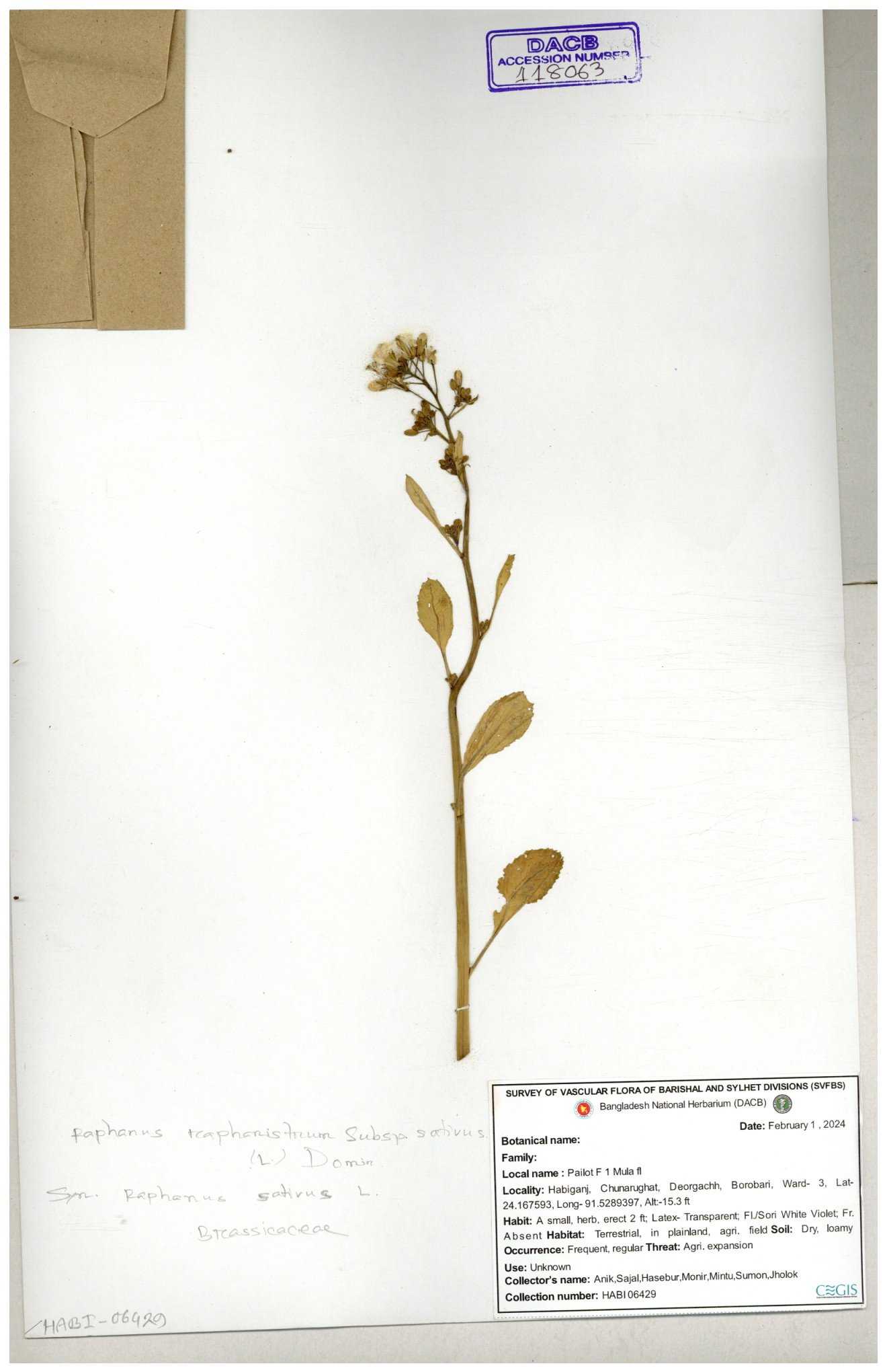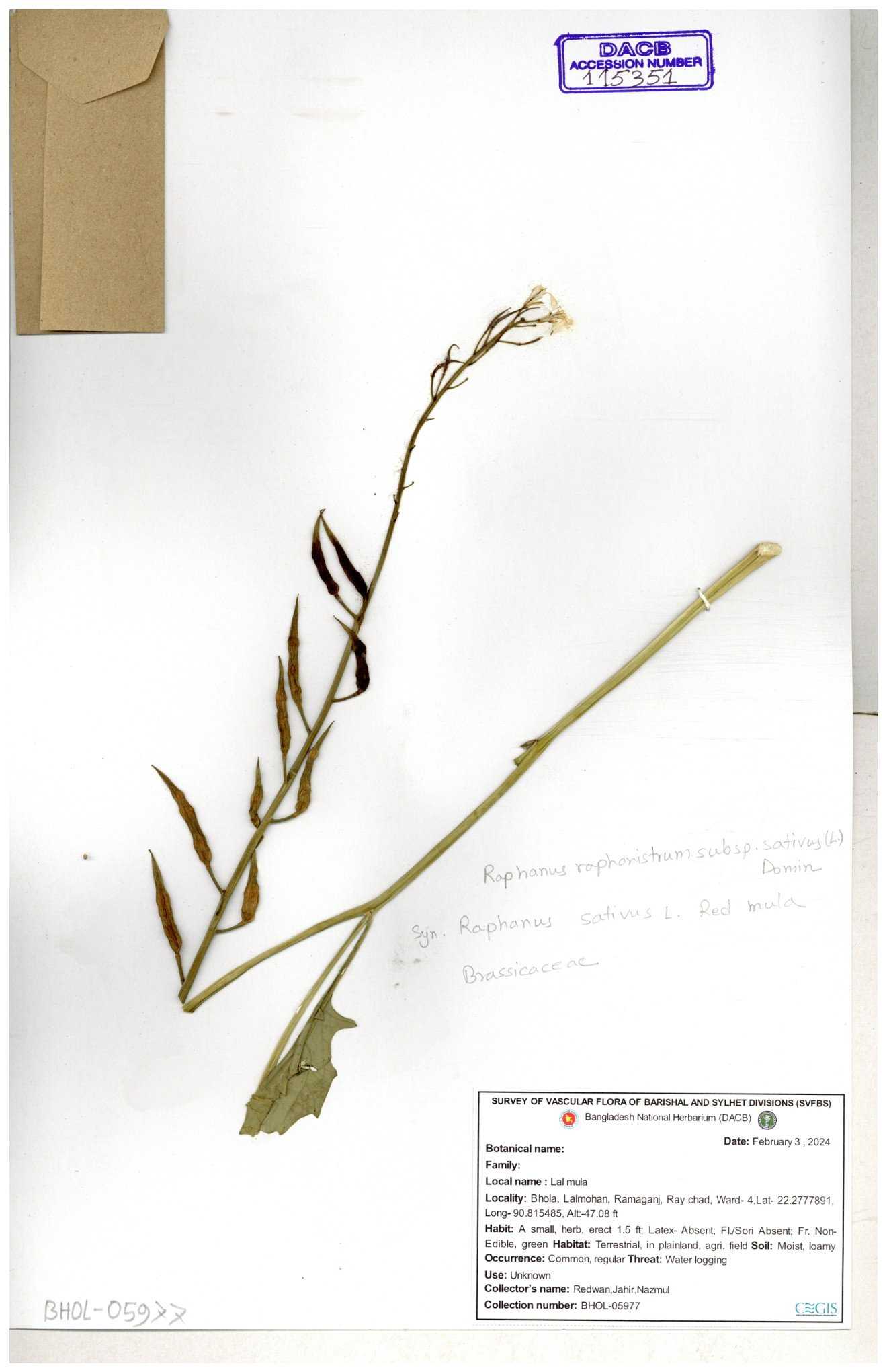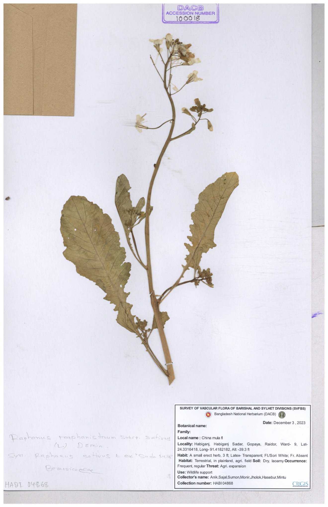 | 67352 | Brassicaceae | Raphanus sativus L. | Mula | I Hossen et al | IH-3419 17-01-2017 |
