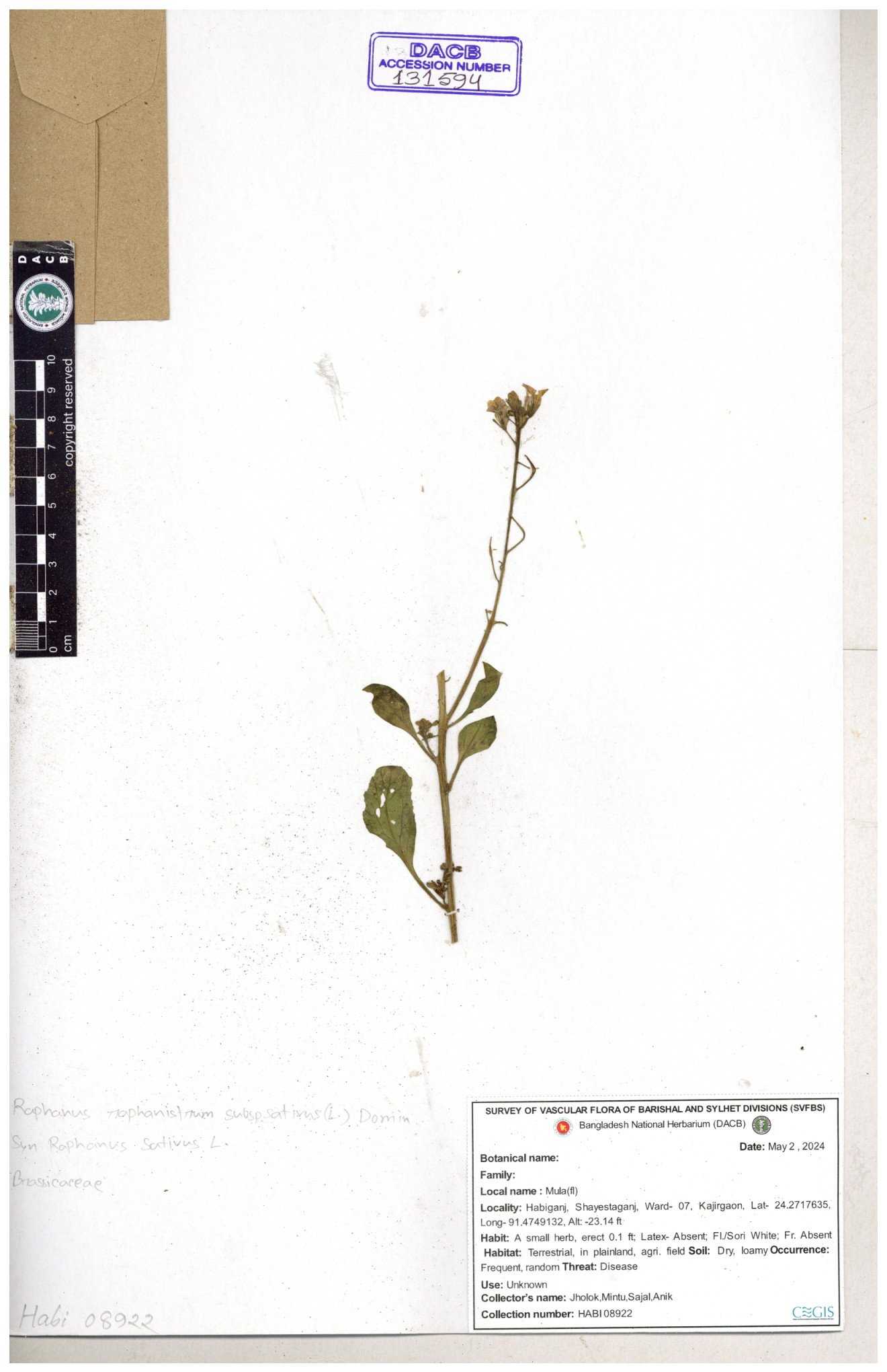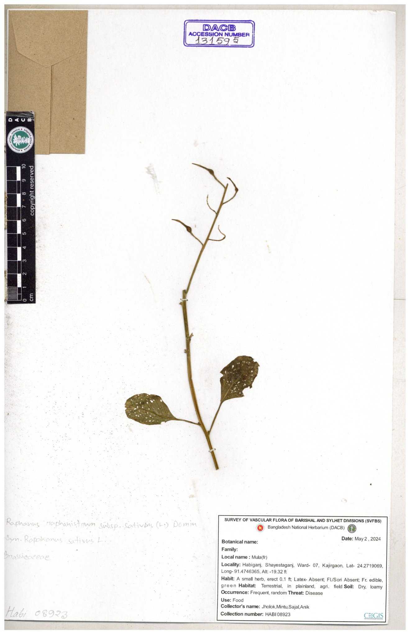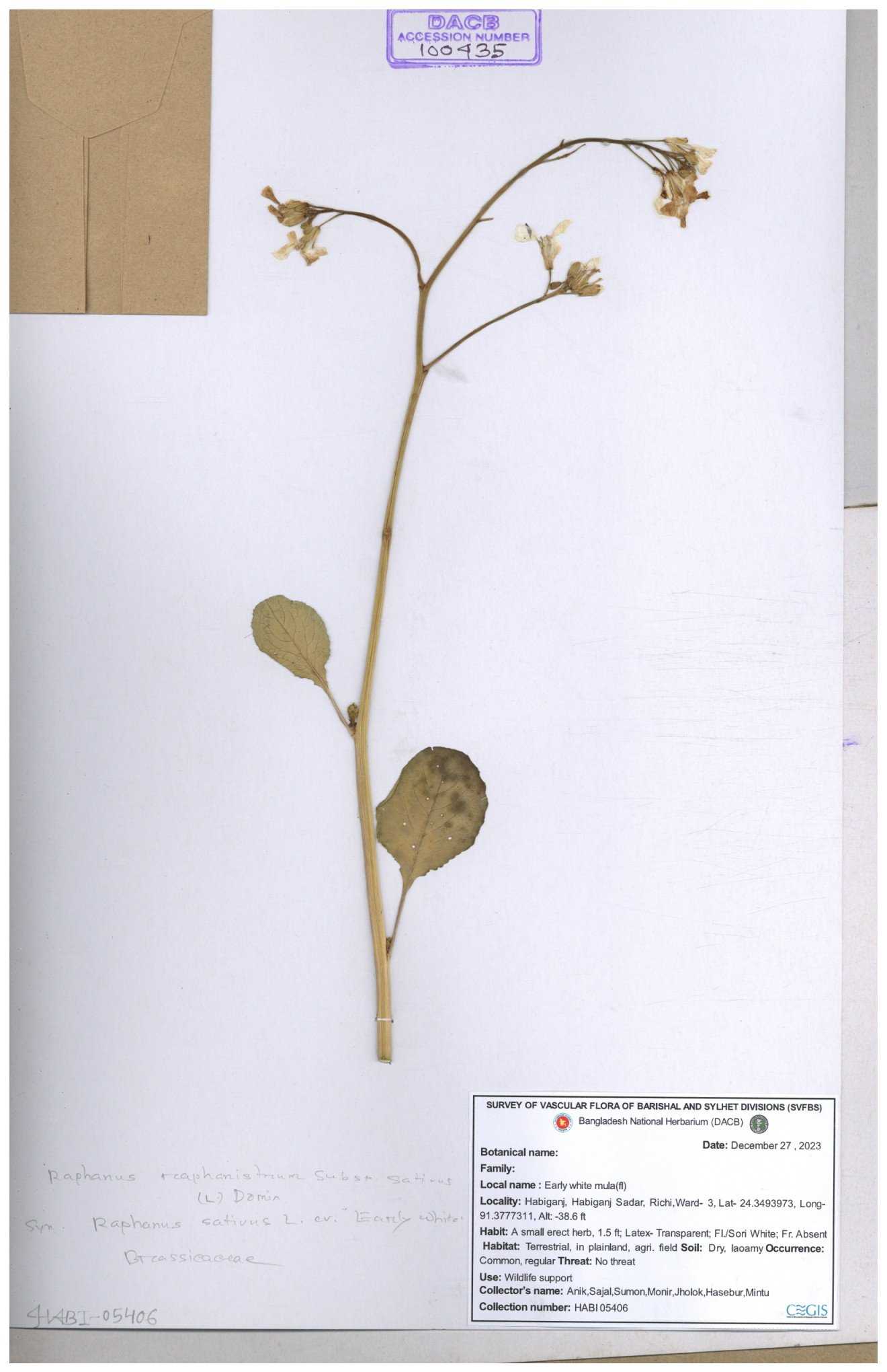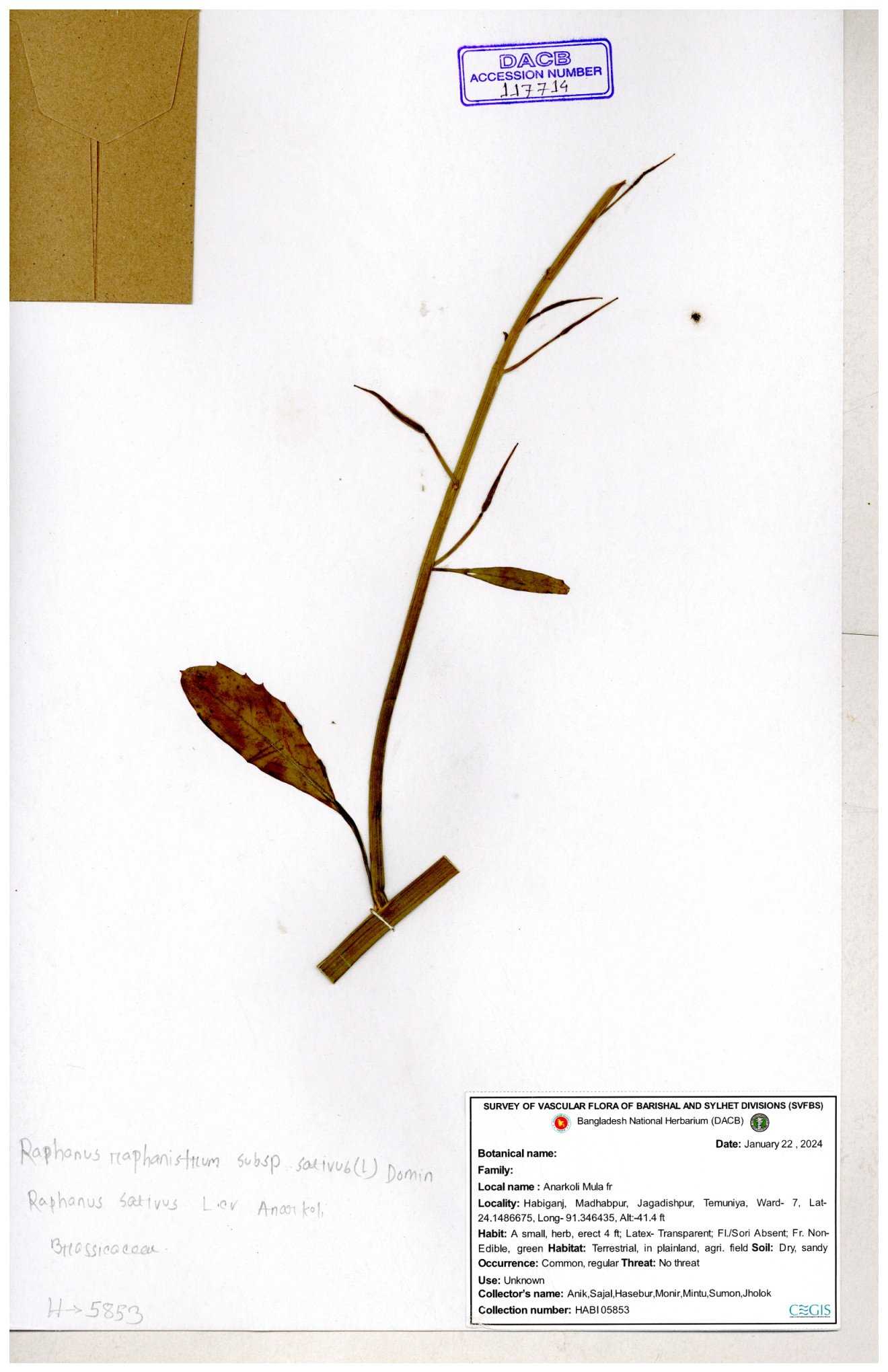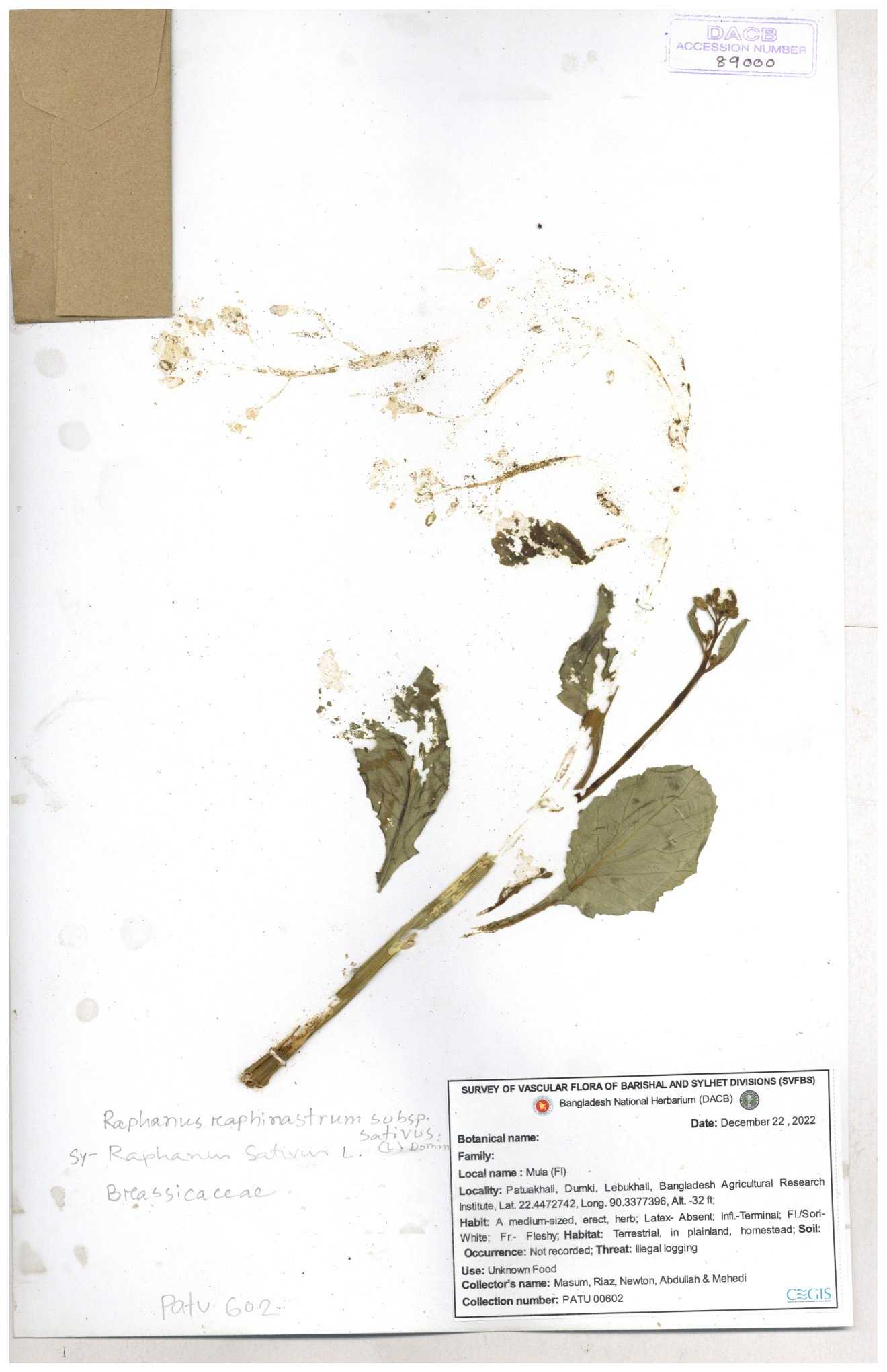 | 67352 | Brassicaceae | Raphanus sativus L. | Mula | I Hossen et al | IH-3419 17-01-2017 |