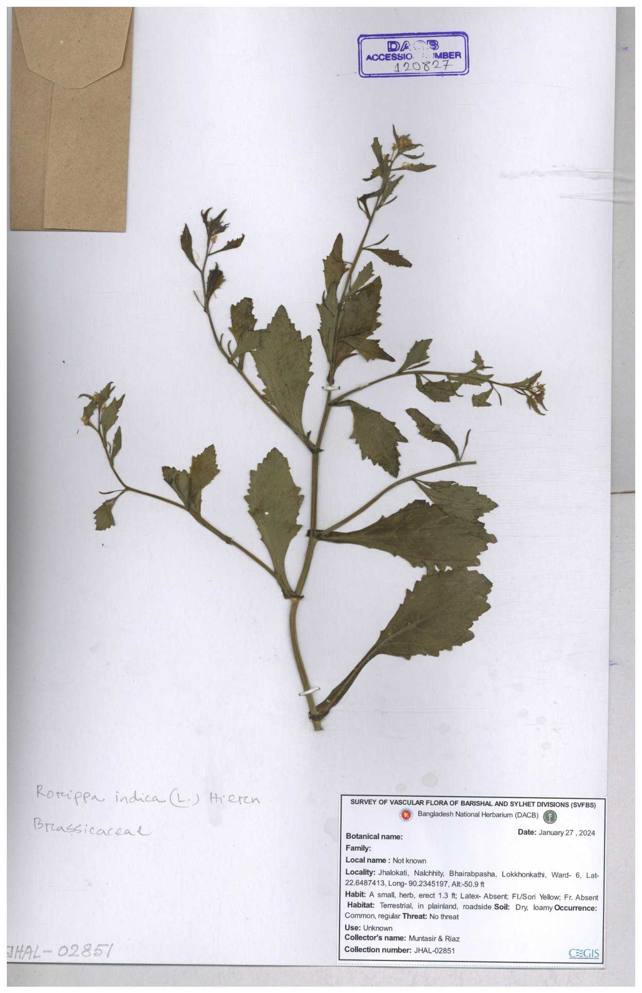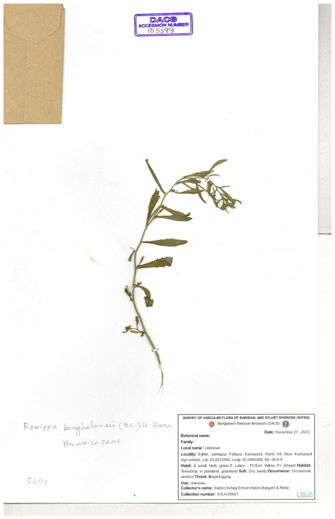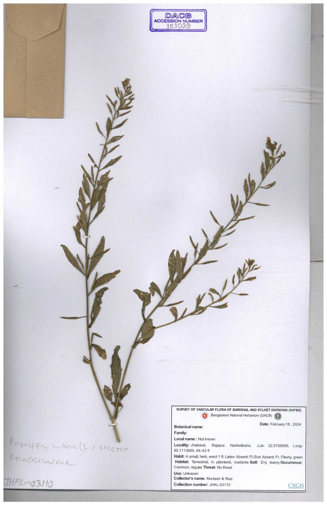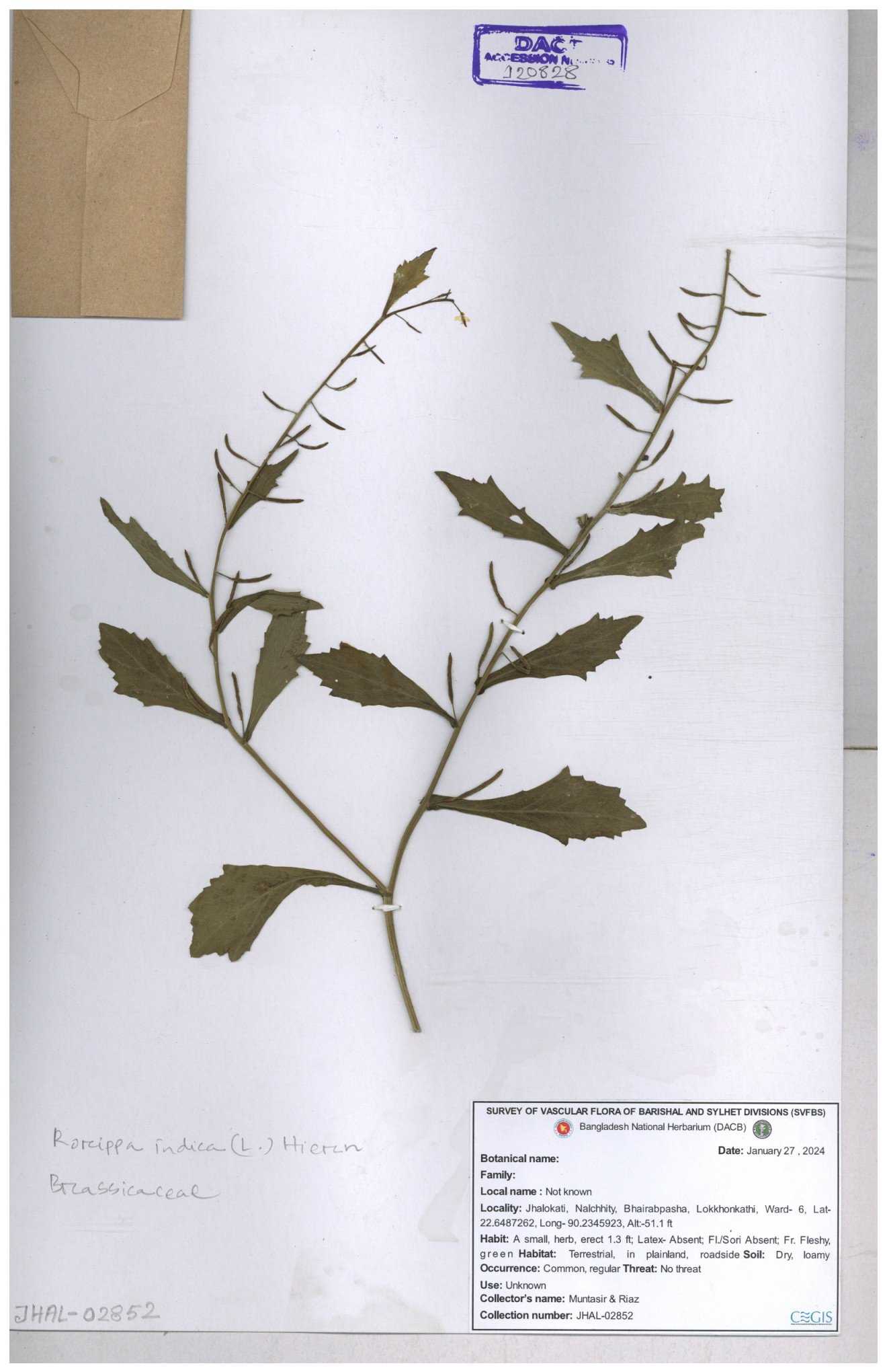 | 71695 | Brassicaceae | Rorippa bengalensis | I Hossen et al | IH-387 26-09-2016 |