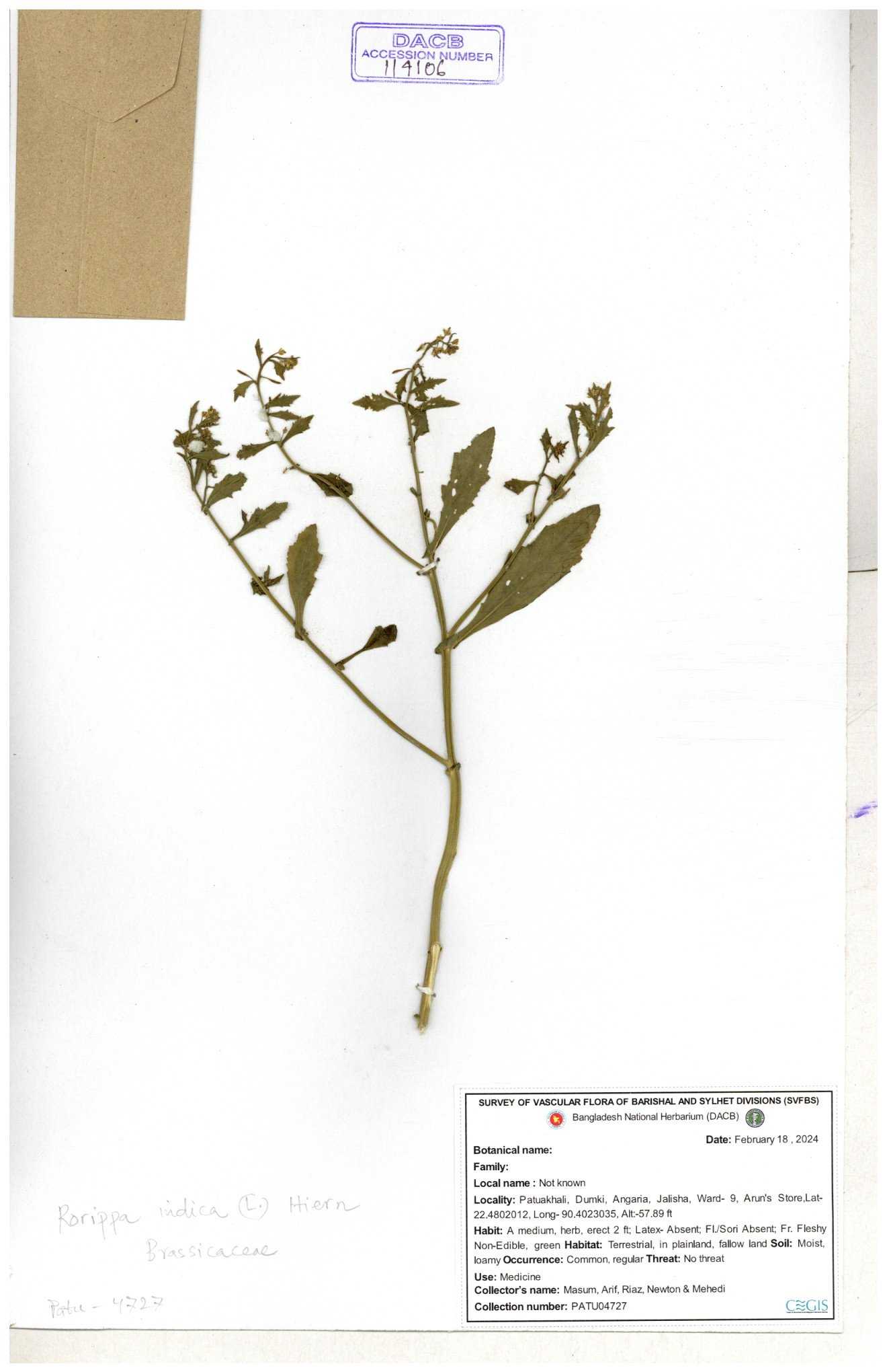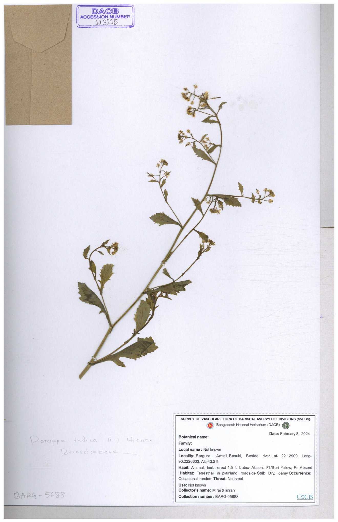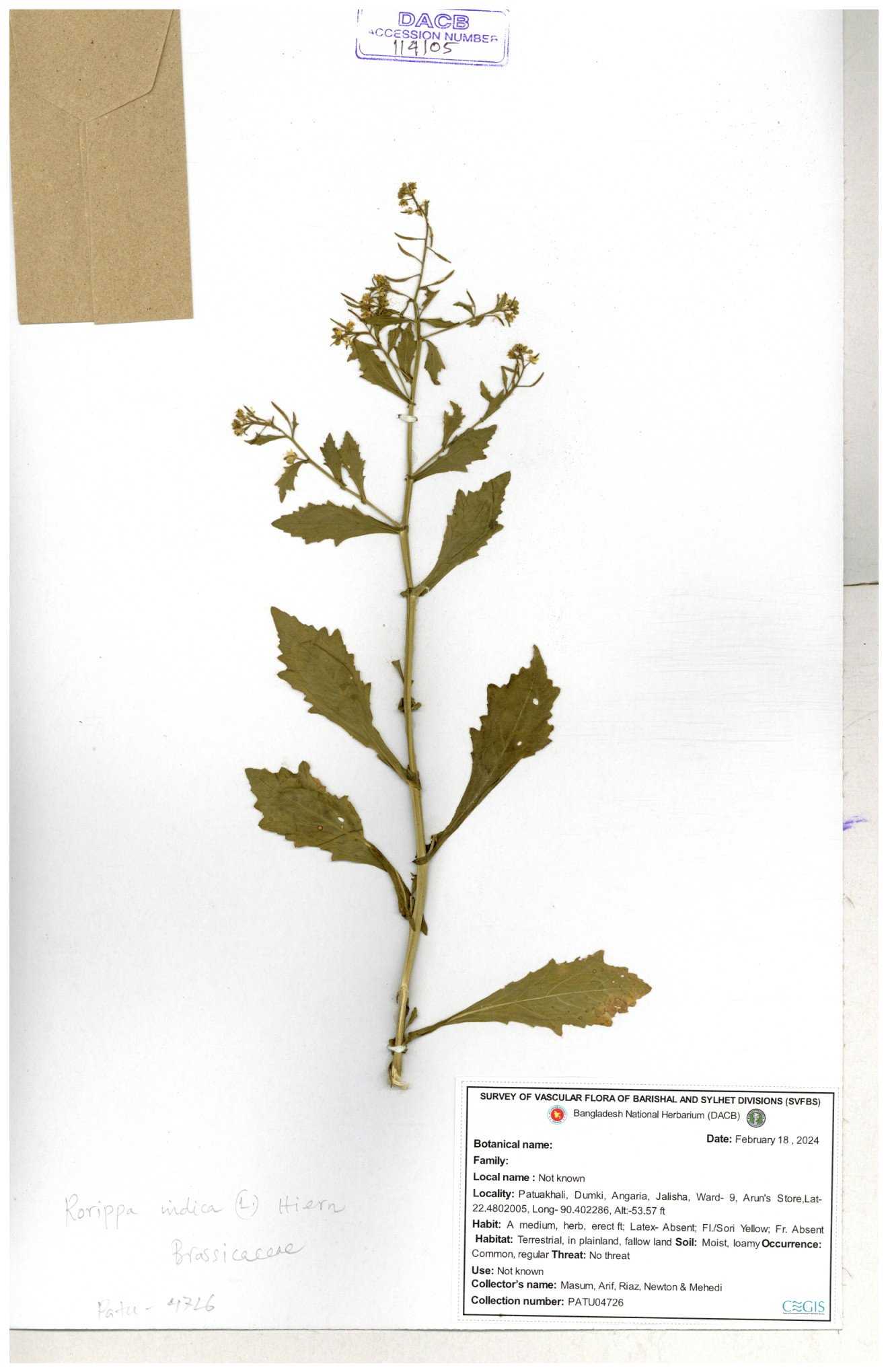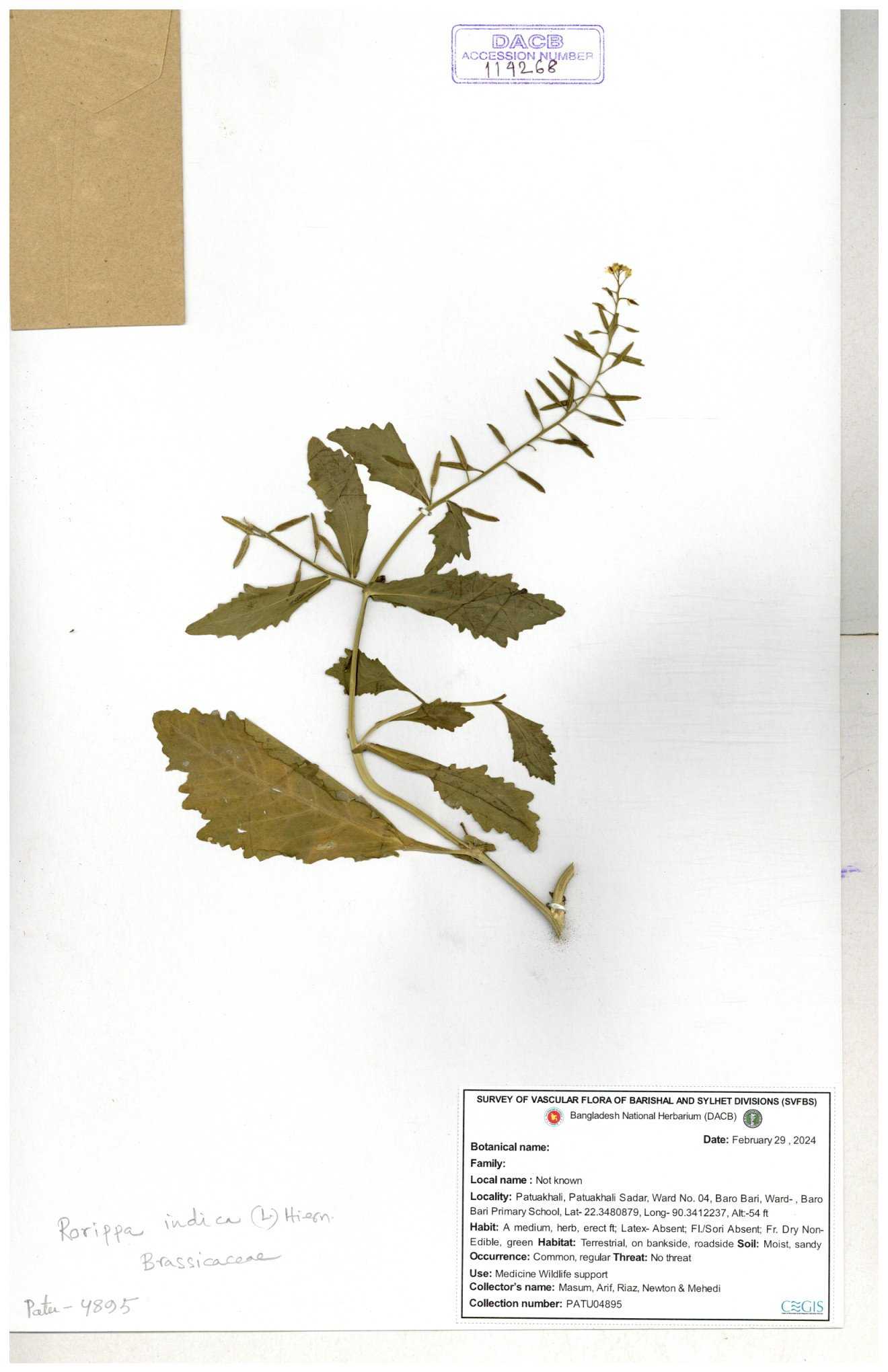 | 71695 | Brassicaceae | Rorippa bengalensis | I Hossen et al | IH-387 26-09-2016 |