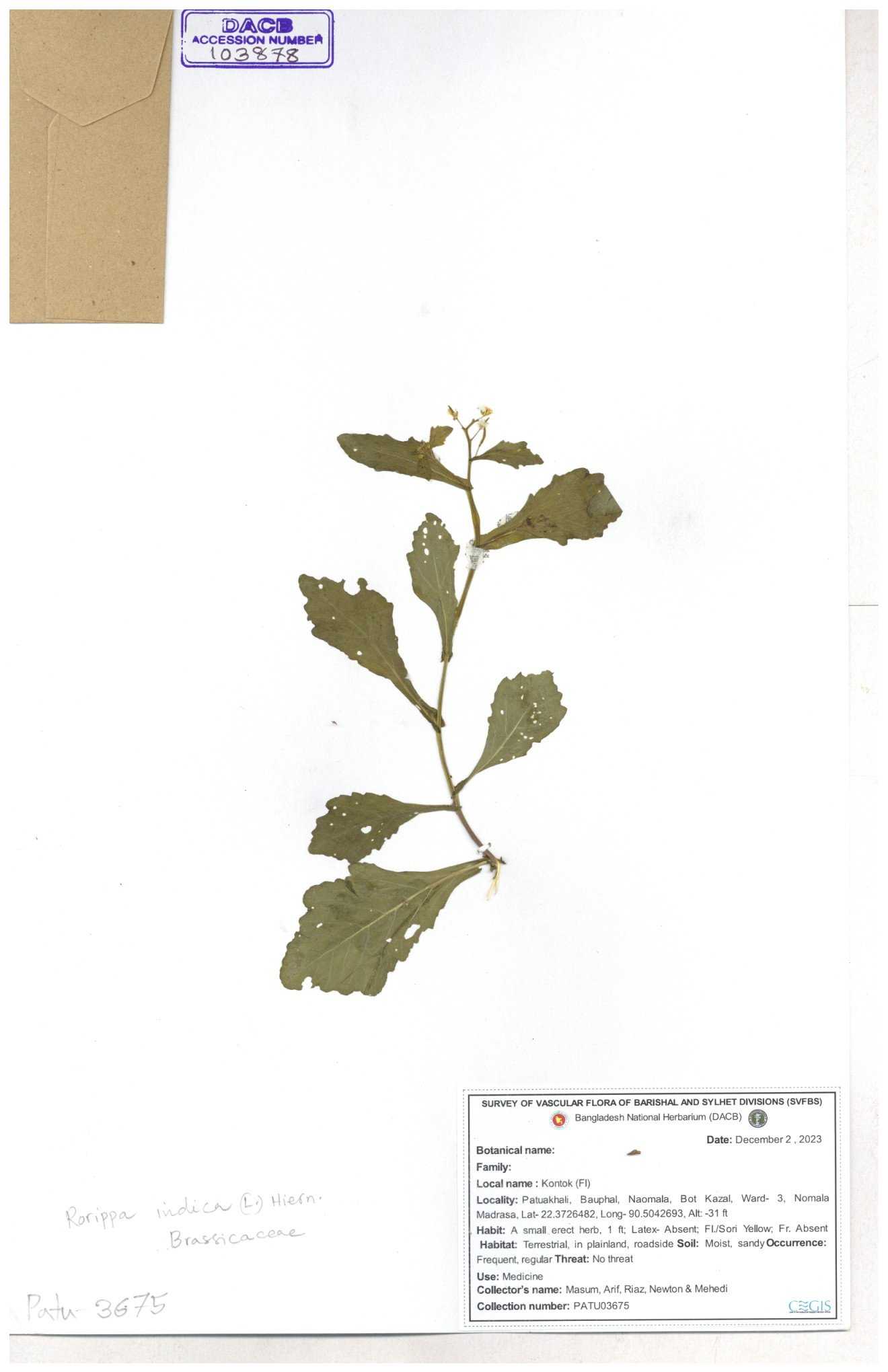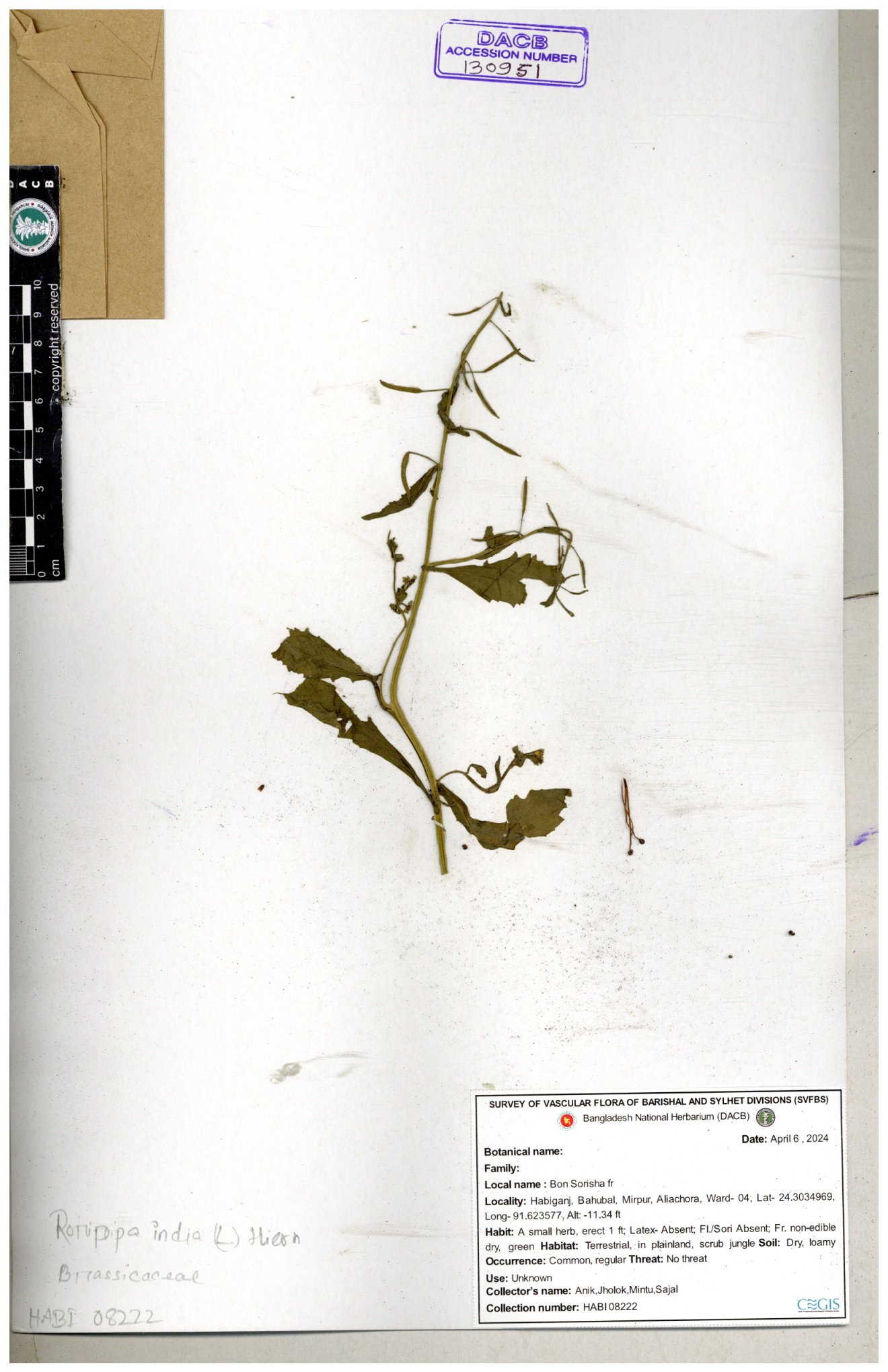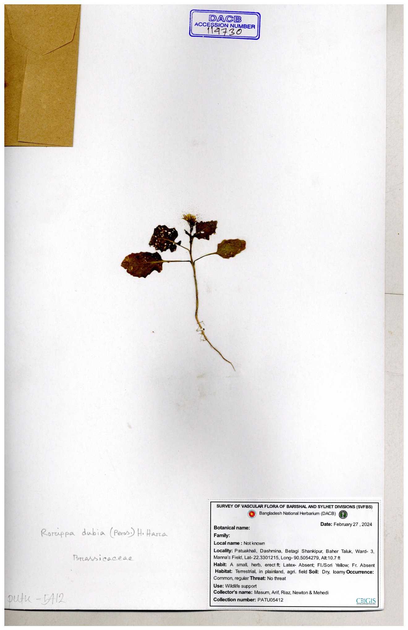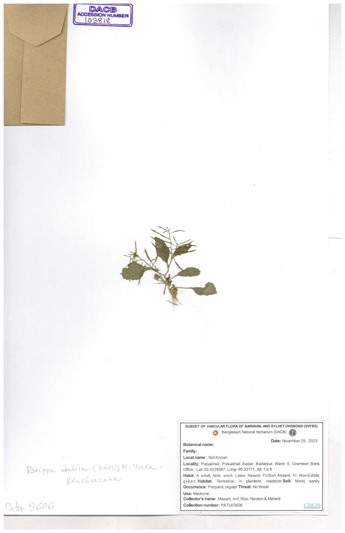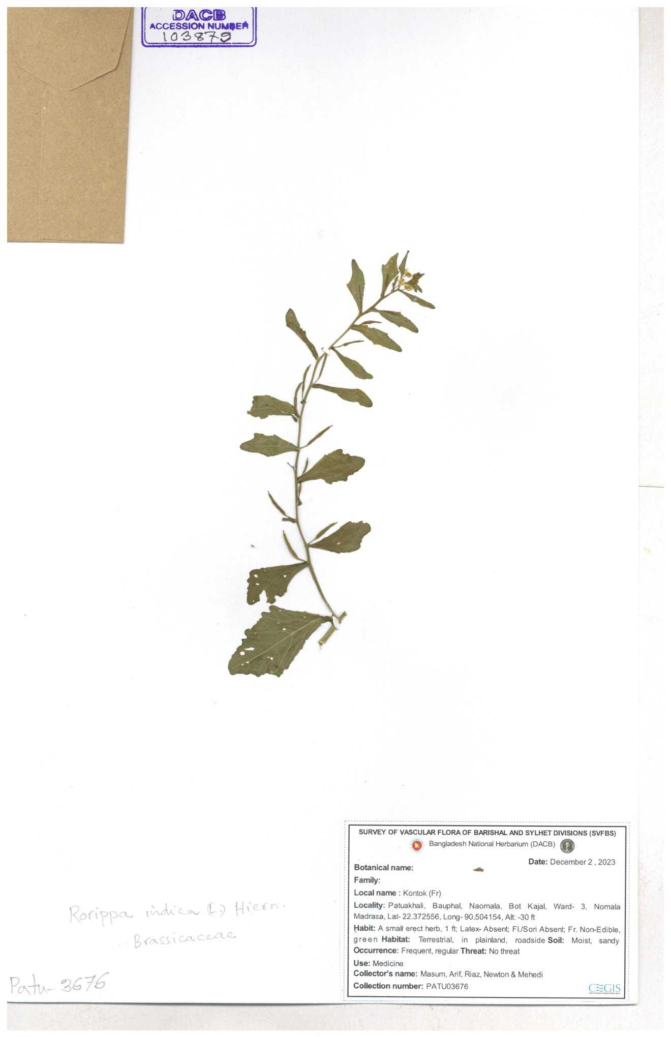 | 130598 | Brassicaceae | Rorippa dubia | Anik, Jholok, Mintu, Sajal | 30-11--0001 |