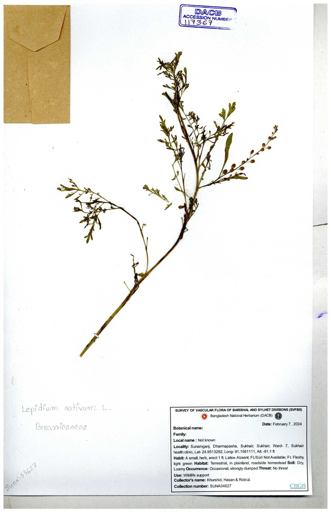 | 33914 | Brassicaceae | Lepidium sativum L. | Sader Nasir Uddin | N.2757 13-08-2006 |