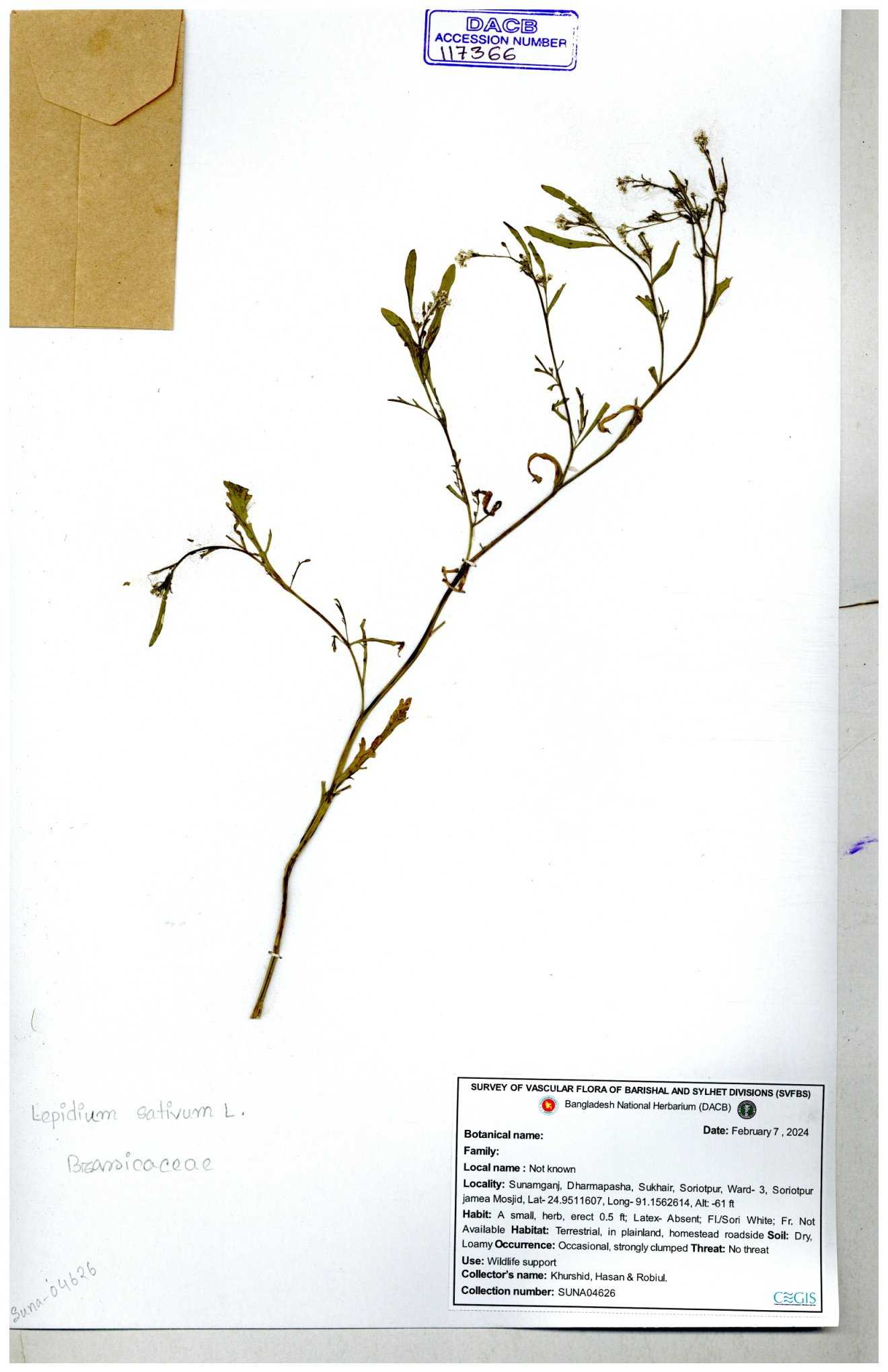 Khorerhat, Chittagong, Mirsharai, Bangladesh. | Herb, leaves alternate, long petiolate, fruit pod, flower white, from cultivated land, abundant. |