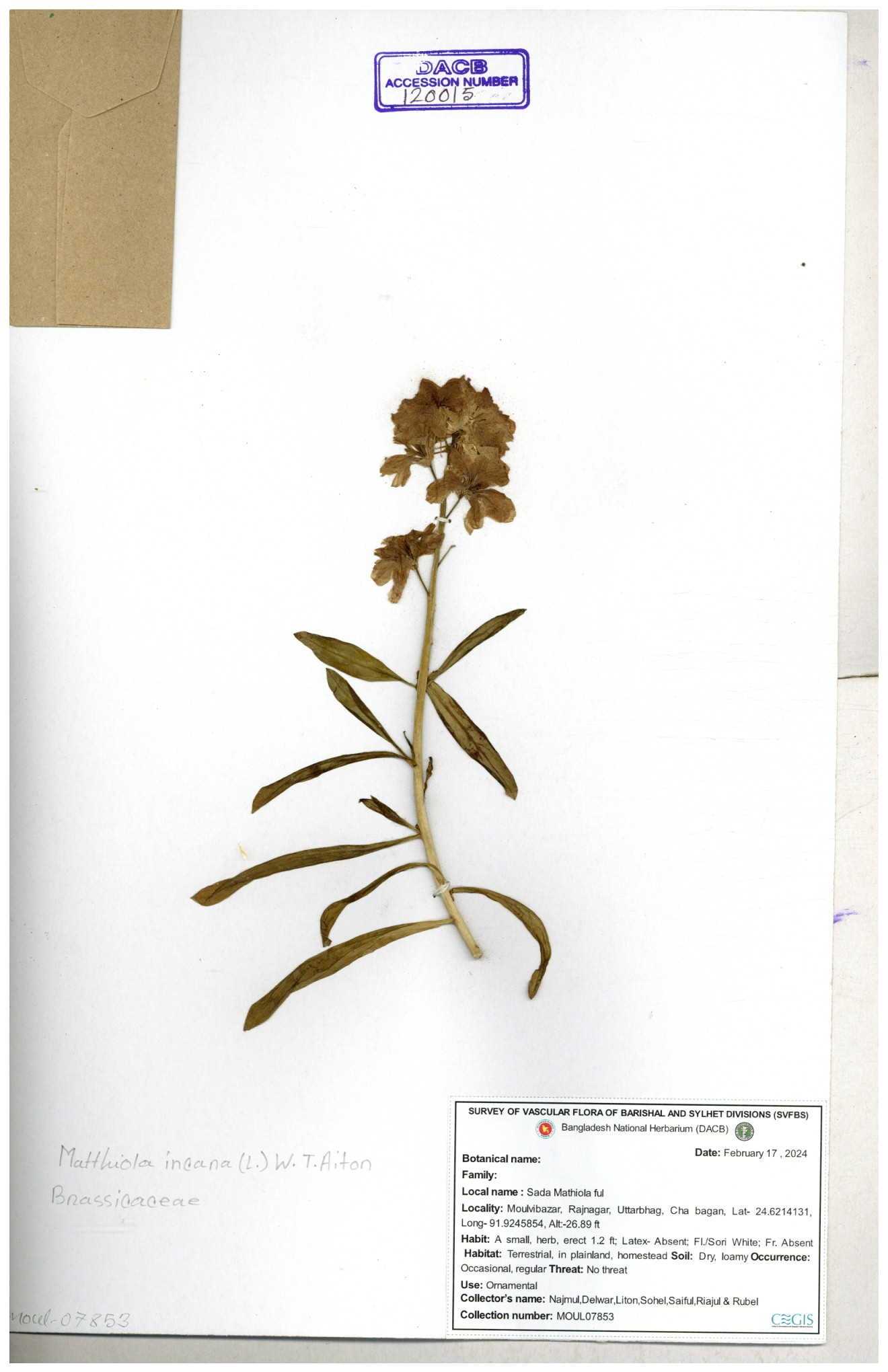 Kumira, Chittagong, Sitakunda, Bangladesh. | Herb; Leaf green, Ovate, Dentate, Cuspidate; Alternae foliae; Flower violet; Fruit silicua; Cultivated, Common. |