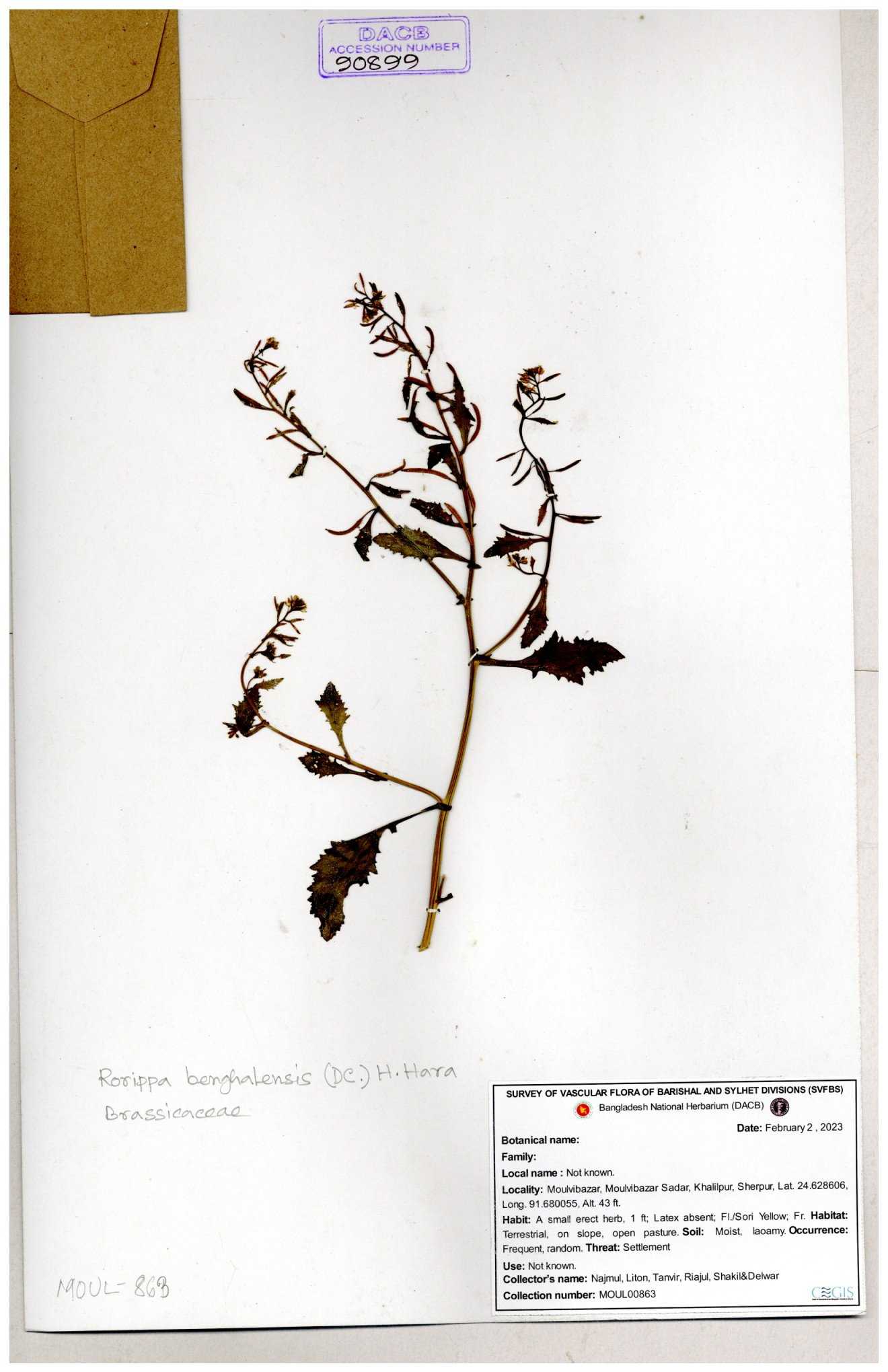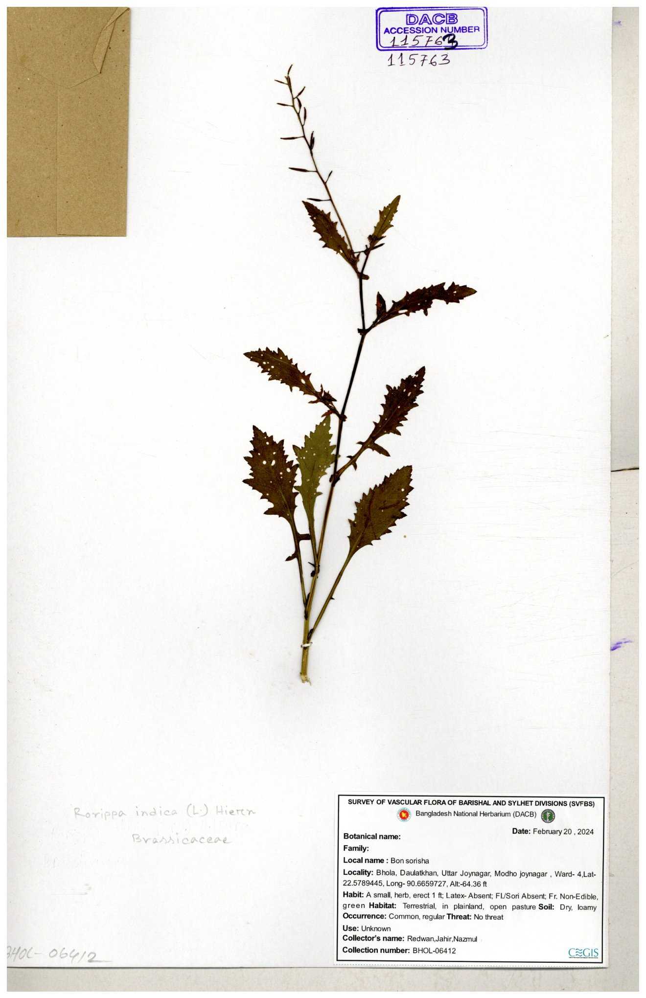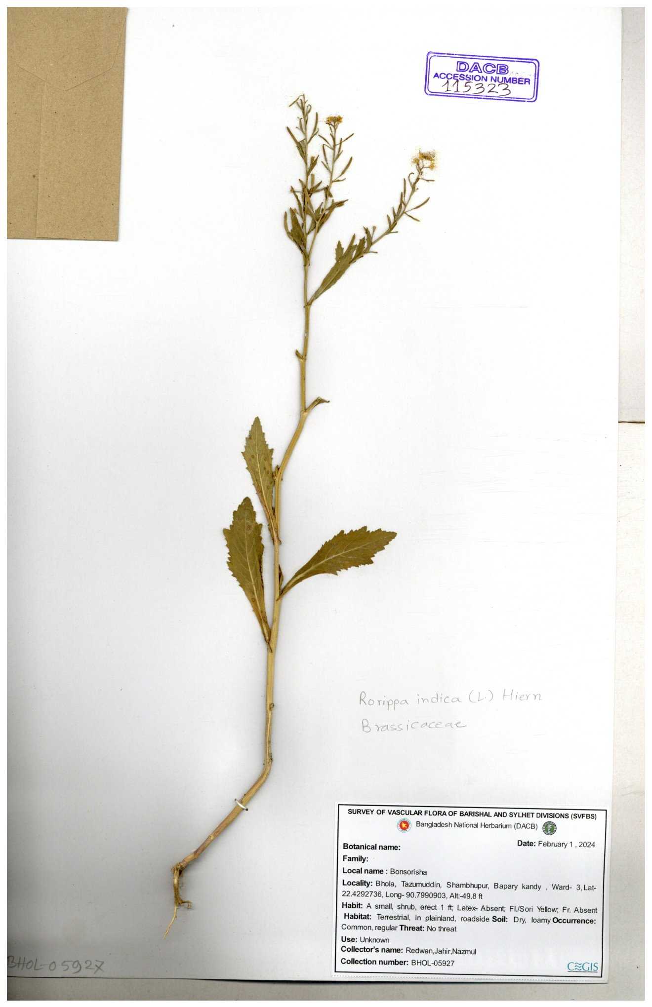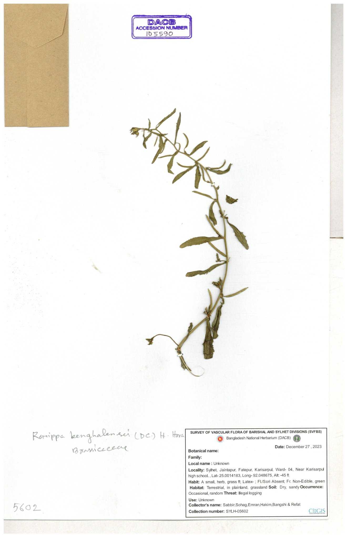 | 39759 | Brassicaceae | Rorippa heterophedla | Emdadul Hoque | EH-101 09-02-2014 |