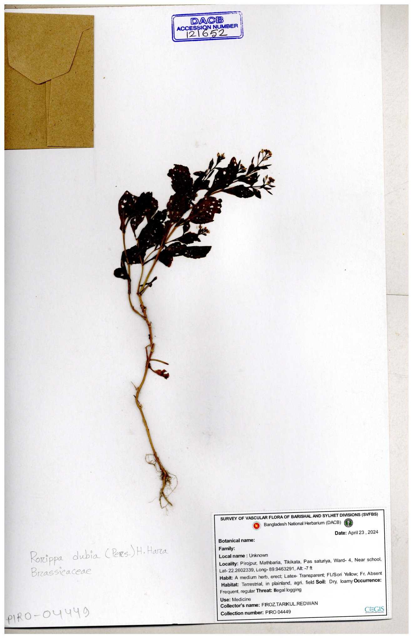 | 121652 | Brassicaceae | Rorippa dubia | 30-11--0001 |
