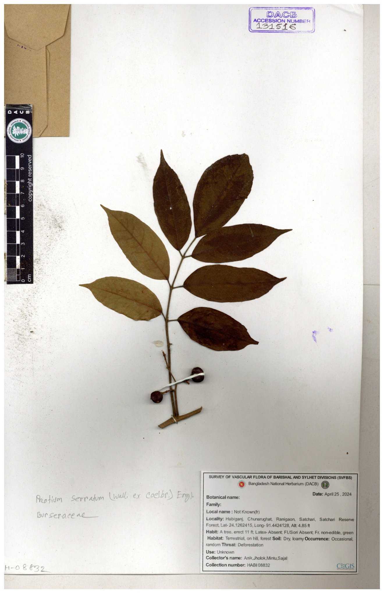 | 63501 | Burseraceae | Protium serratum (Wall. ex Colebr.) Engl. | Khandakar Kamrul Islam | KKI-3567 30-11--0001 |
