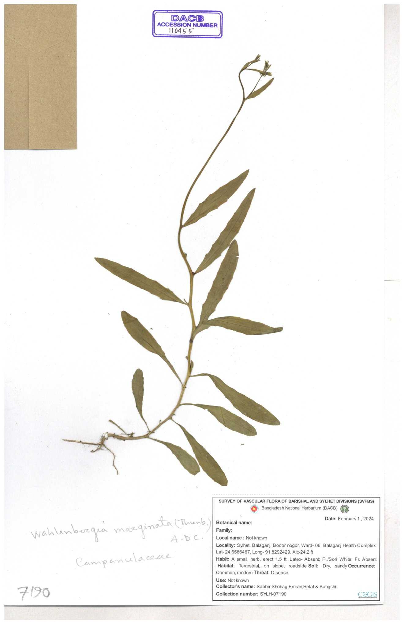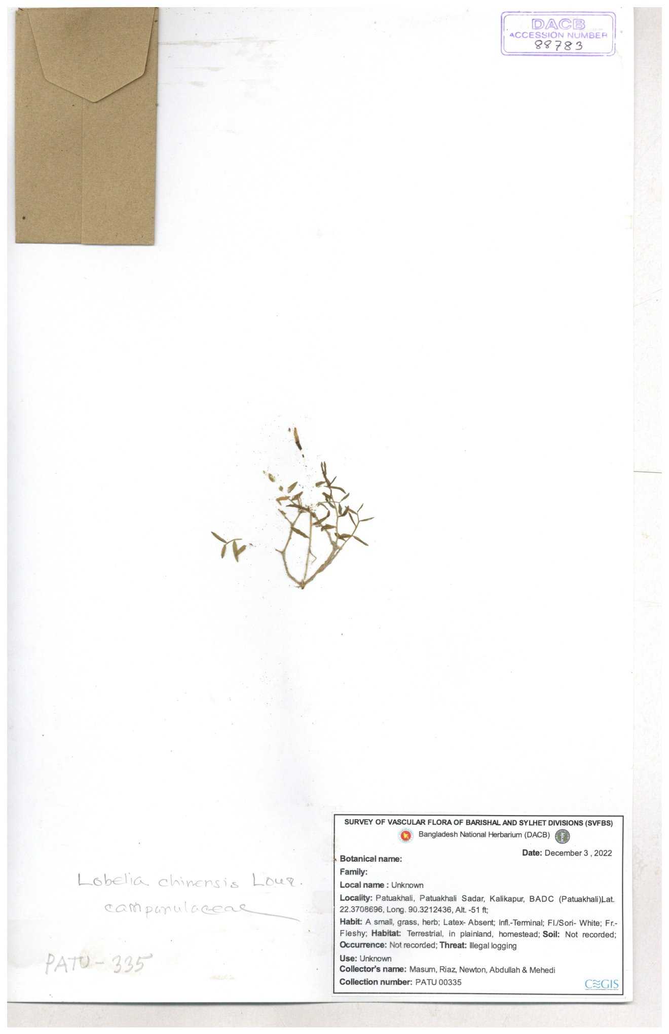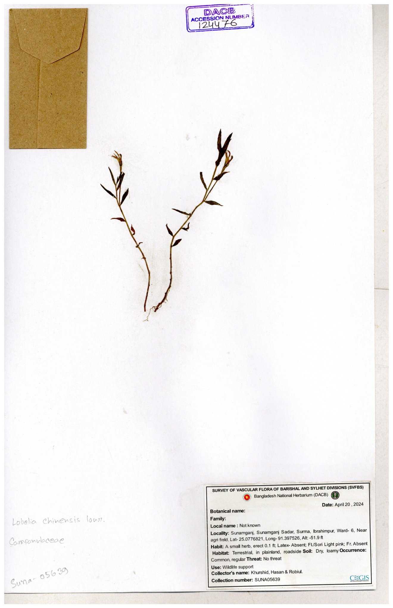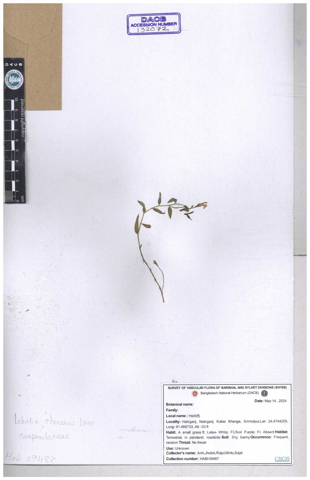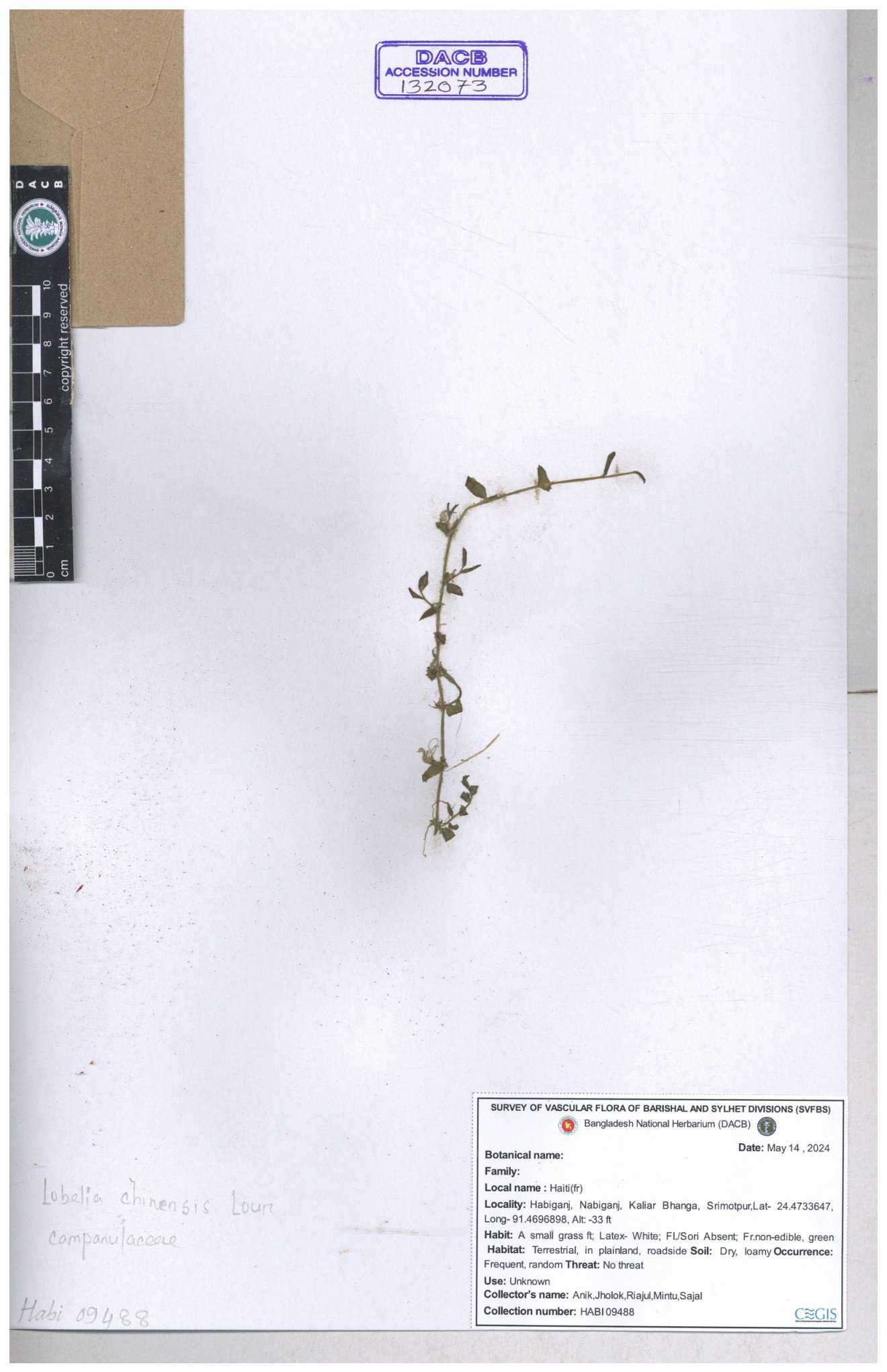 | 34040 | Campanulaceae | Lobelia chinensis Lour. | Sarder Nasir Uddin | N. 2814 17-08-2006 |
