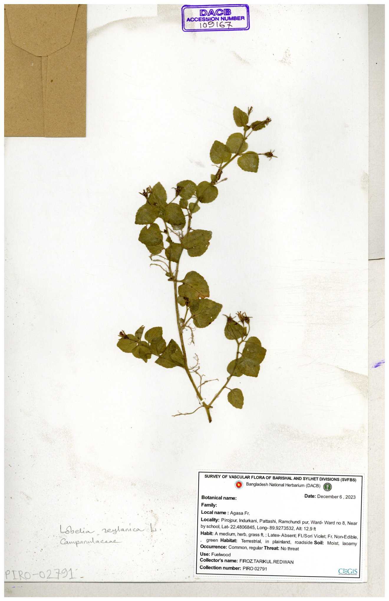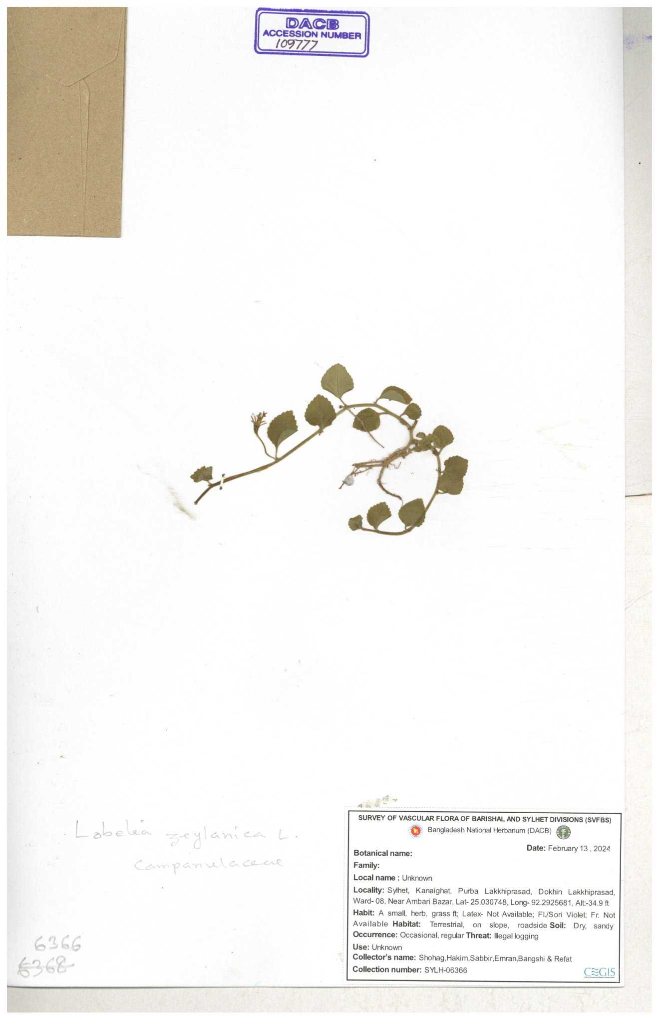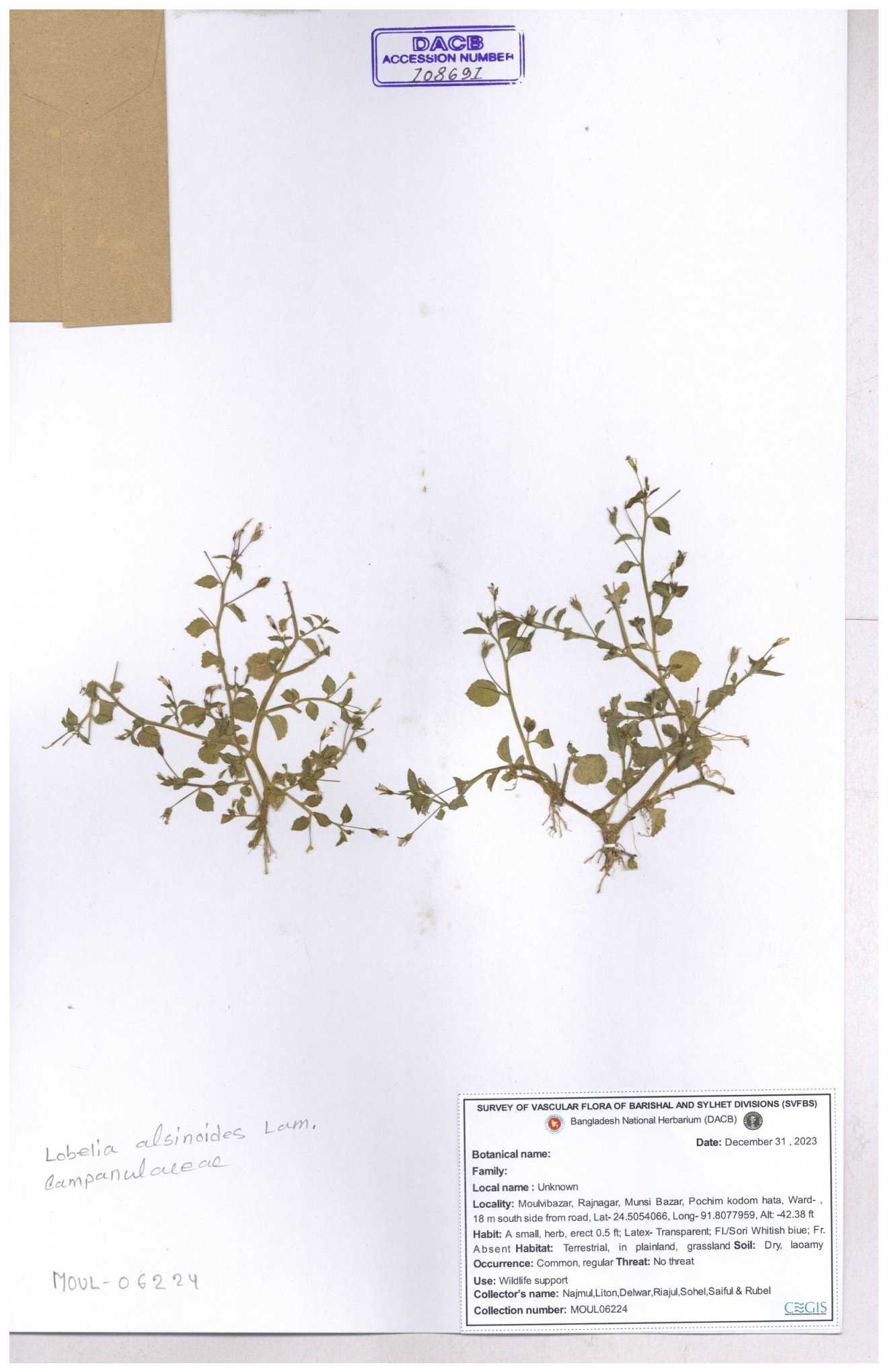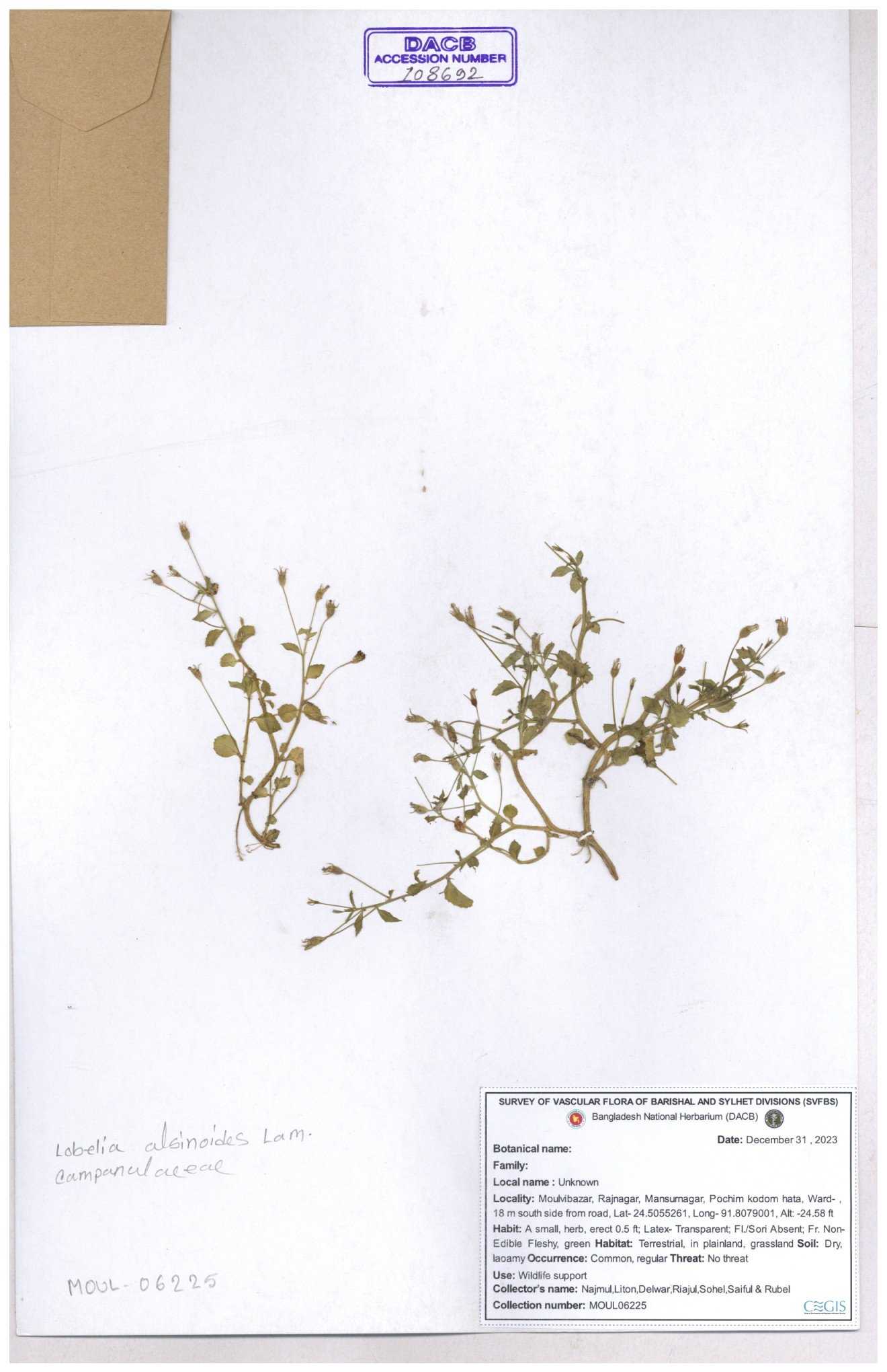 | 66979 | Campanulaceae | Lobelia zeylanica | Joyanta, Likhon & Kamrul | JCR-6946 13-11-2017 |
