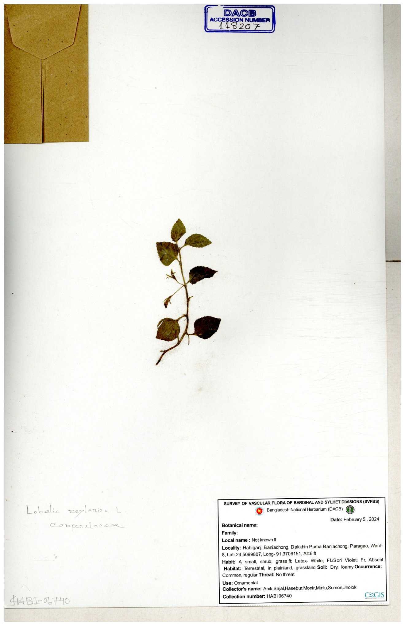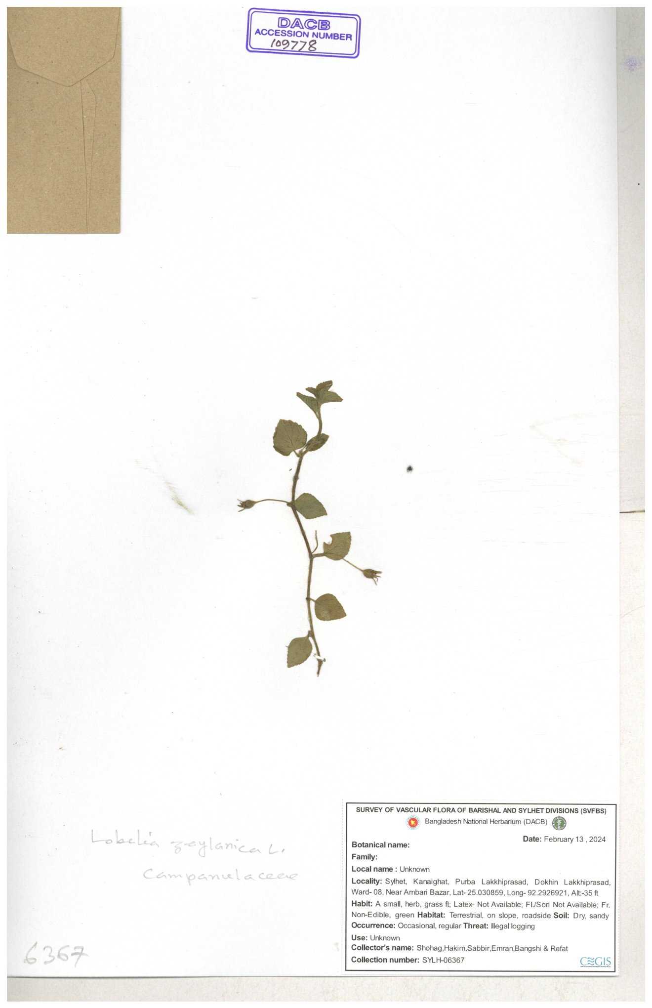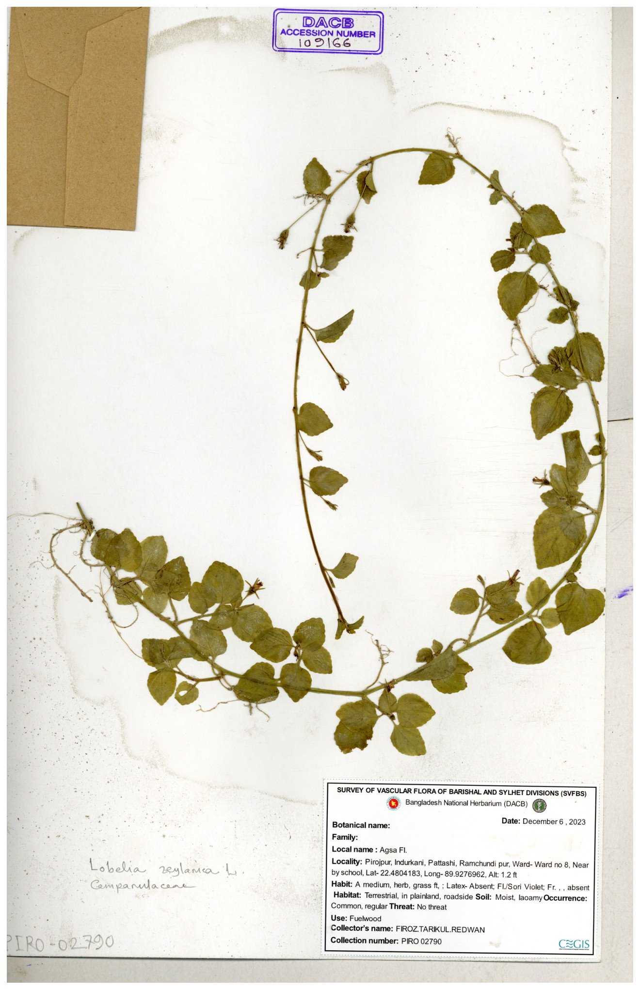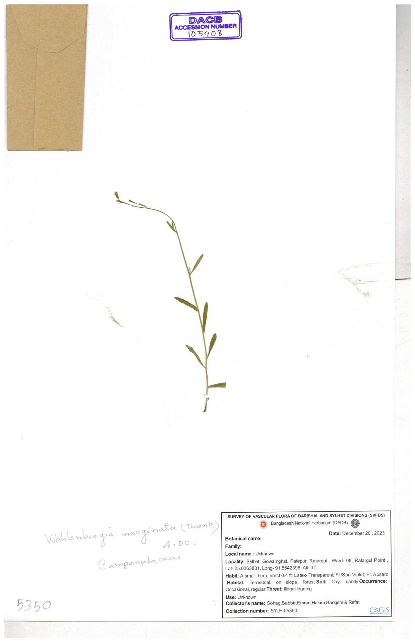 | 66979 | Campanulaceae | Lobelia zeylanica | Joyanta, Likhon & Kamrul | JCR-6946 13-11-2017 |