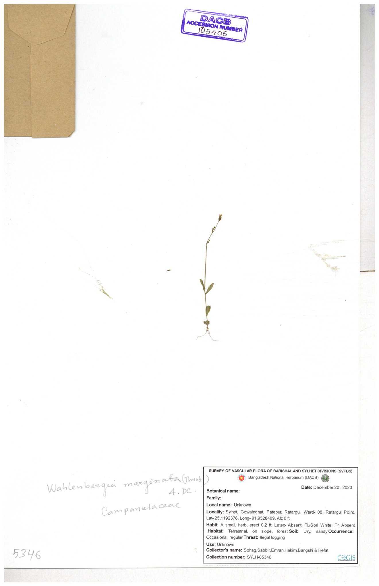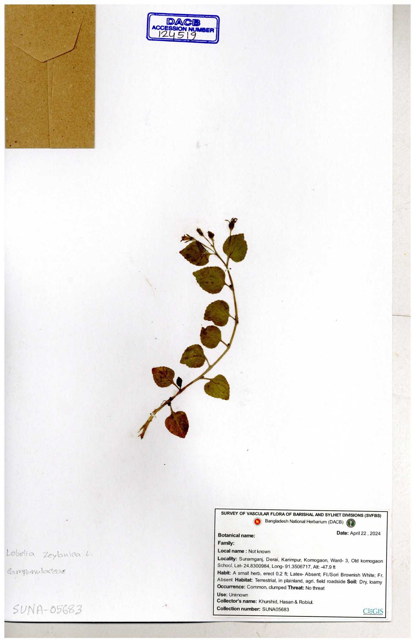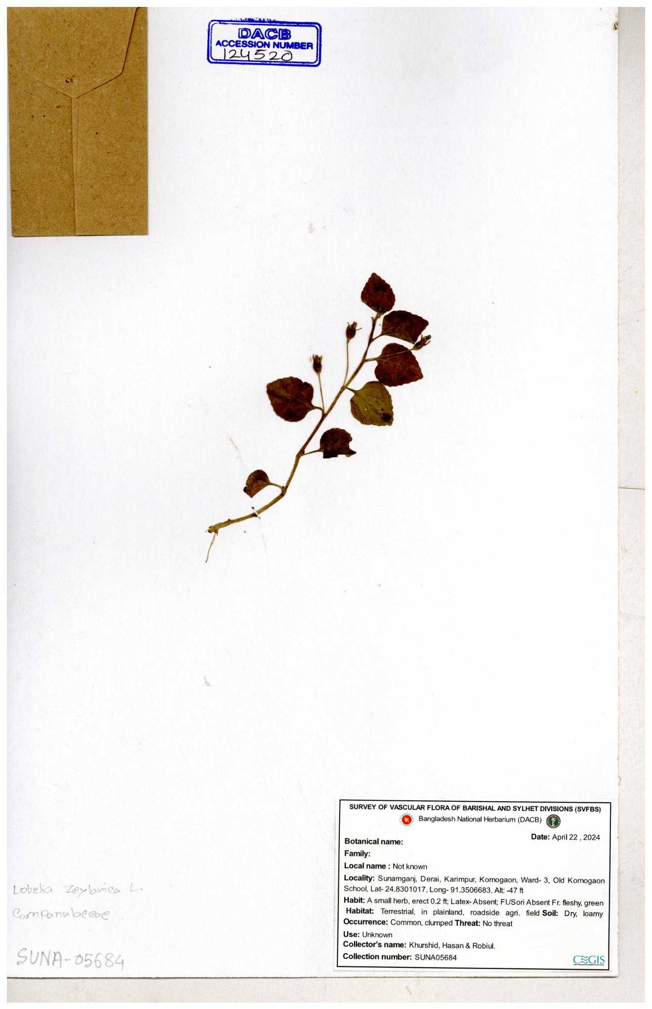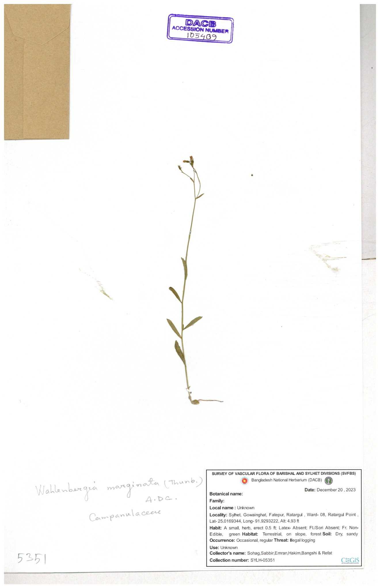 | 66979 | Campanulaceae | Lobelia zeylanica | Joyanta, Likhon & Kamrul | JCR-6946 13-11-2017 |