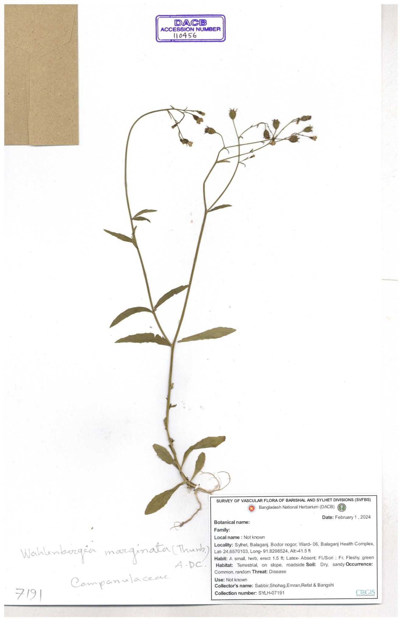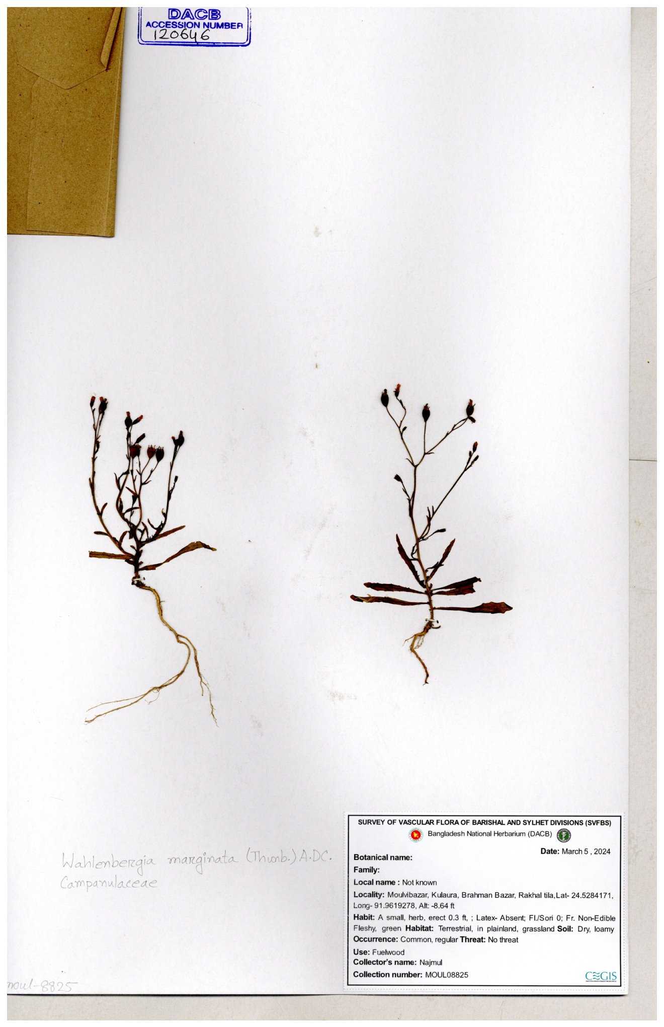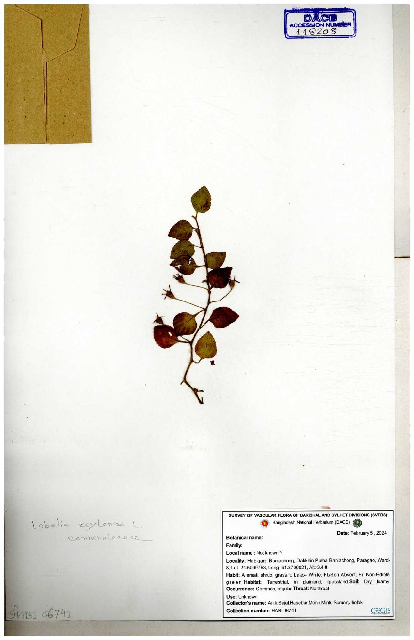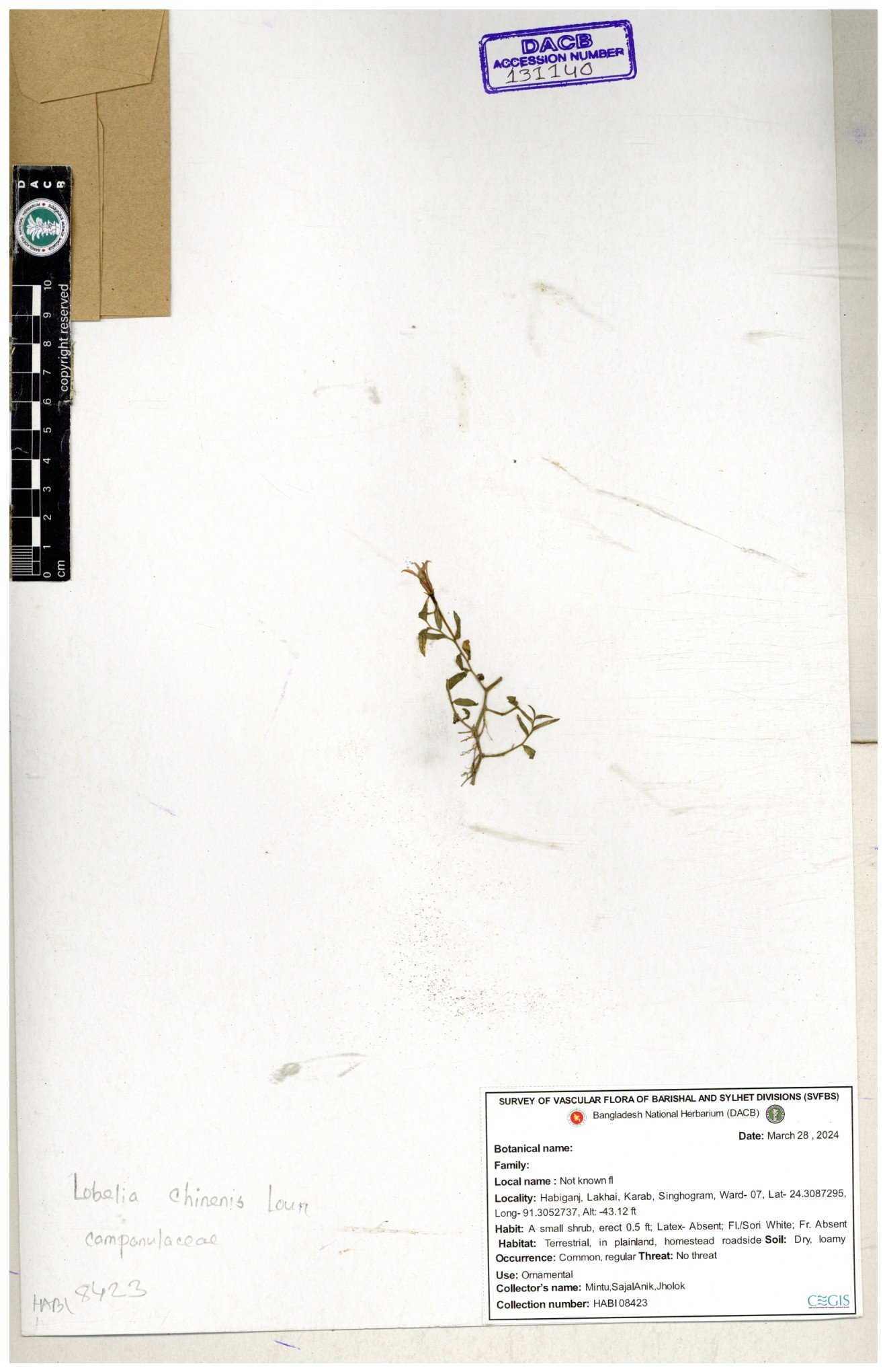 | 66979 | Campanulaceae | Lobelia zeylanica | Joyanta, Likhon & Kamrul | JCR-6946 13-11-2017 |
