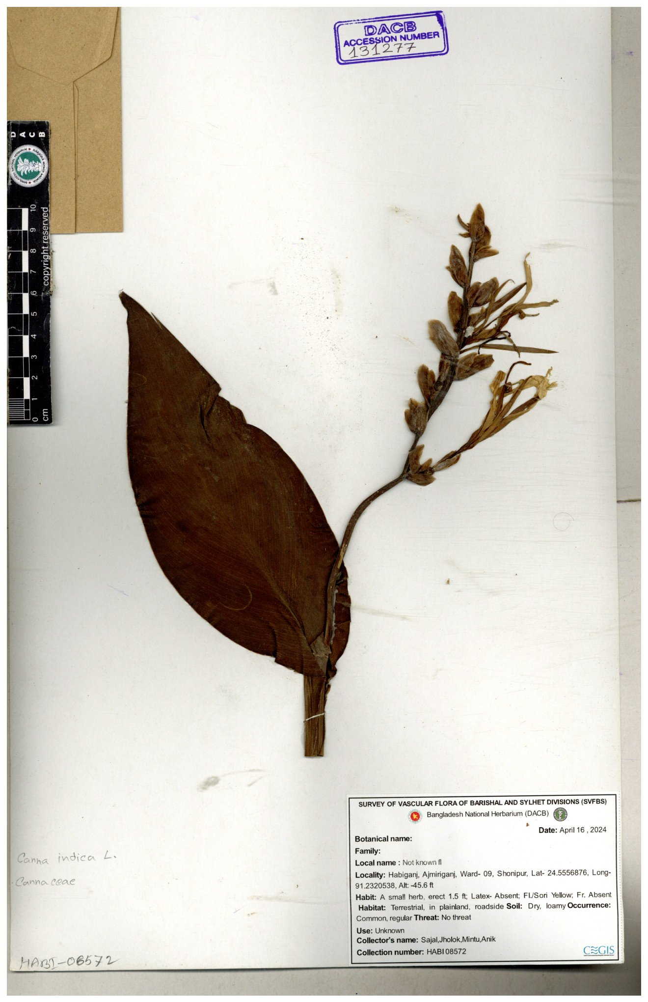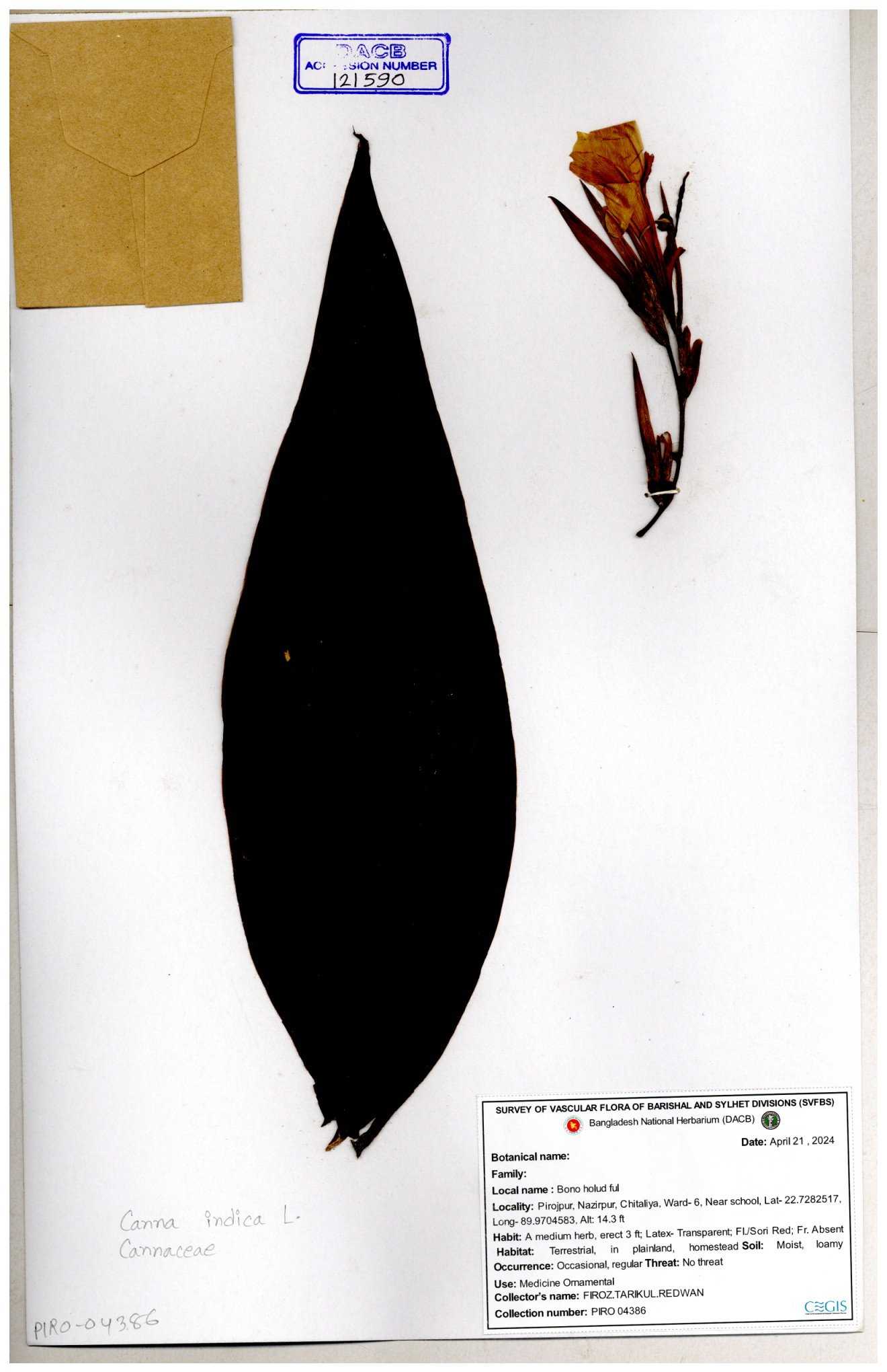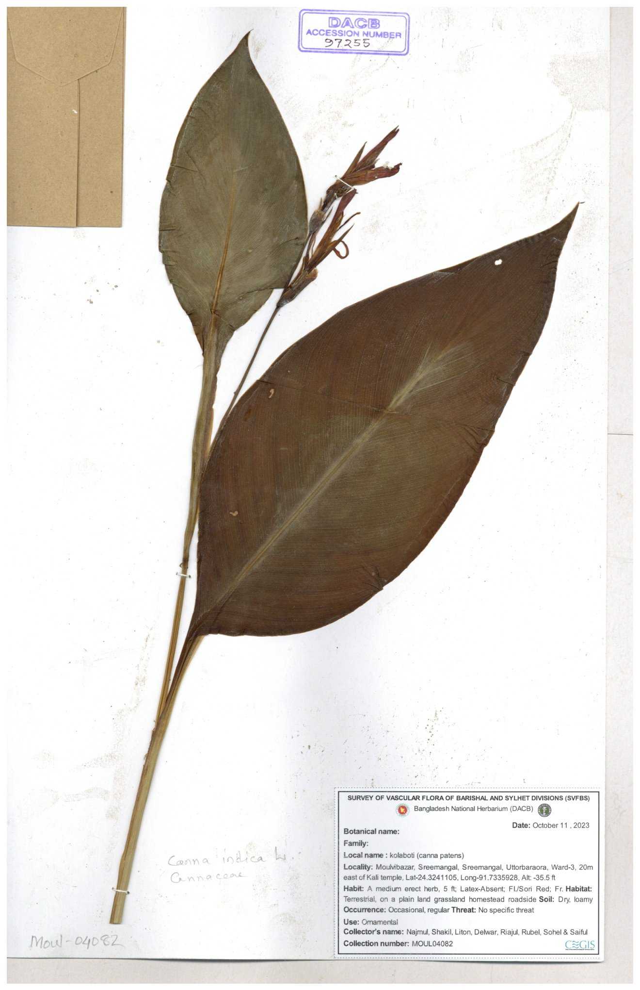 | 66976 | Cannaceae | Canna indica | Mominur Rahman, Al amin & Kamrul Islam | JCR-1017 10-10-2016 |