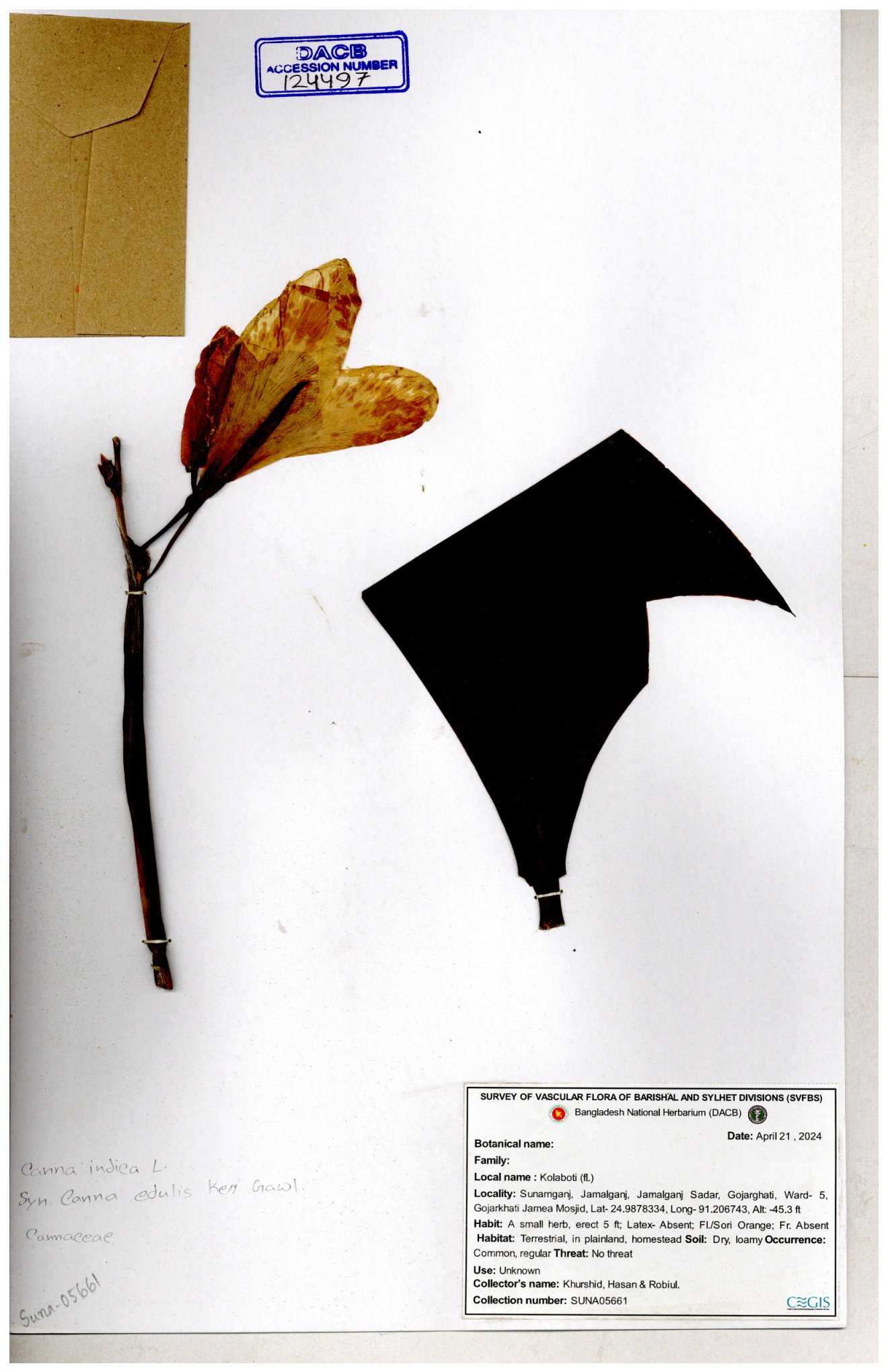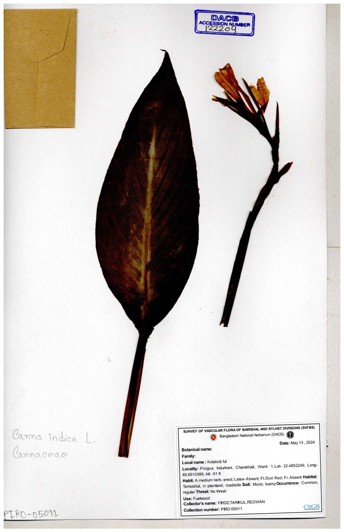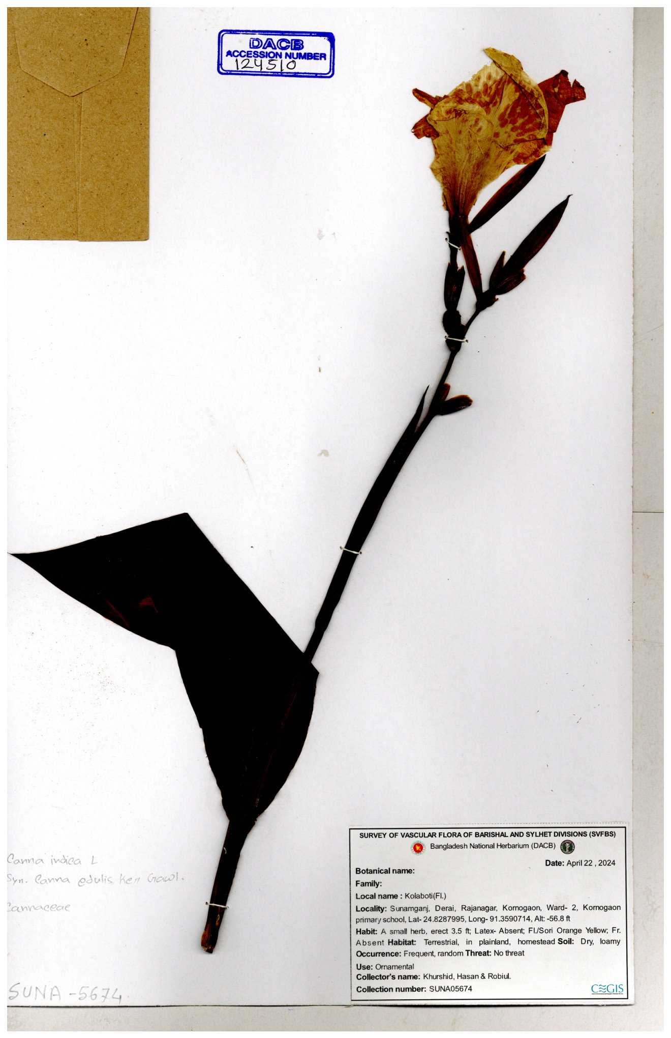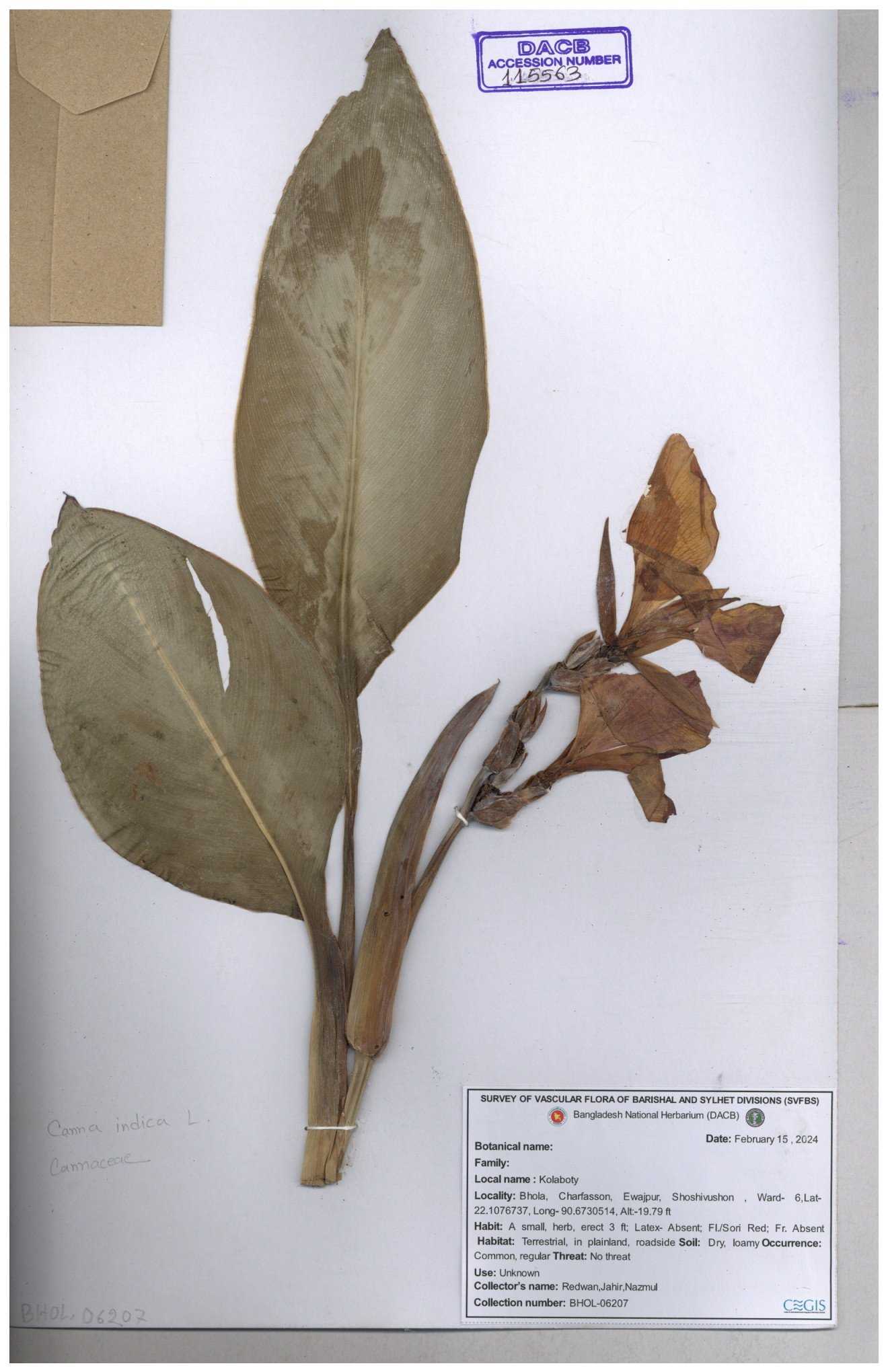 | 66976 | Cannaceae | Canna indica | Mominur Rahman, Al amin & Kamrul Islam | JCR-1017 10-10-2016 |