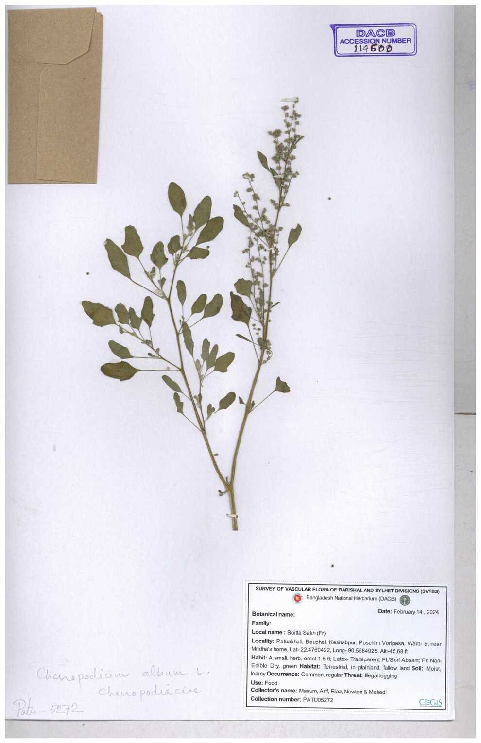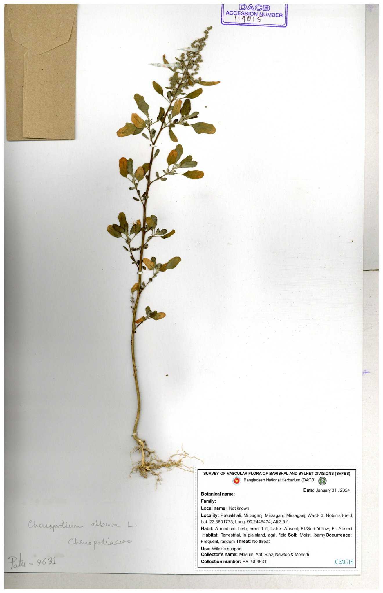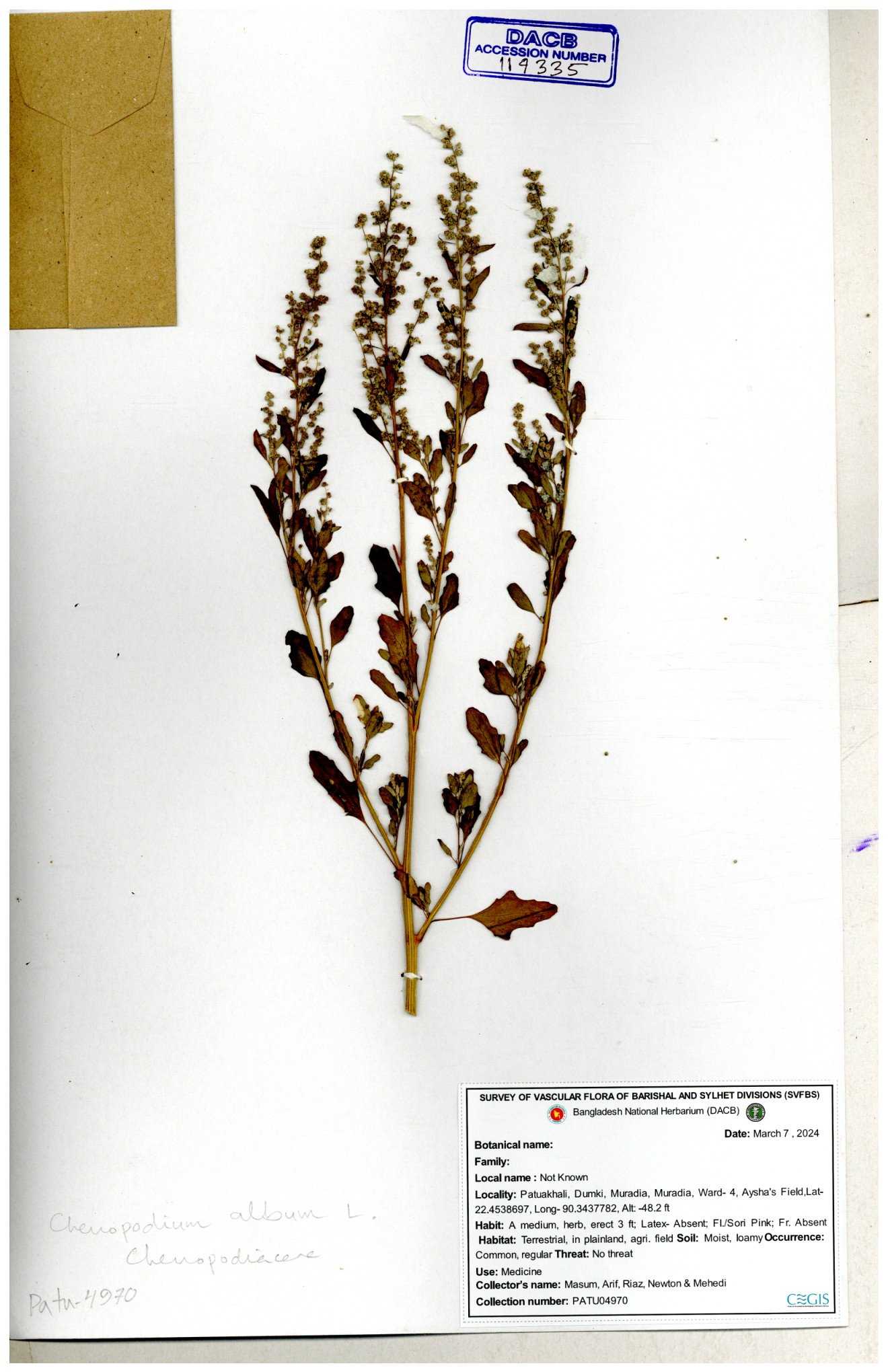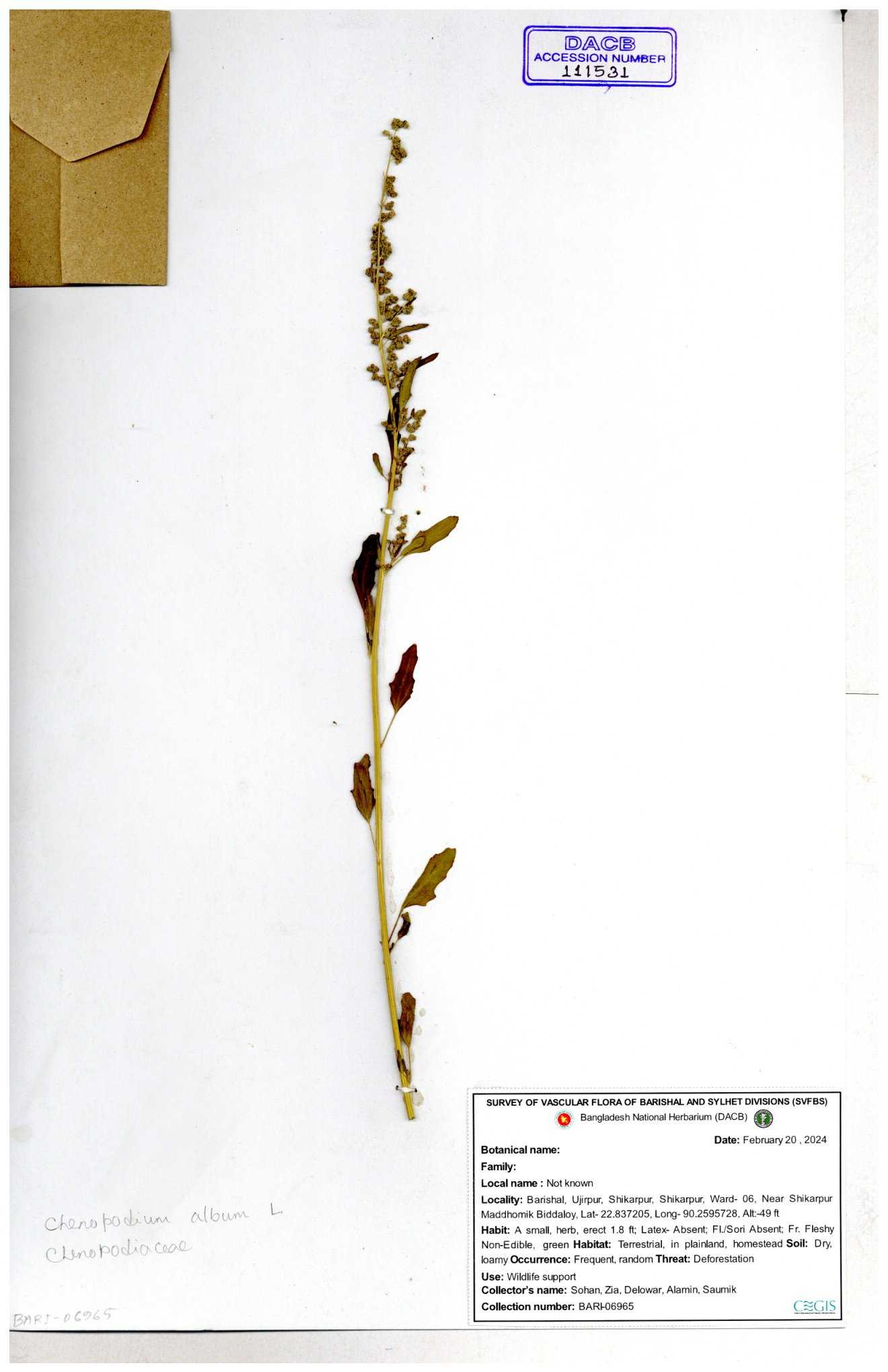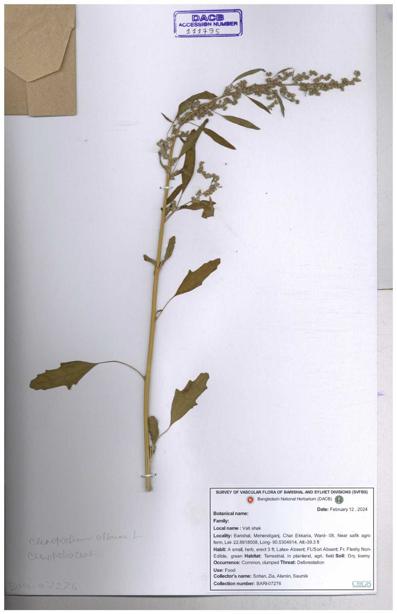 | 88156 | Chenopodiaceae | Chenopodium album (L.) | Dr. M. Sultana | DMS-3580 23-03-2021 |