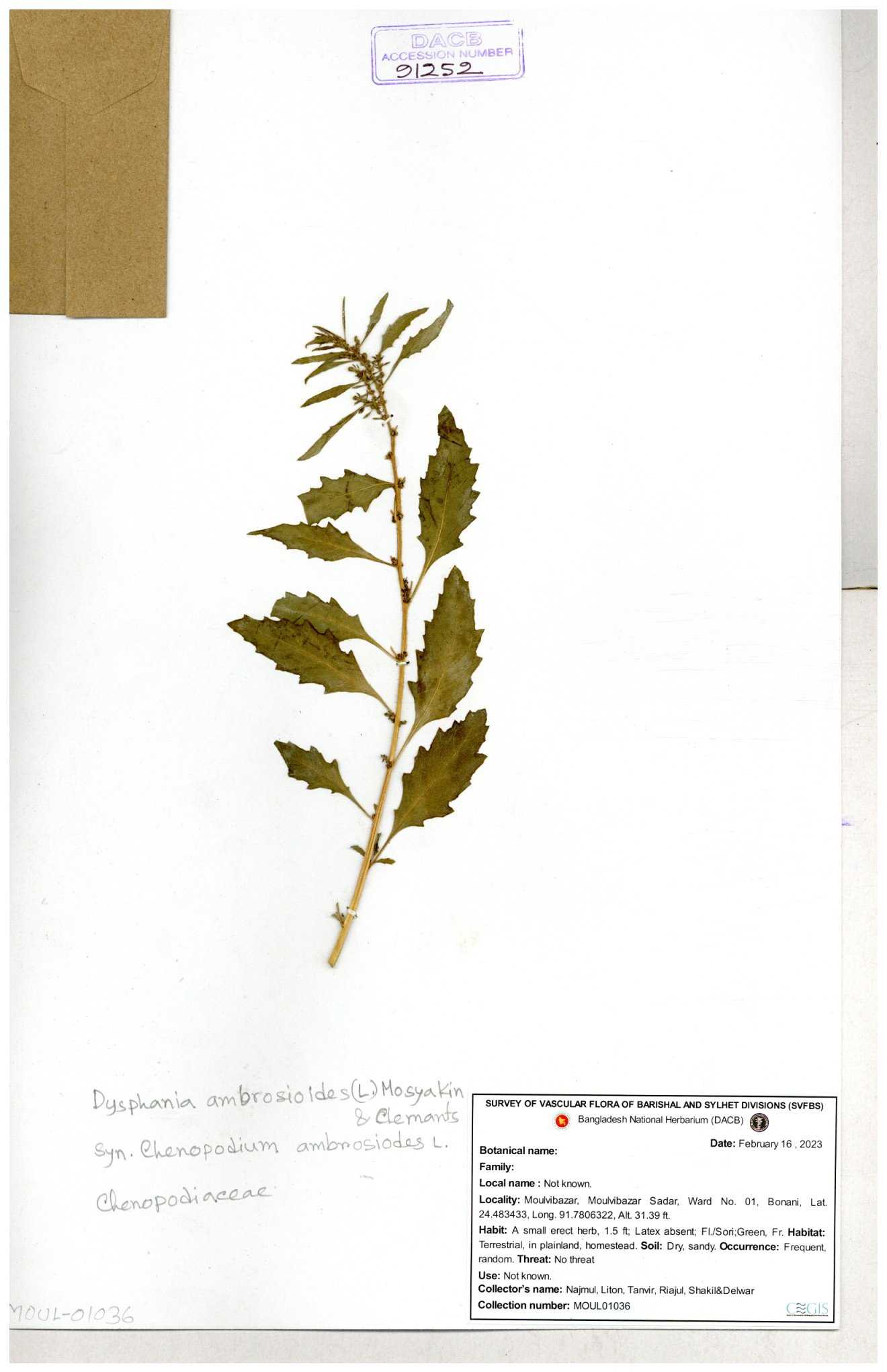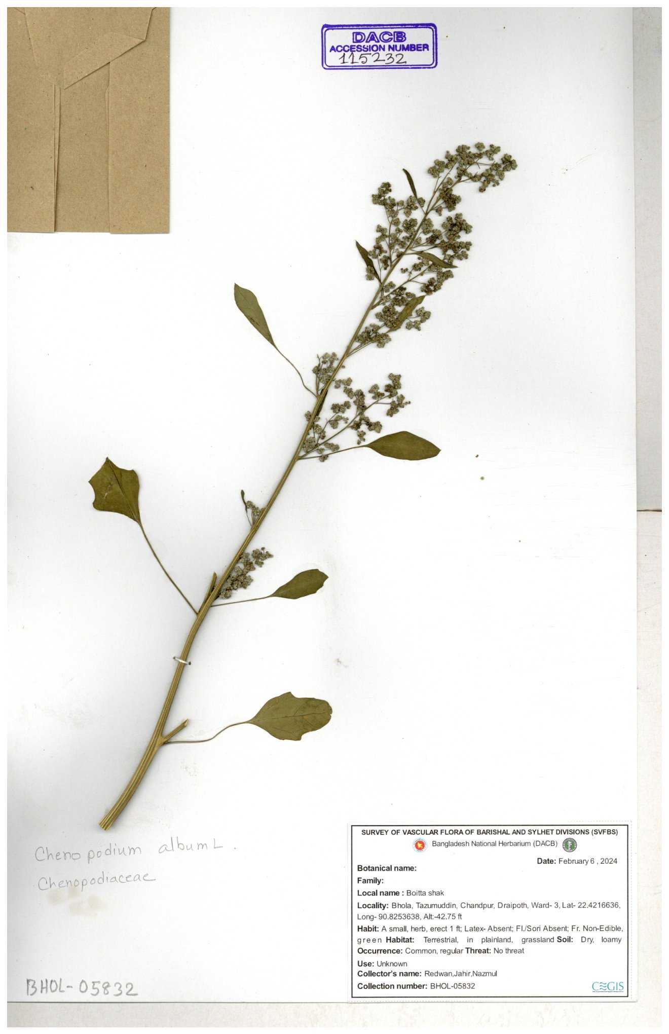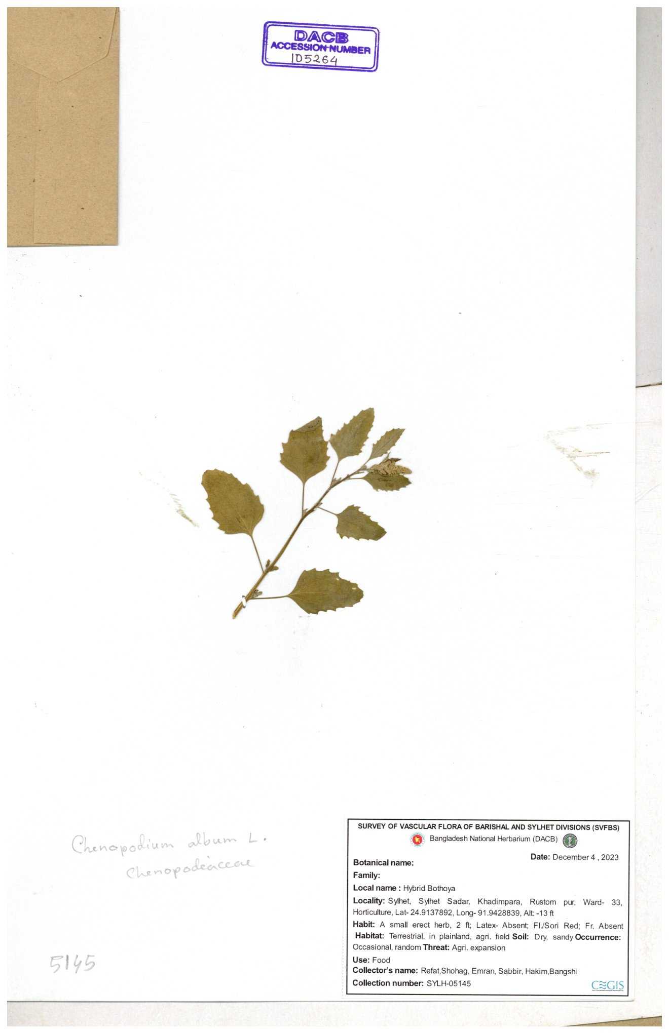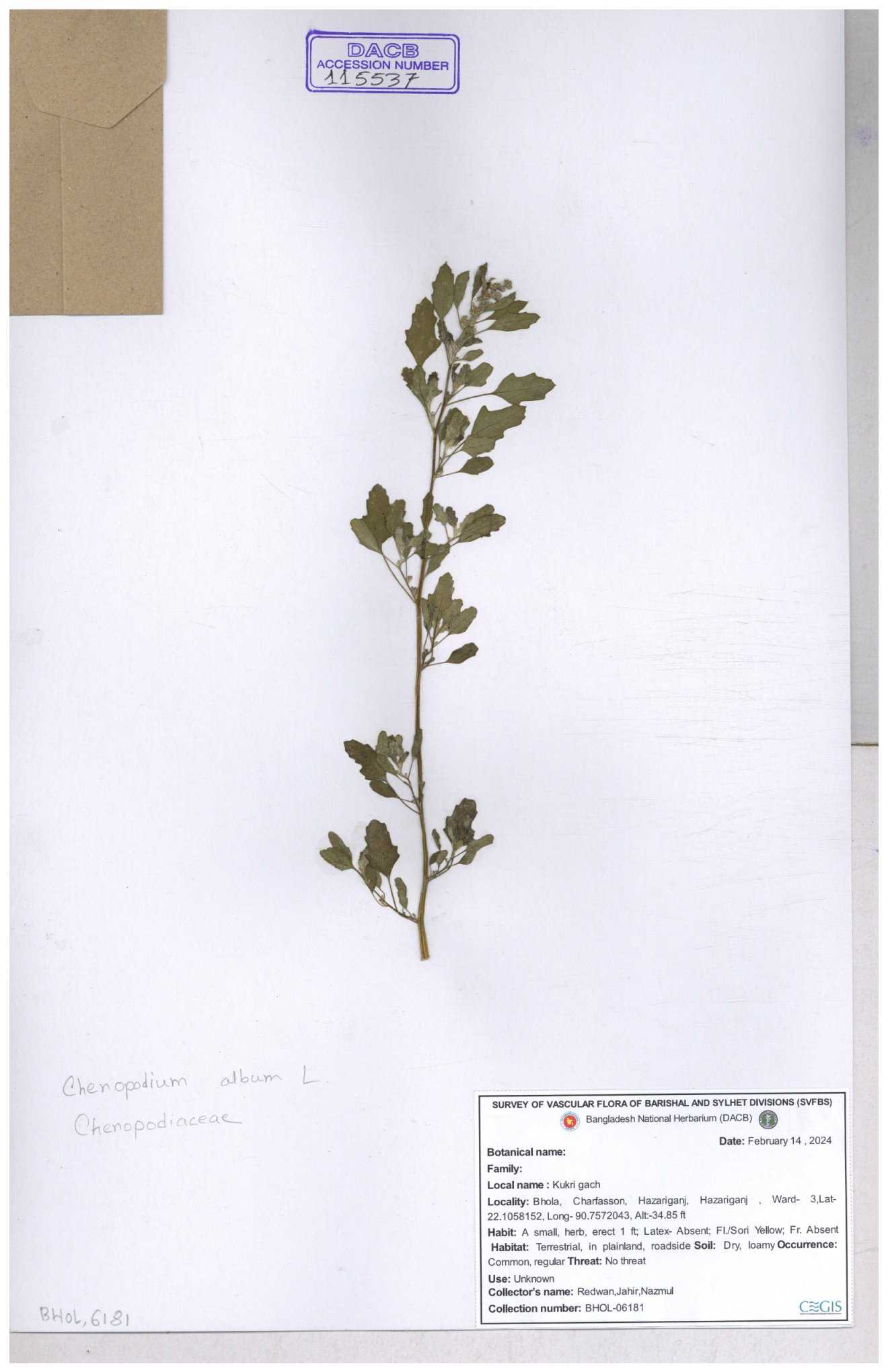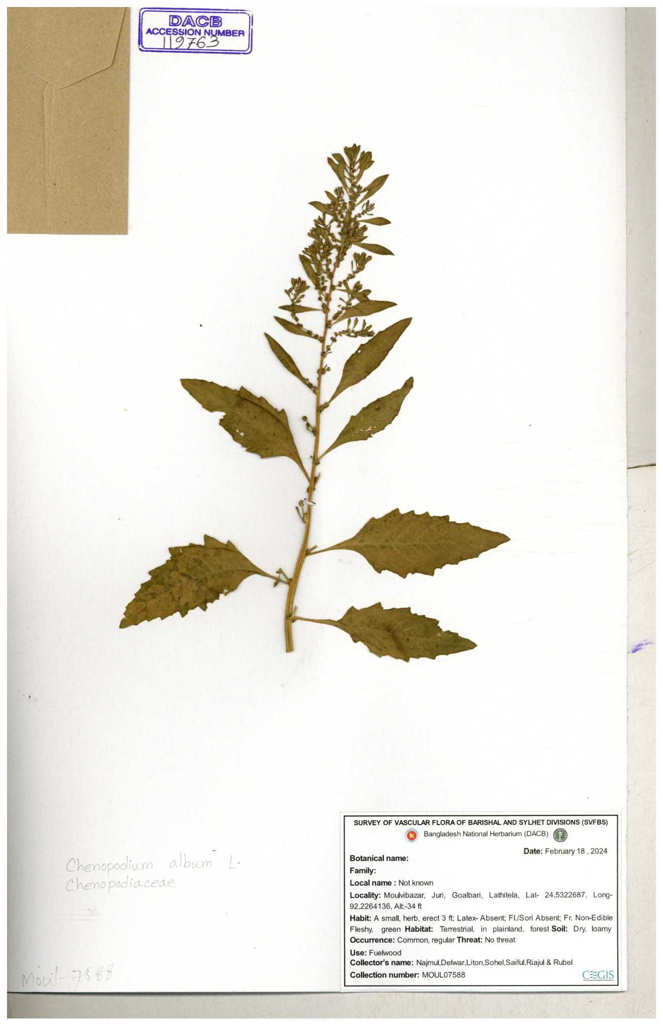 | 88156 | Chenopodiaceae | Chenopodium album (L.) | Dr. M. Sultana | DMS-3580 23-03-2021 |
