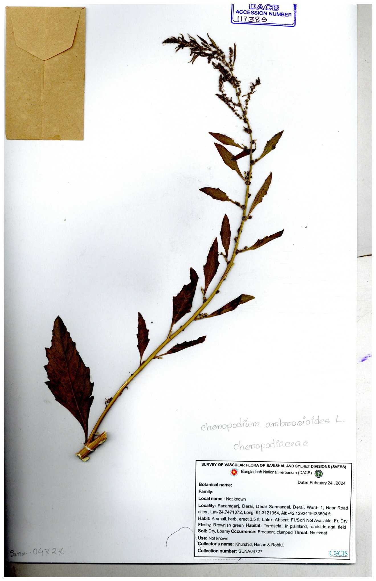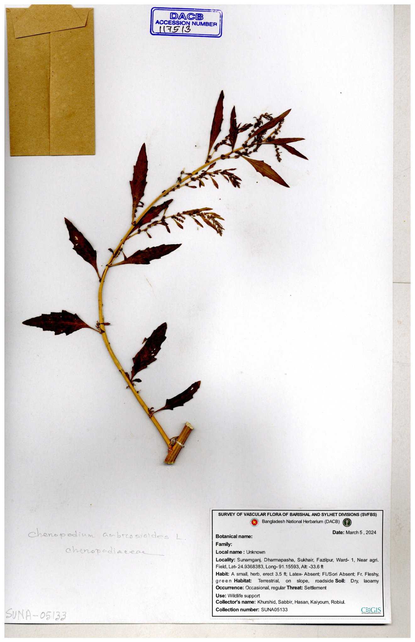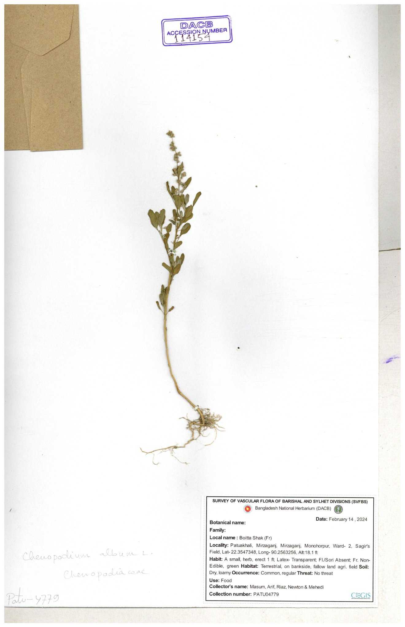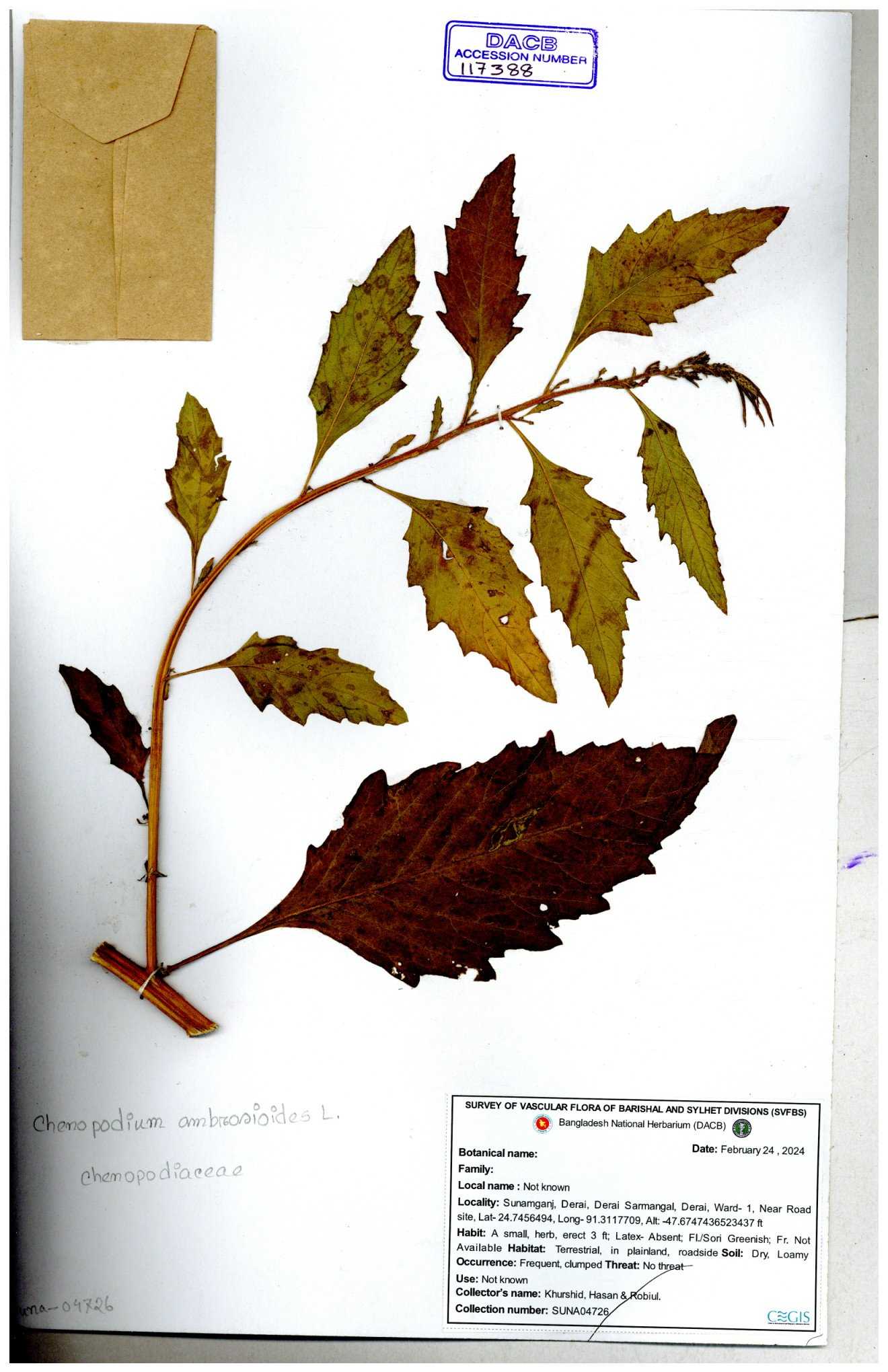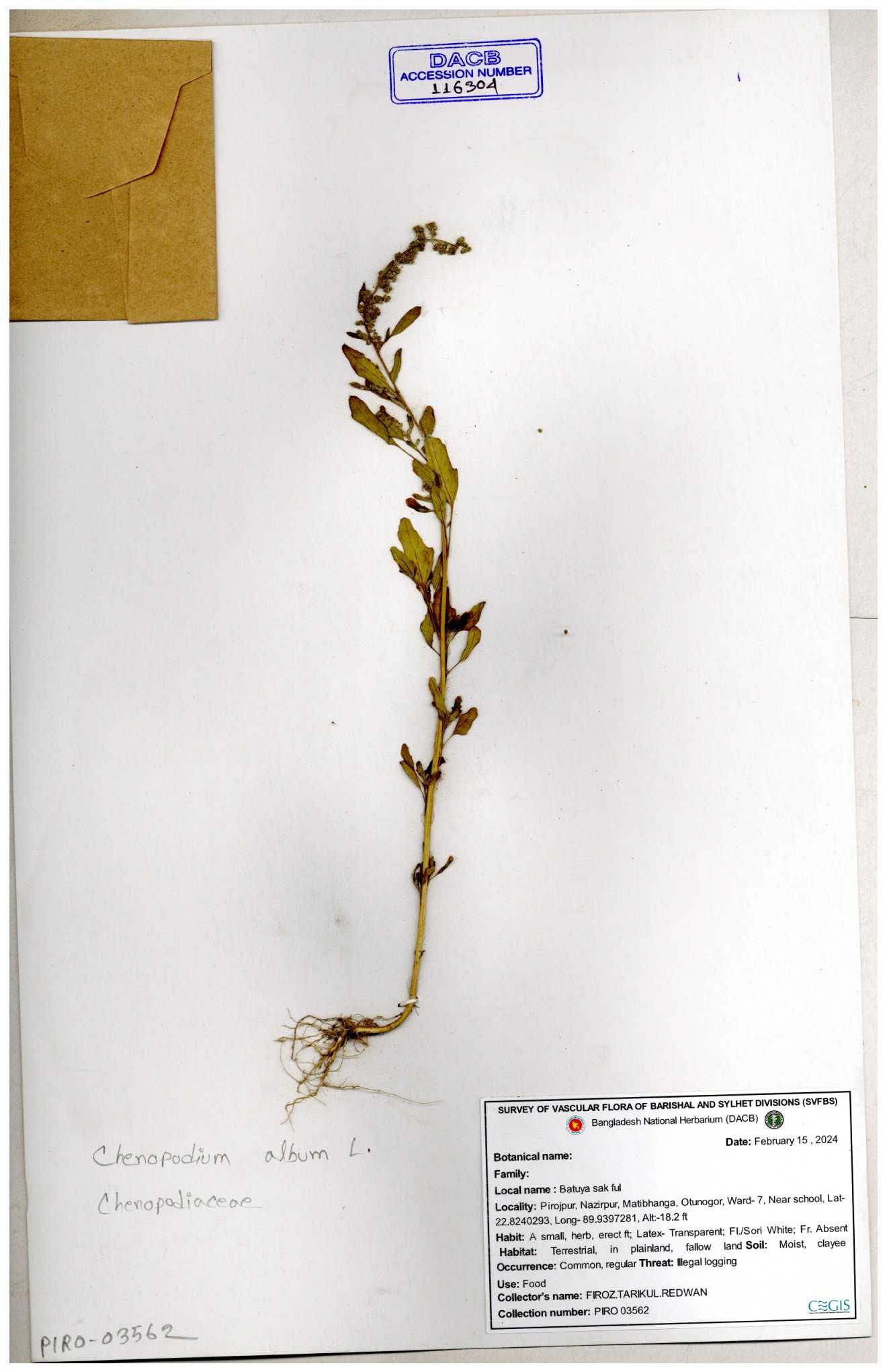 | 88156 | Chenopodiaceae | Chenopodium album (L.) | Dr. M. Sultana | DMS-3580 23-03-2021 |