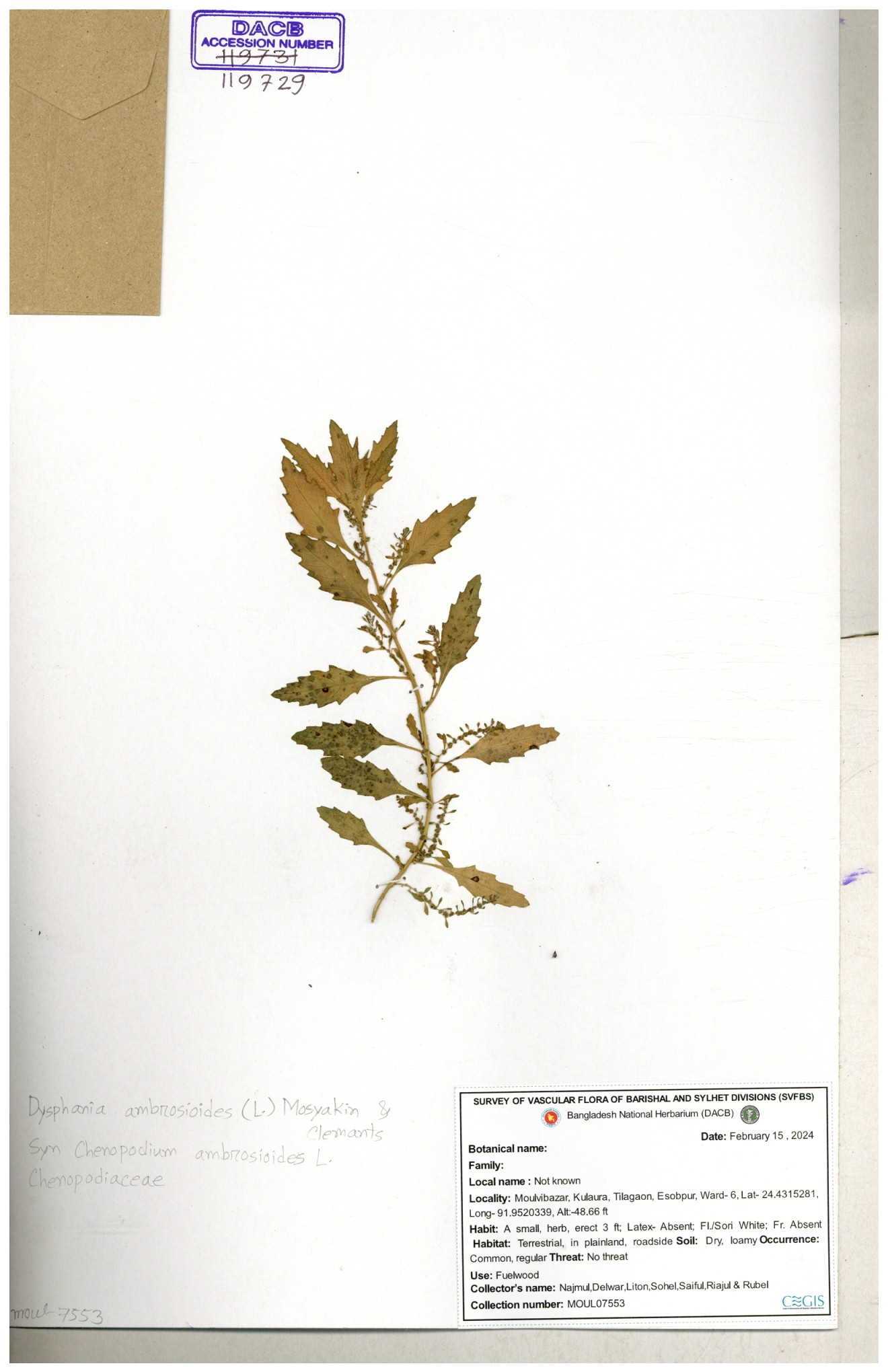 | 119729 | Chenopodiaceae | Dysphania ambrosioides | 30-11--0001 |