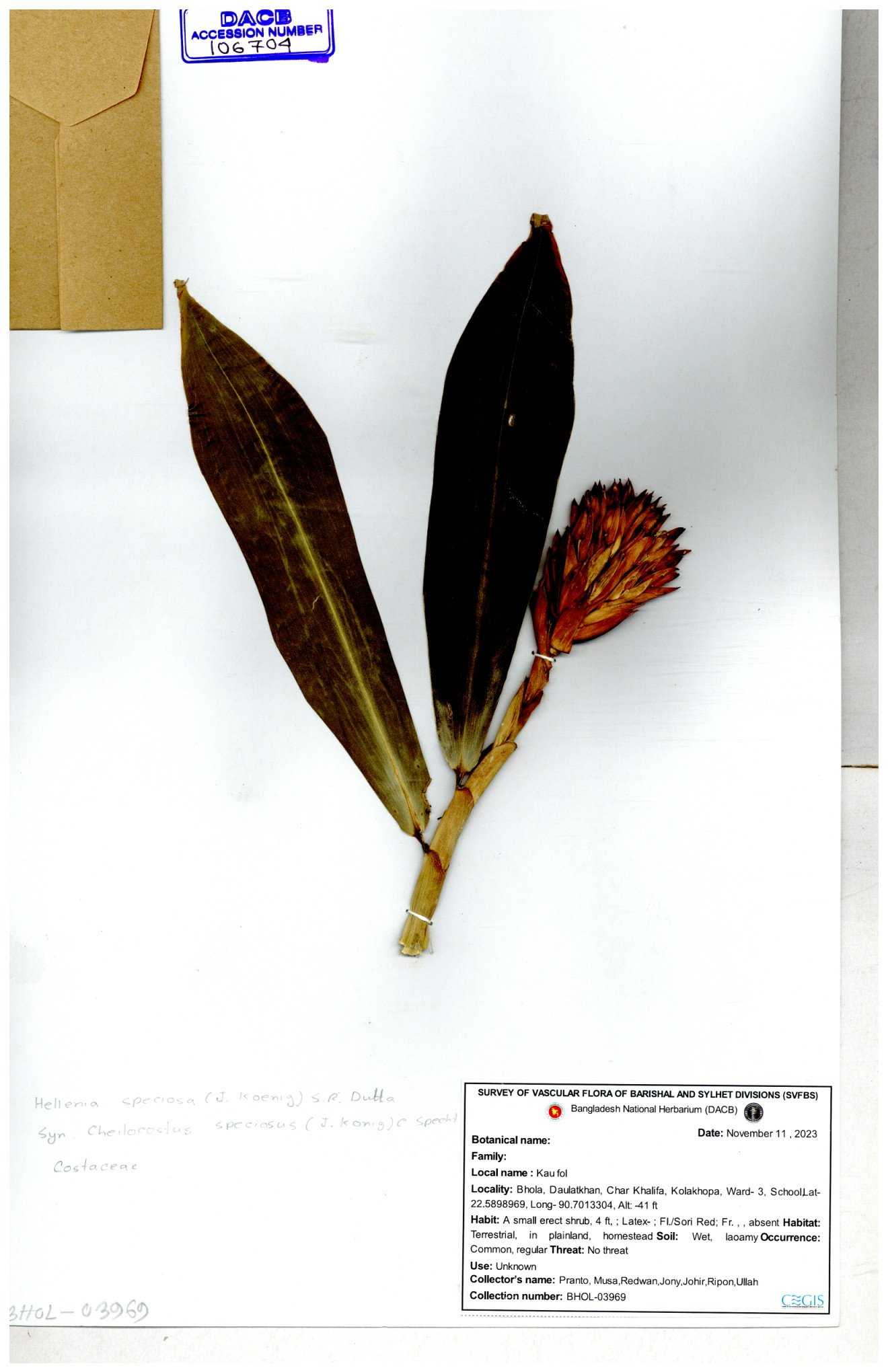 | 65223 | Costaceae | Costus speciosus (J.Koenig) Sm. | Joyanta, Mominur, Al amin, Kamrul & Suborno | JCR-2111 13-01-2017 |