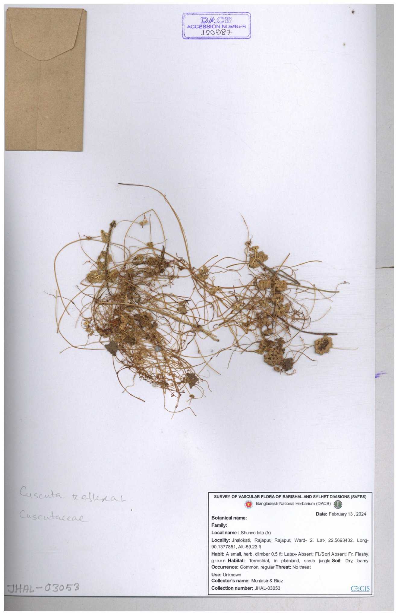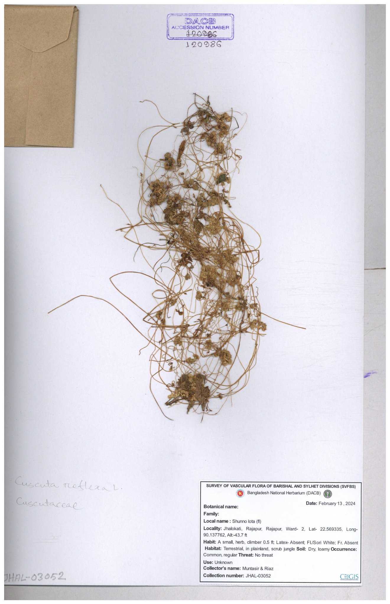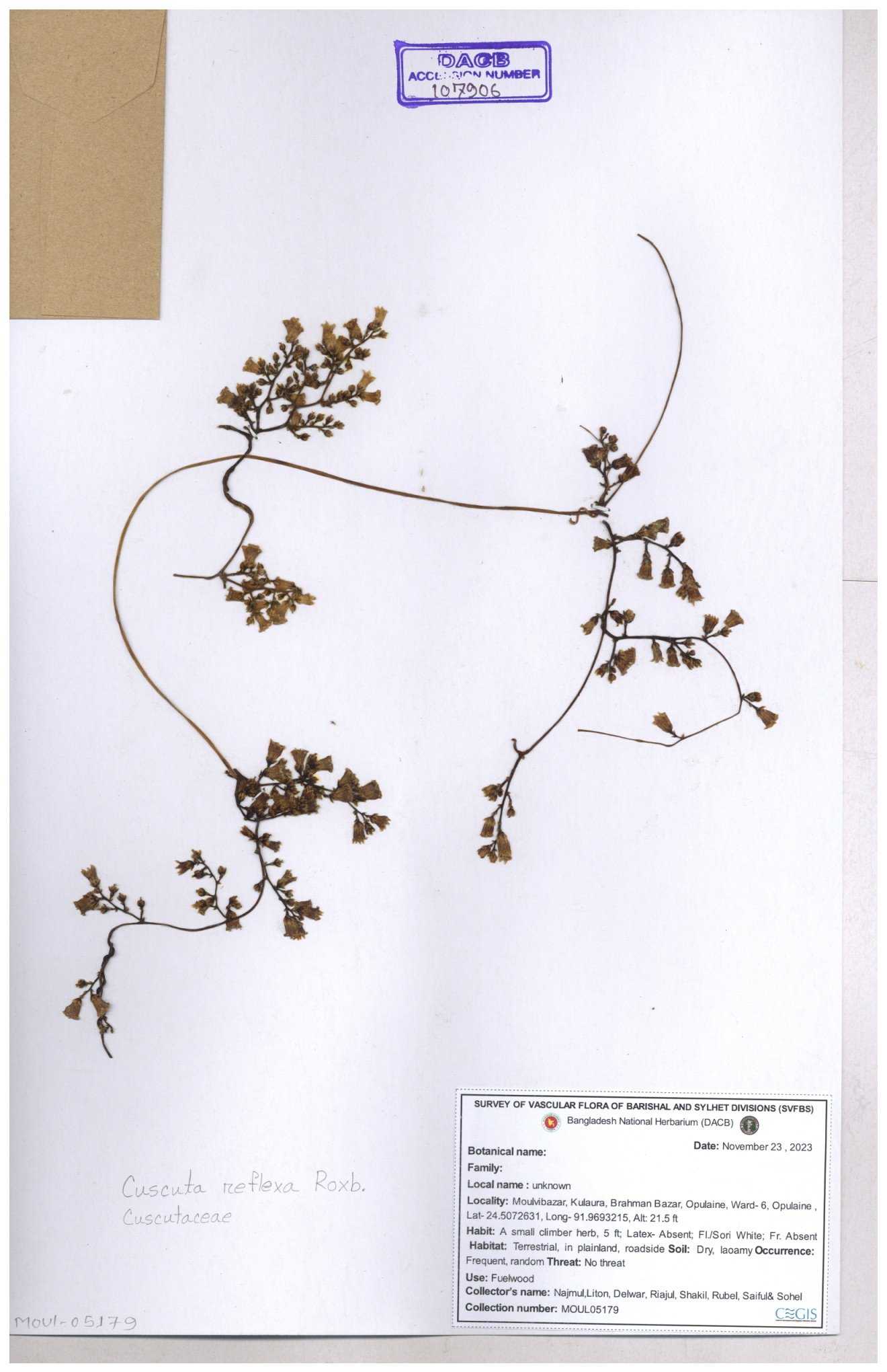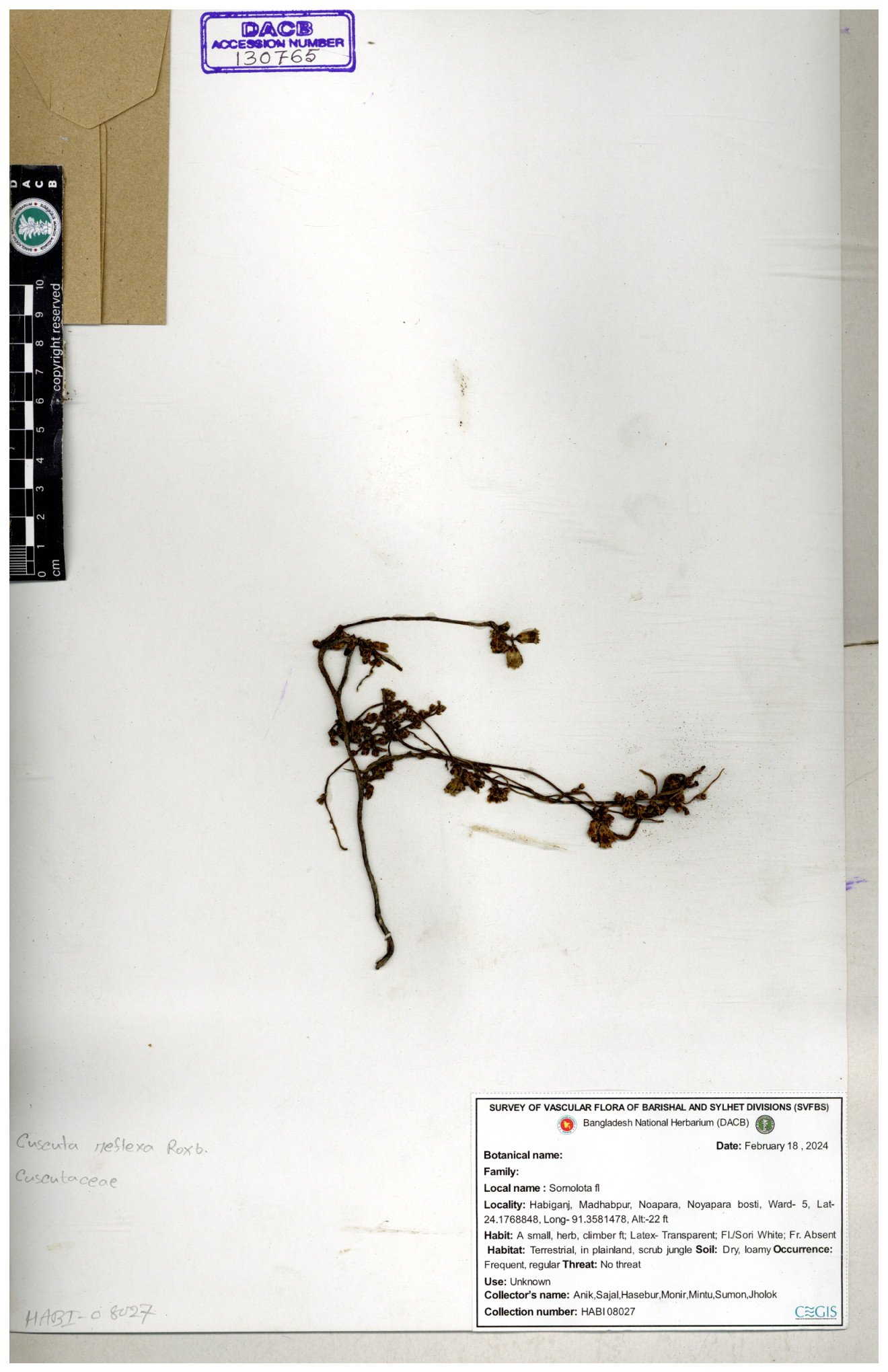 | 65796 | Cuscutaceae | Cuscuta reflexa Roxb. | Unknown | Naimur Rahman | NR- 1419 02-12-2020 |