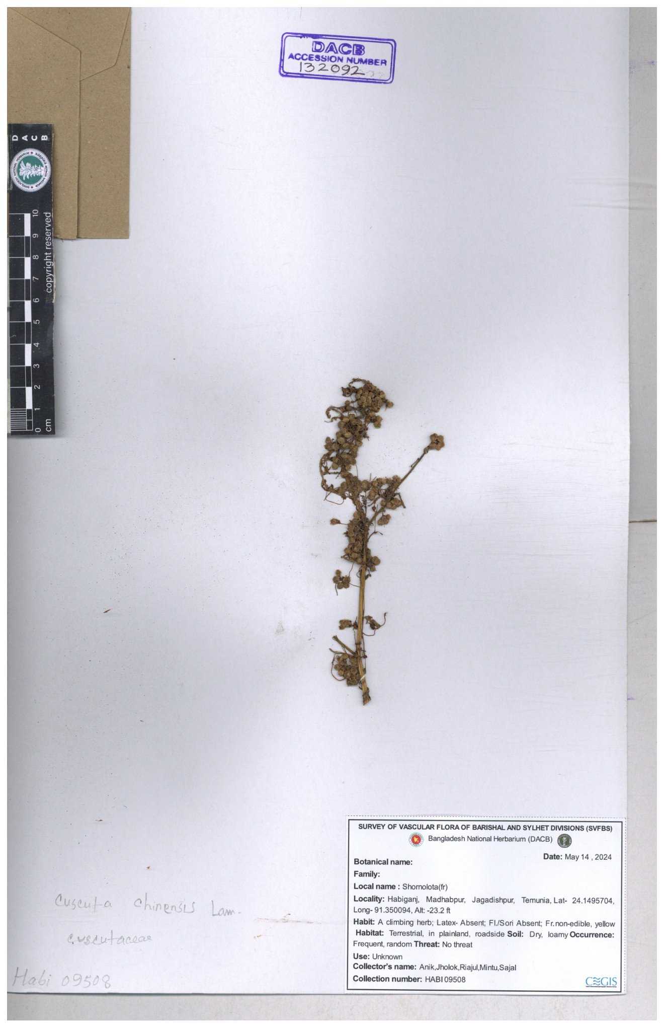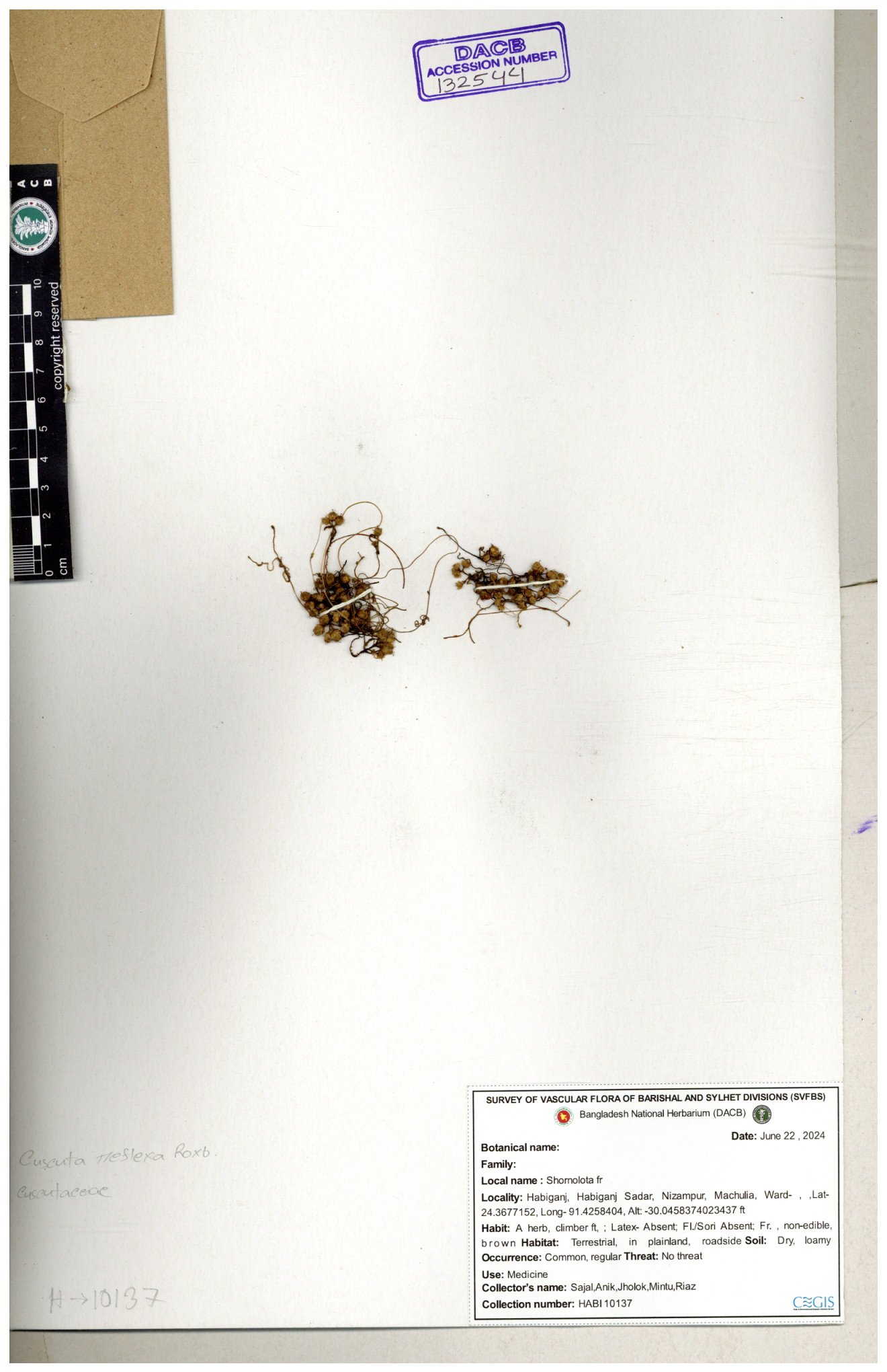 | 18009 | Cuscutaceae | Cuscuta chittagongensis | 30-11--0001 |