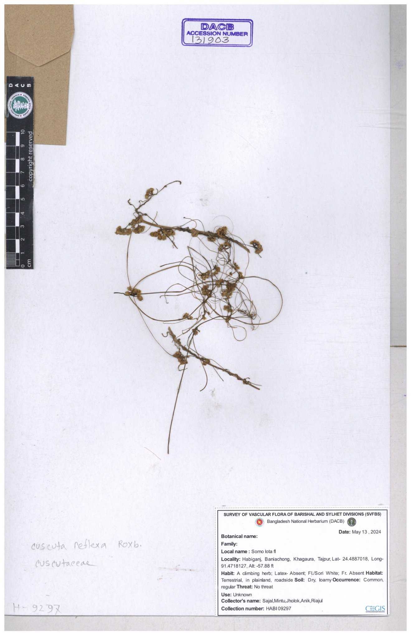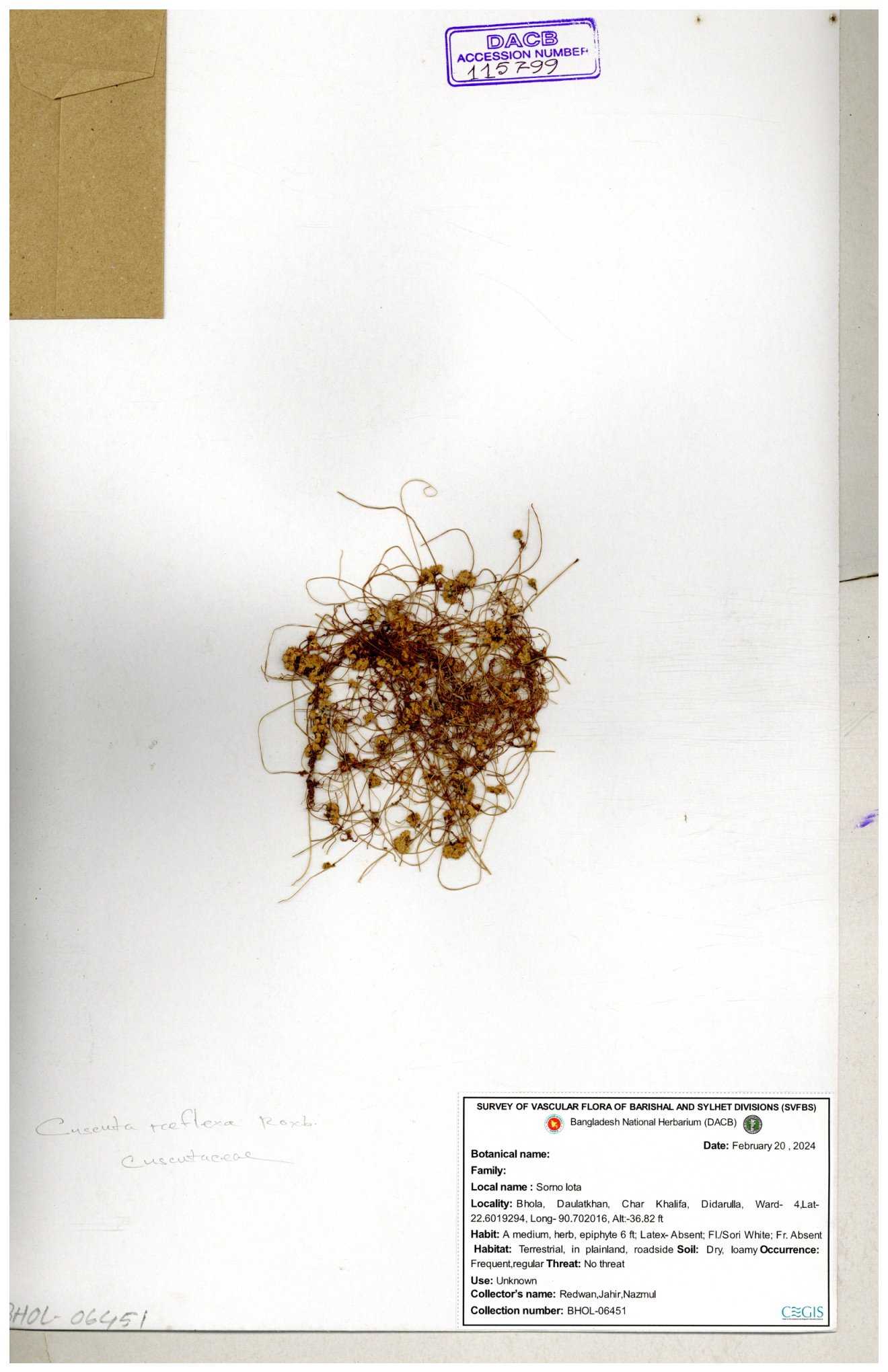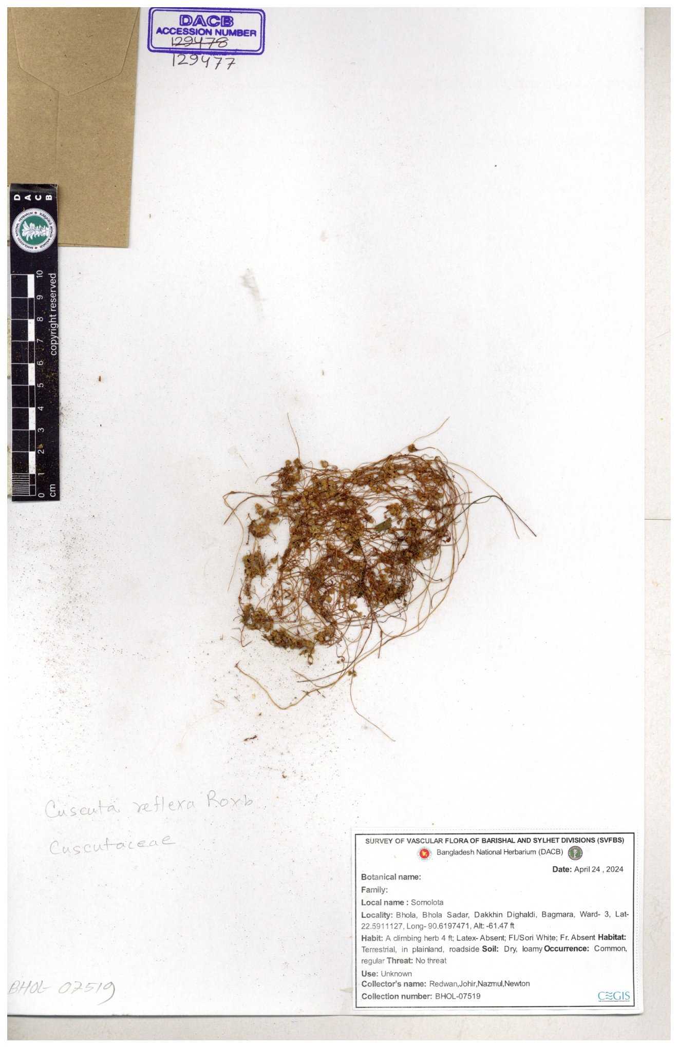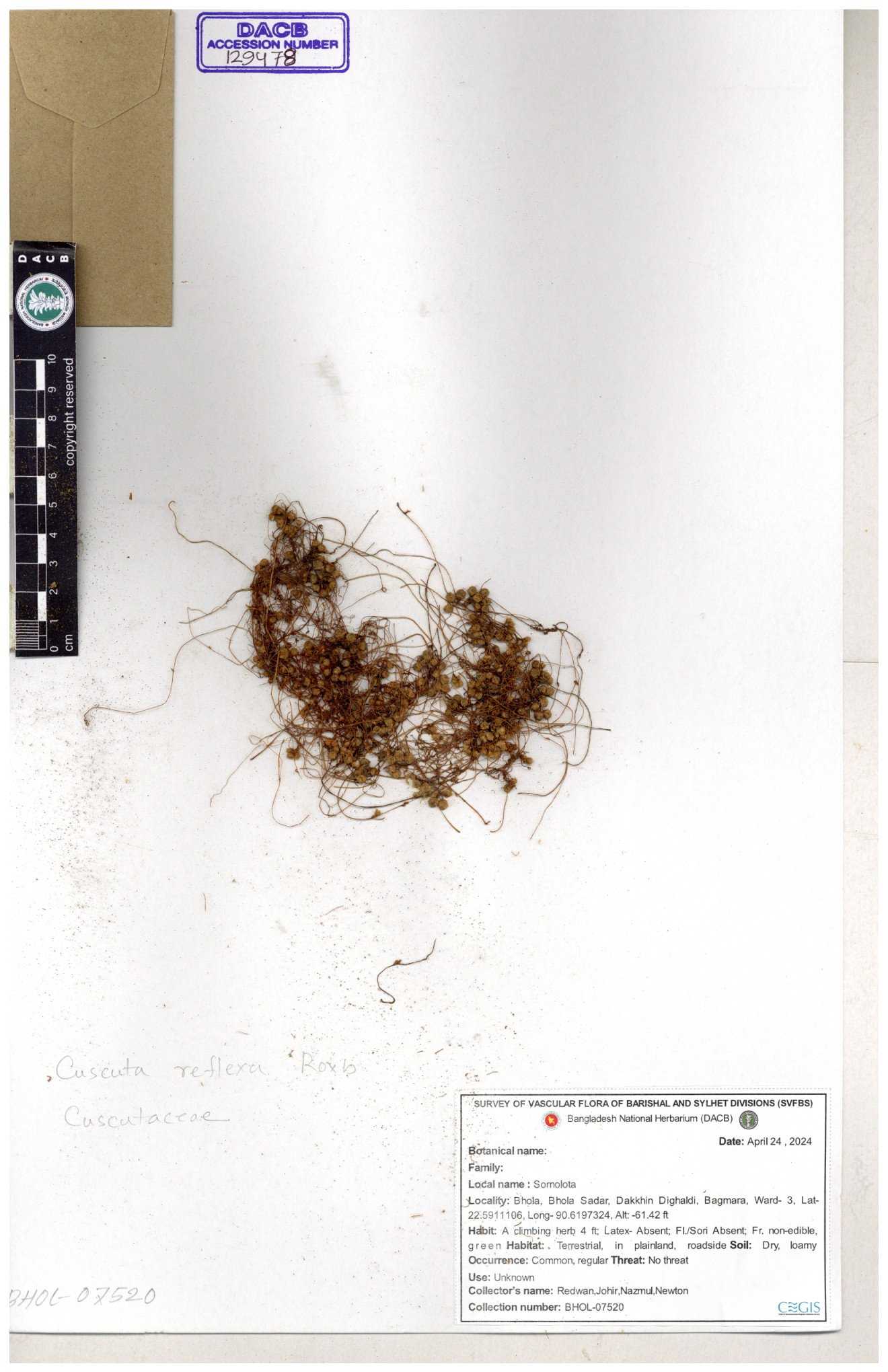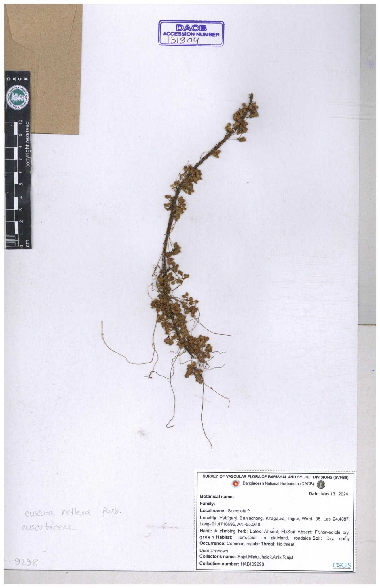 | 65989 | Cuscutaceae | Cuscuta reflexa Roxb. | Khandakar Kamrul Islam | KKI-4078 12-03-2020 |