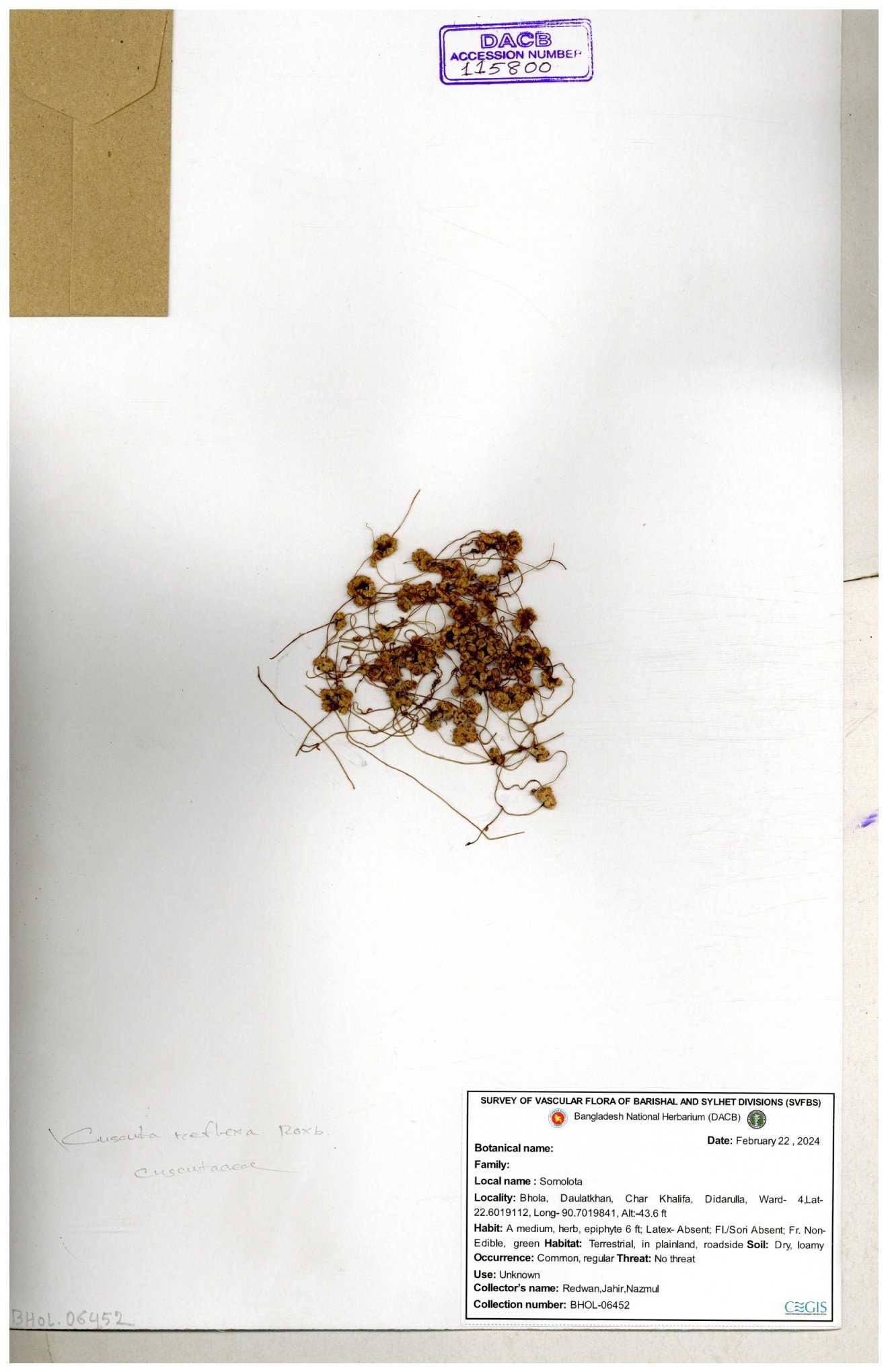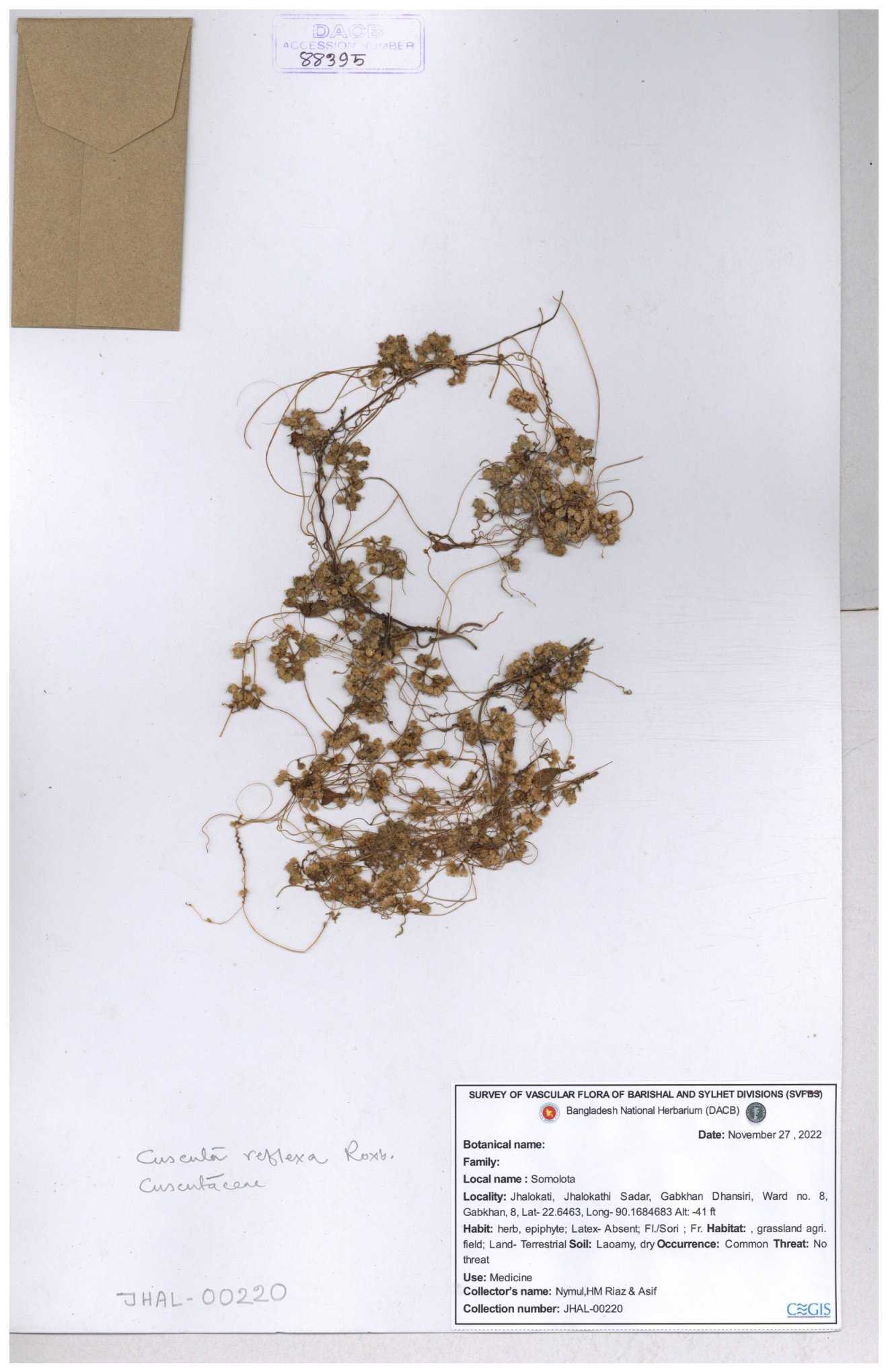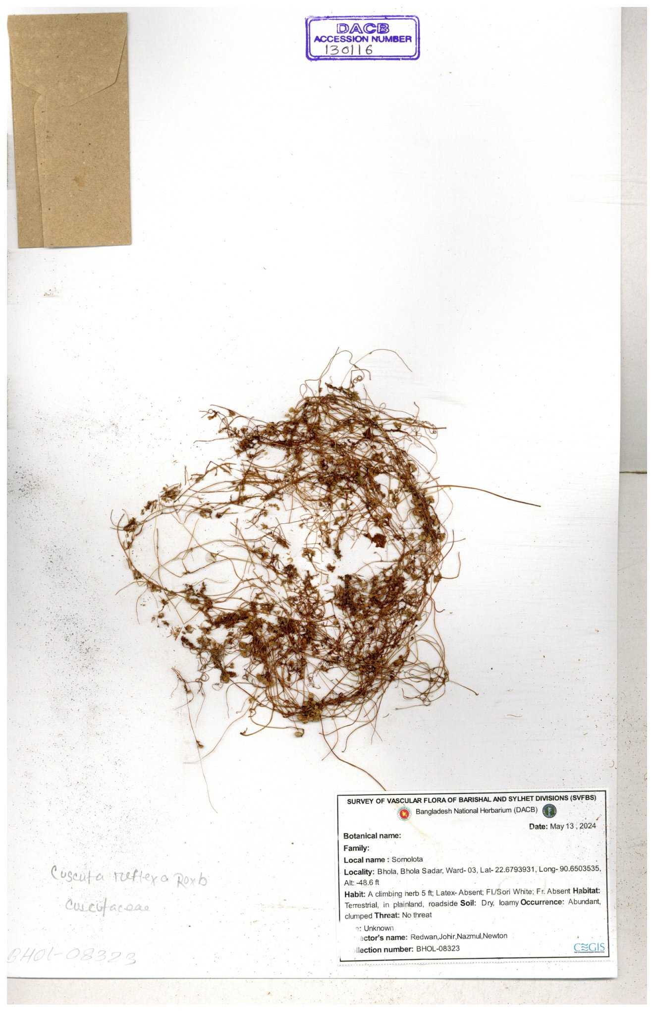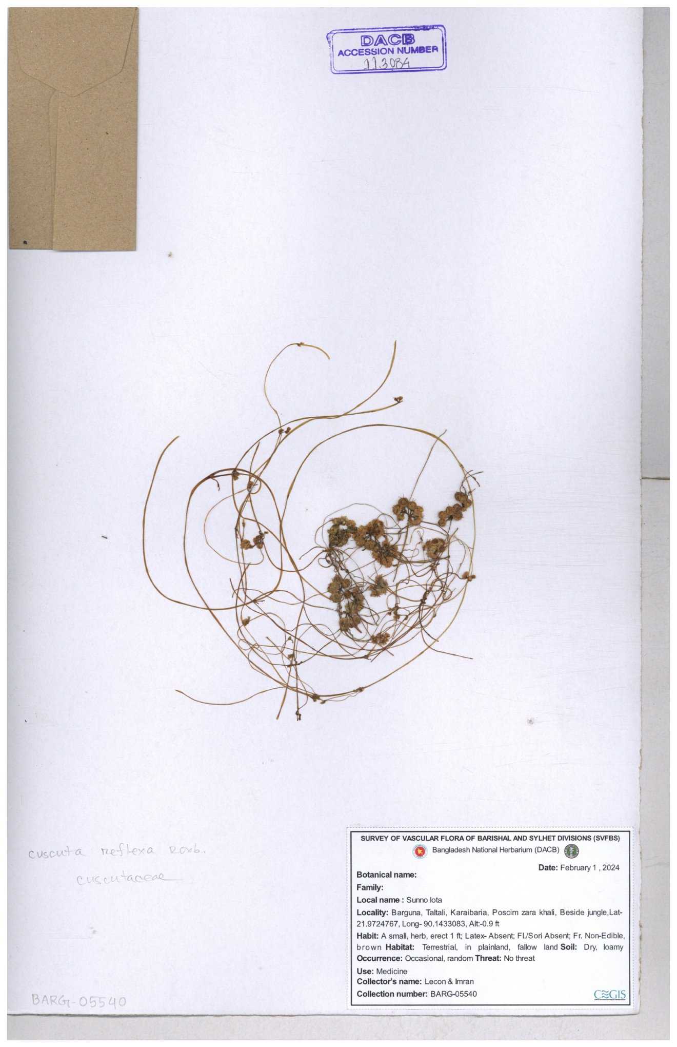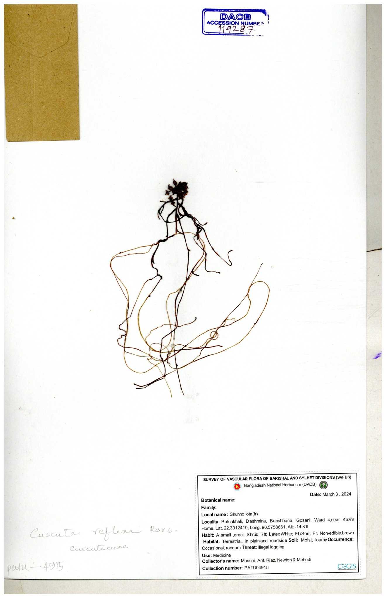 | 65989 | Cuscutaceae | Cuscuta reflexa Roxb. | Khandakar Kamrul Islam | KKI-4078 12-03-2020 |
