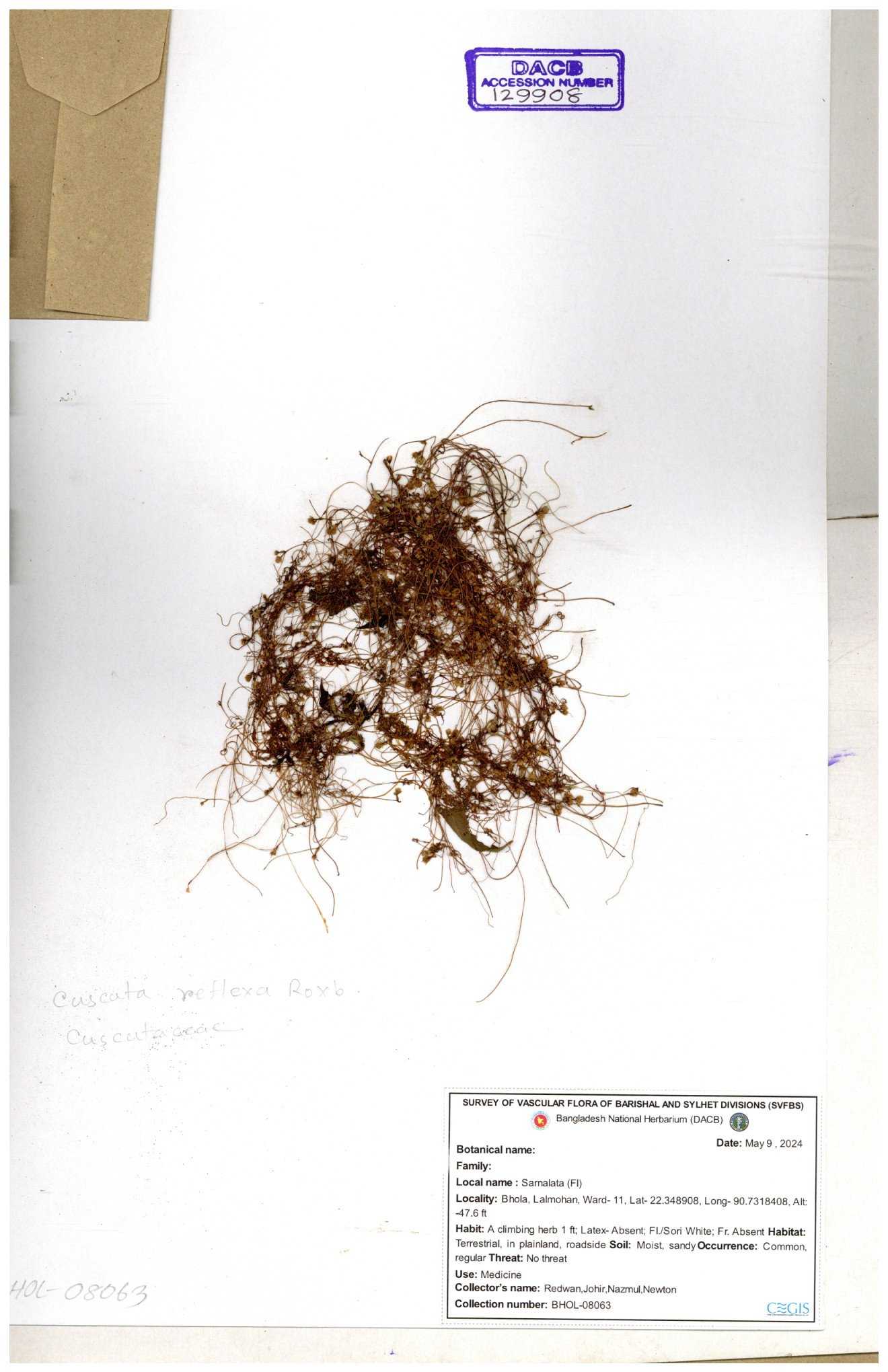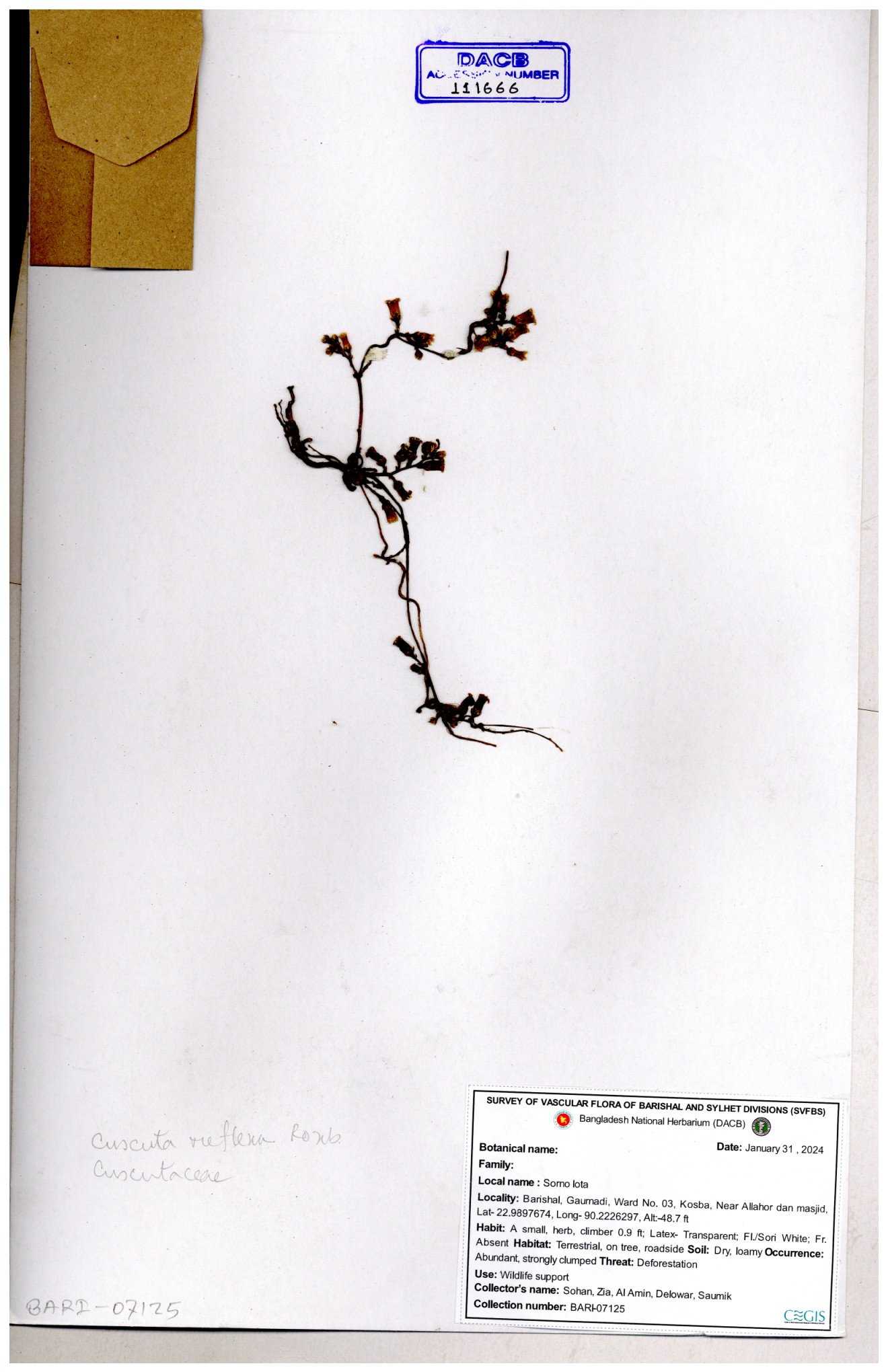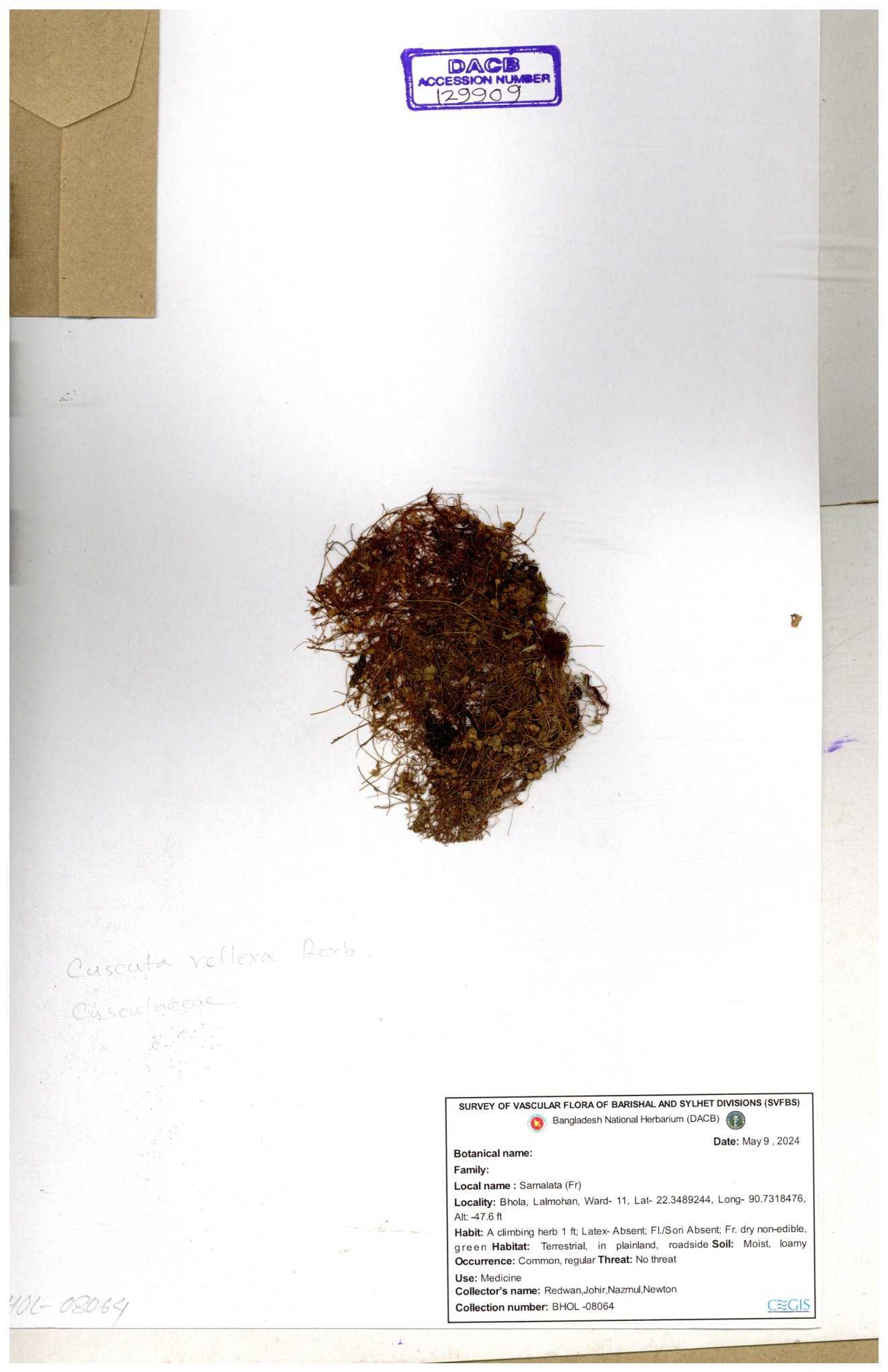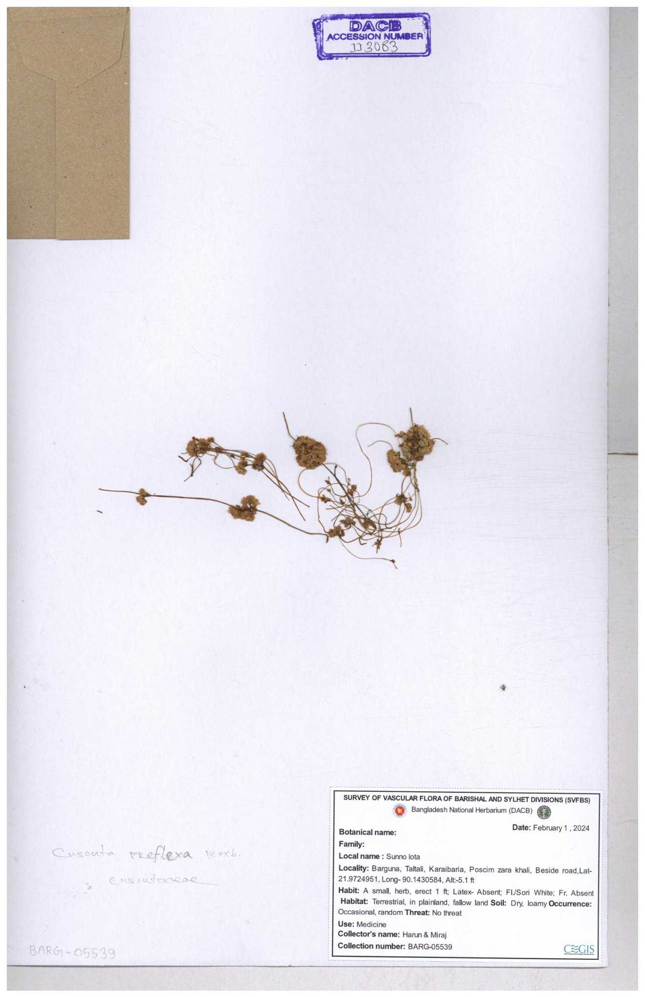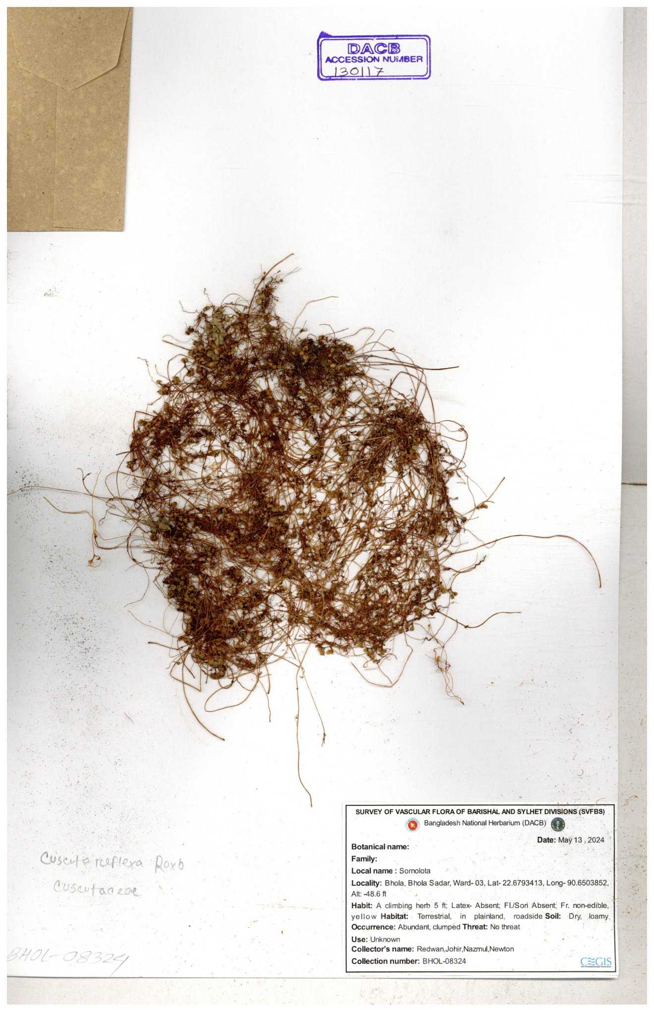 | 65989 | Cuscutaceae | Cuscuta reflexa Roxb. | Khandakar Kamrul Islam | KKI-4078 12-03-2020 |