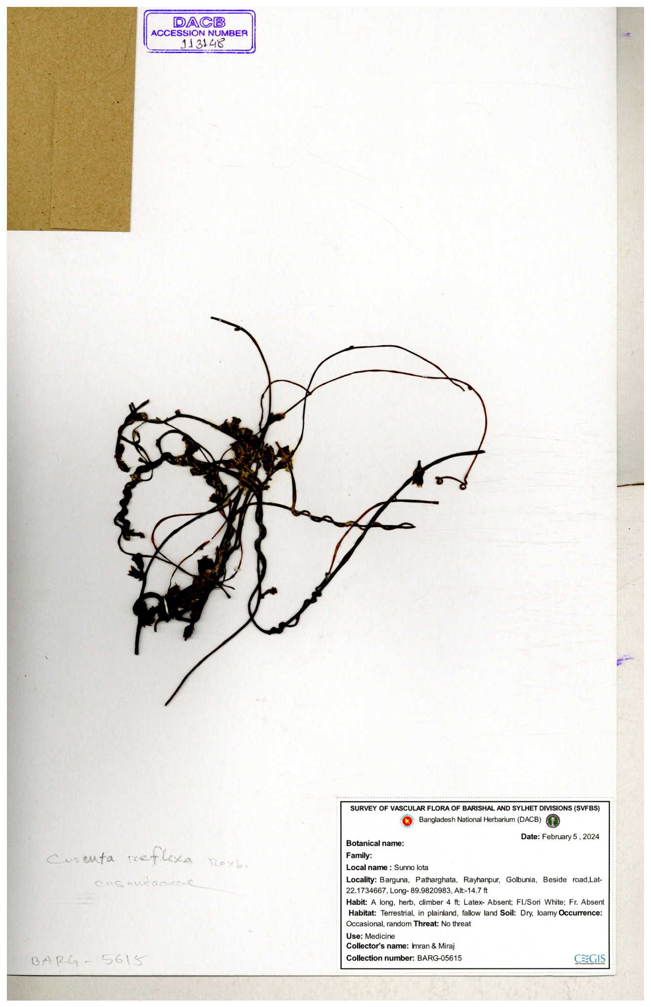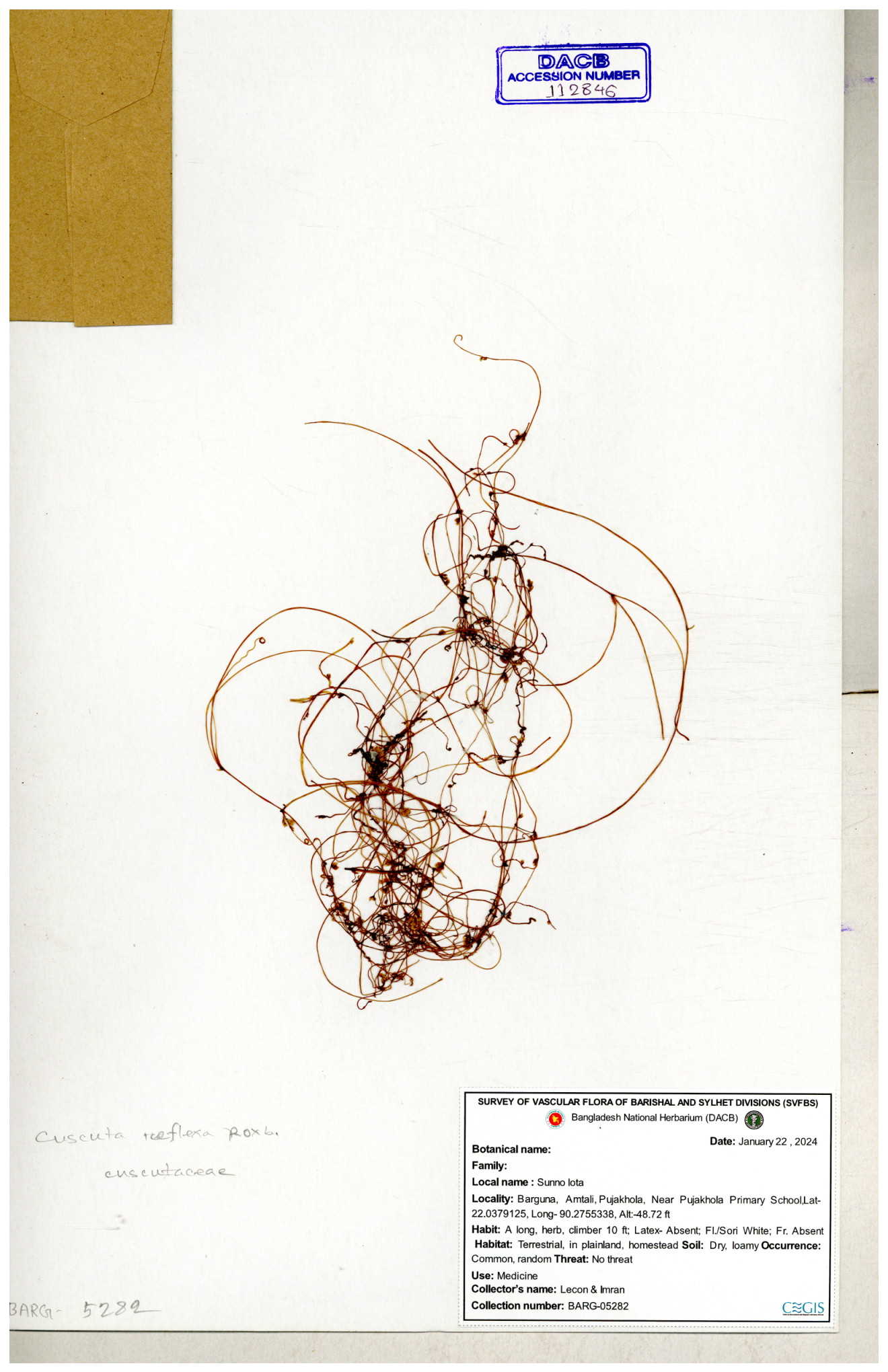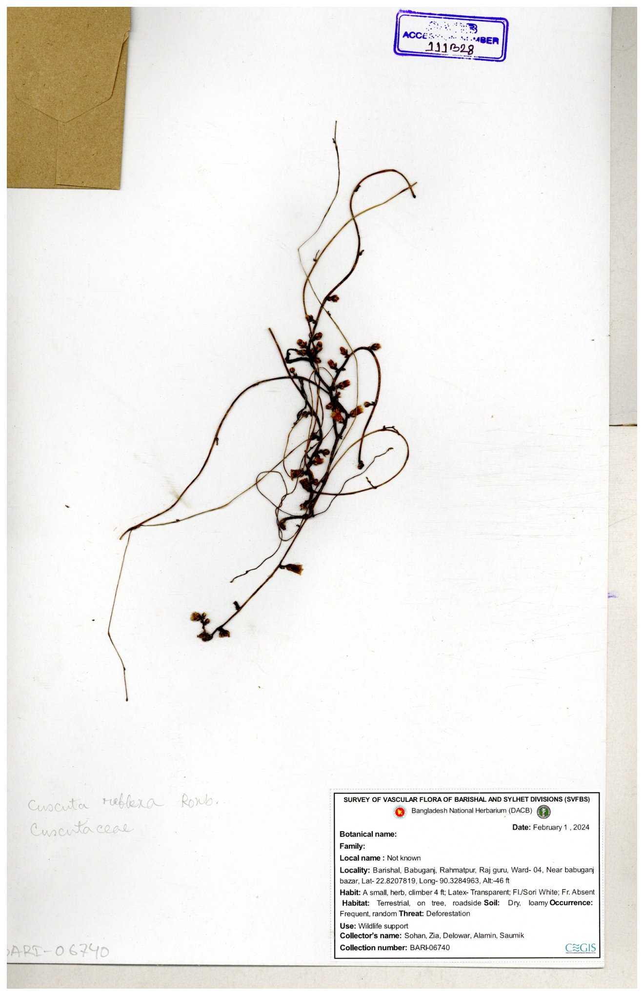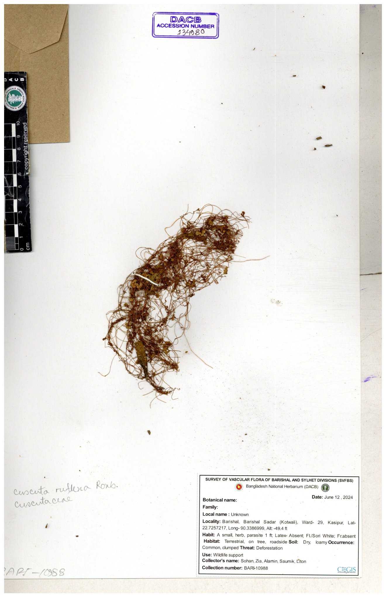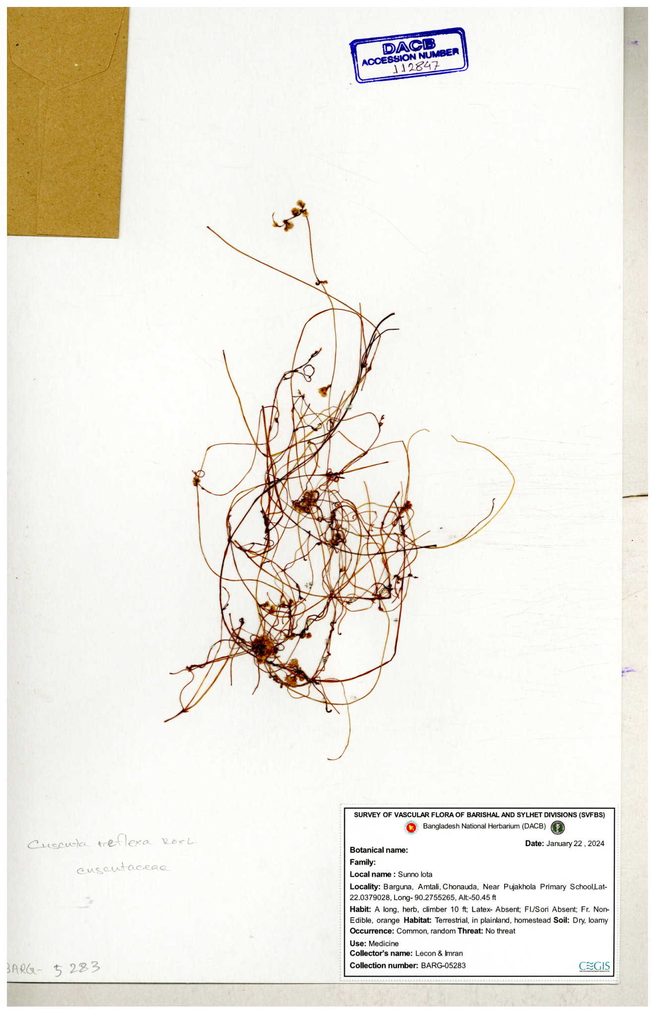 | 65989 | Cuscutaceae | Cuscuta reflexa Roxb. | Khandakar Kamrul Islam | KKI-4078 12-03-2020 |