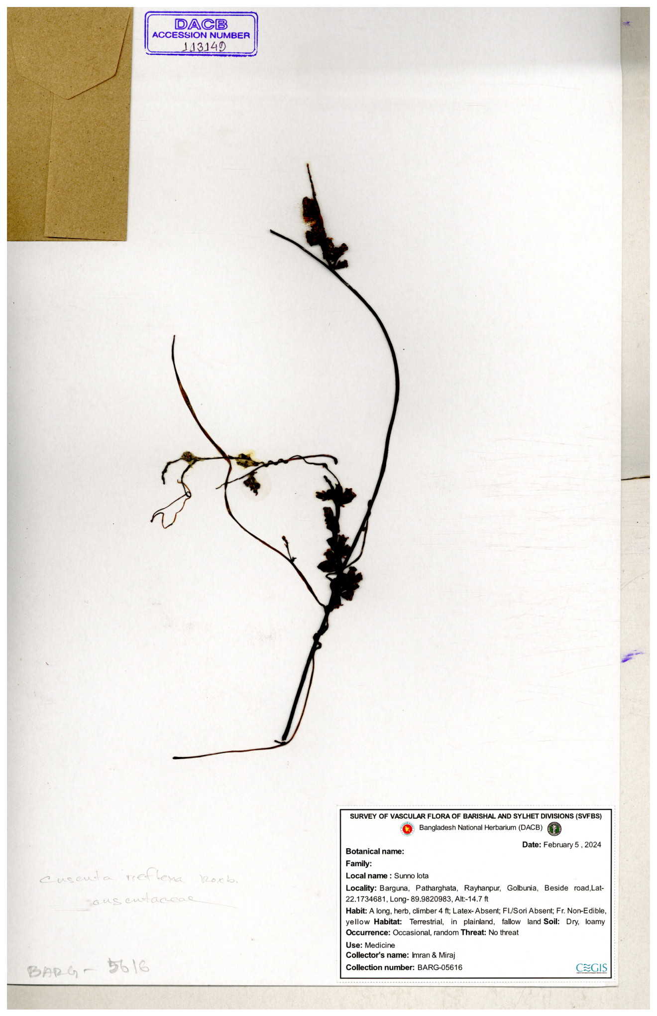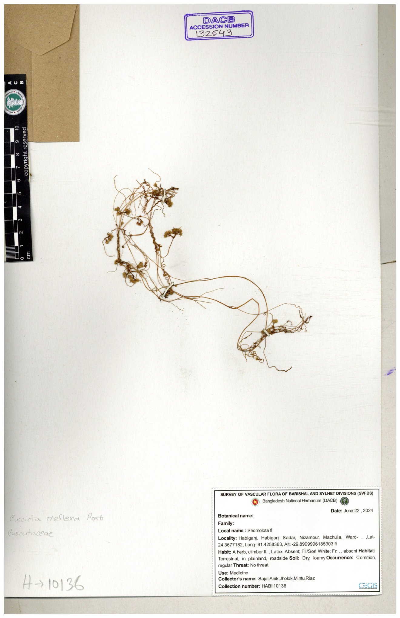 | 85140 | Cuscutaceae | Cuscuta reflexa Roxb | I Hossen, MS Islam, MKR Rahman & MR Miah | IH-4932 15-03-2017 |