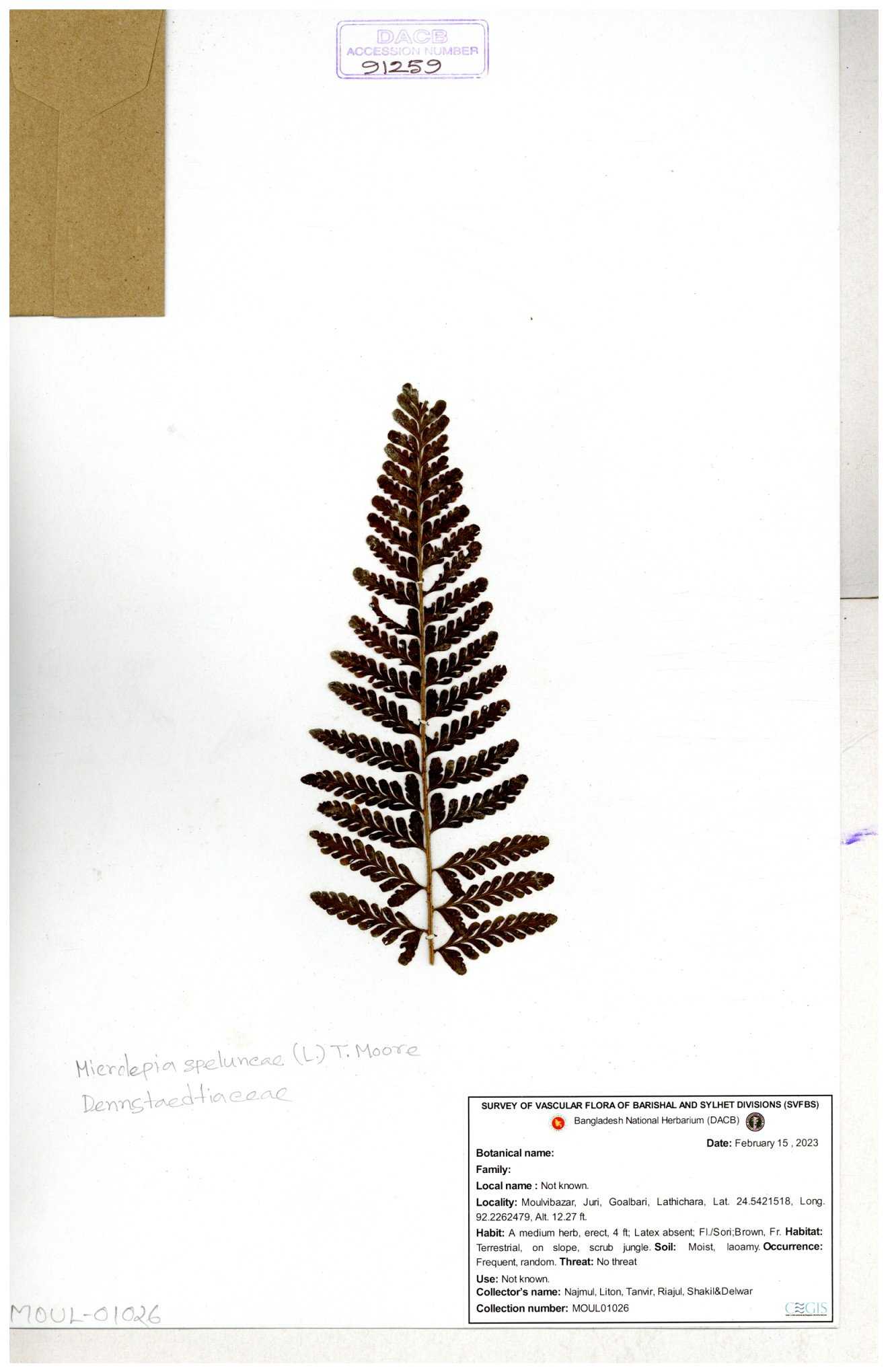 | 65757 | Dennstaedtiaceae | Microlepia speluncae (L.) T. Moore | Joyanta, Mominur, Al amin, Kamrul & Suborno | JCR-2760 07-02-2017 |