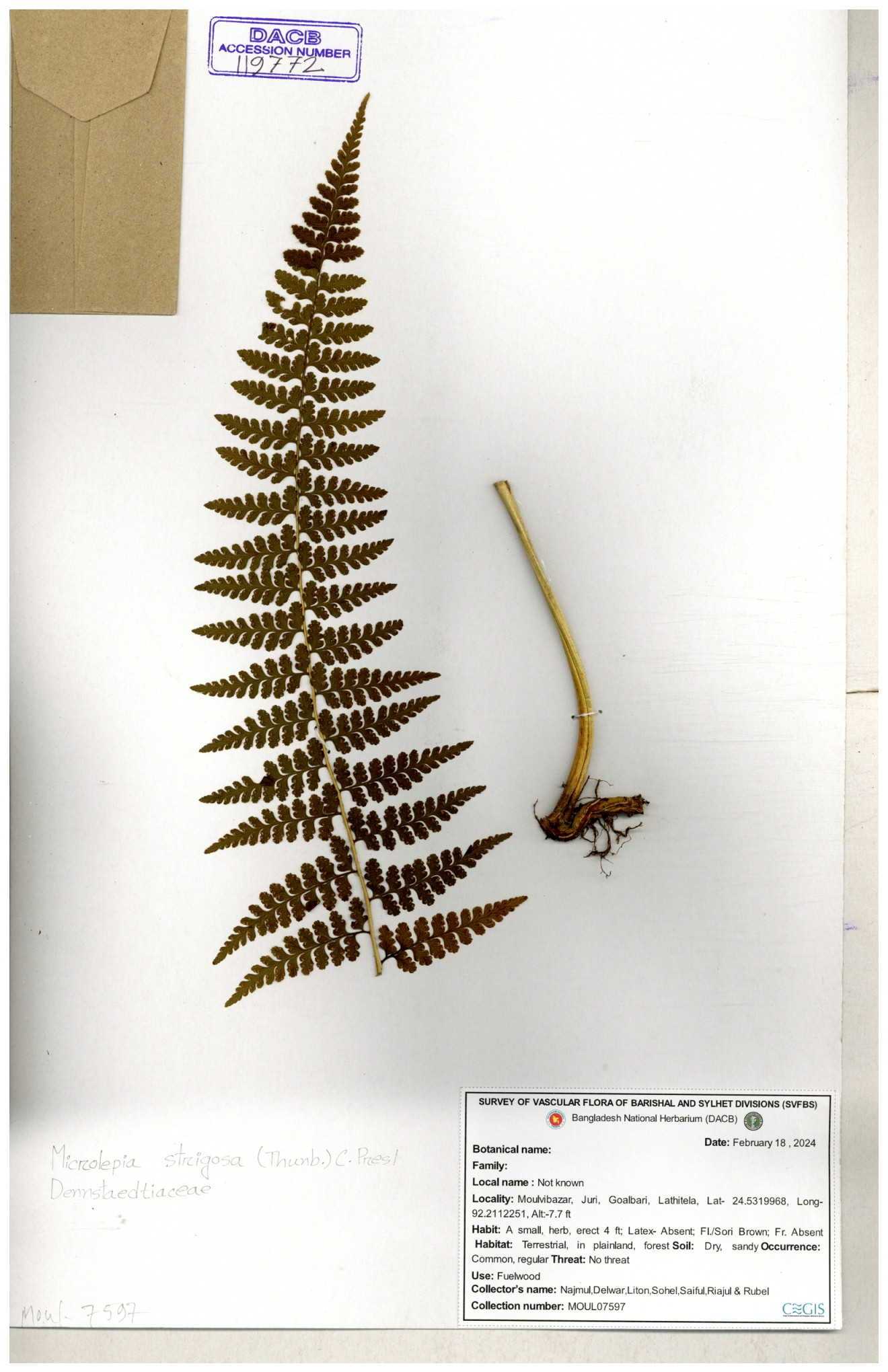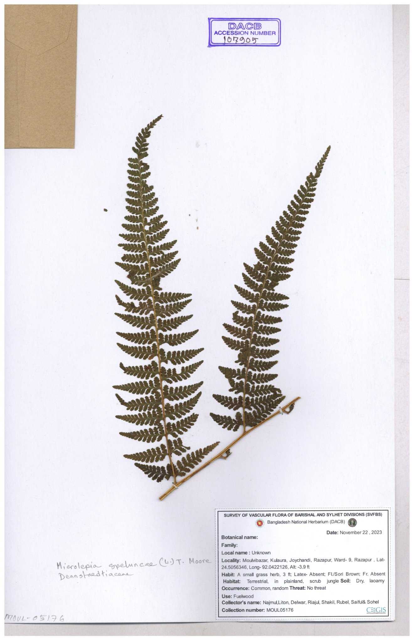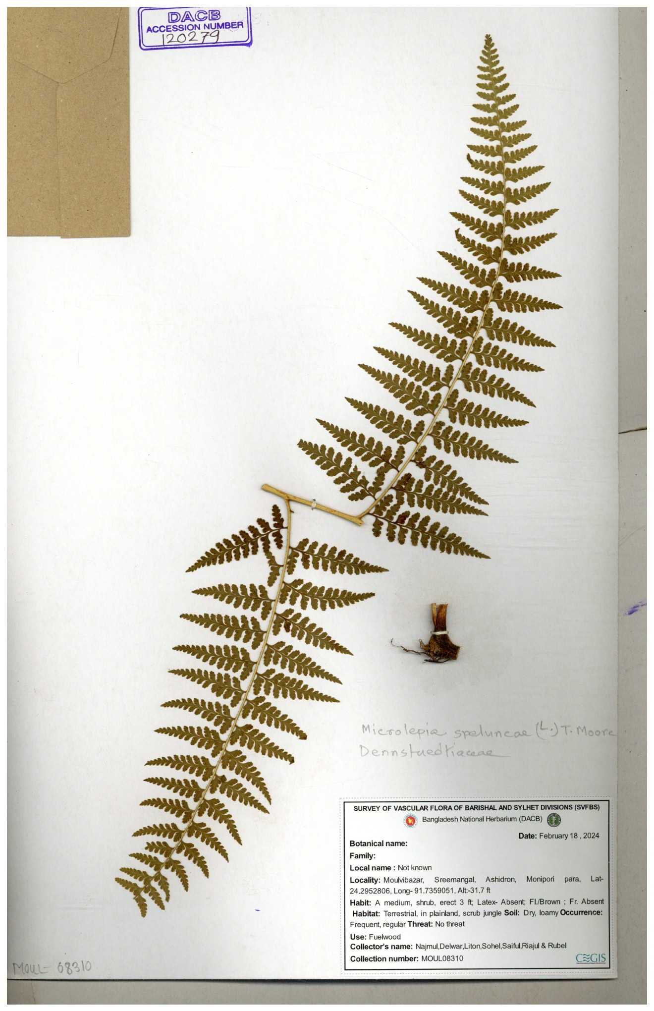 | 32516 | Dennstaedtiaceae | Microlepia sp. C.Presl | Bushra, Habib & Mofiz | B. 707 12-01-2008 |