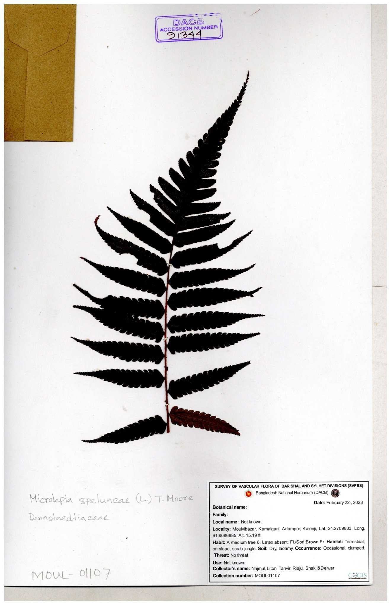 | 33794 | Dennstaedtiaceae | Microlepia speluncae (L.) T. Moore | Momtaz Mahal Mirza. | Mm. 481 15-05-2005 |