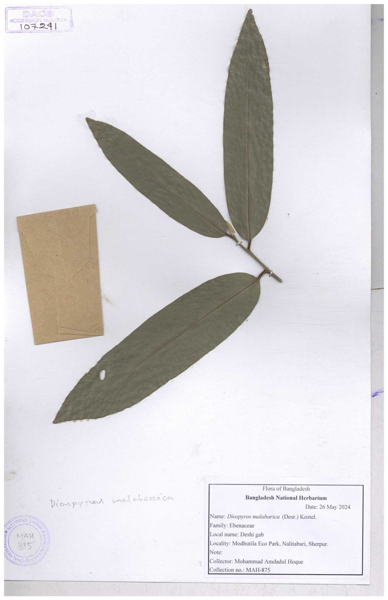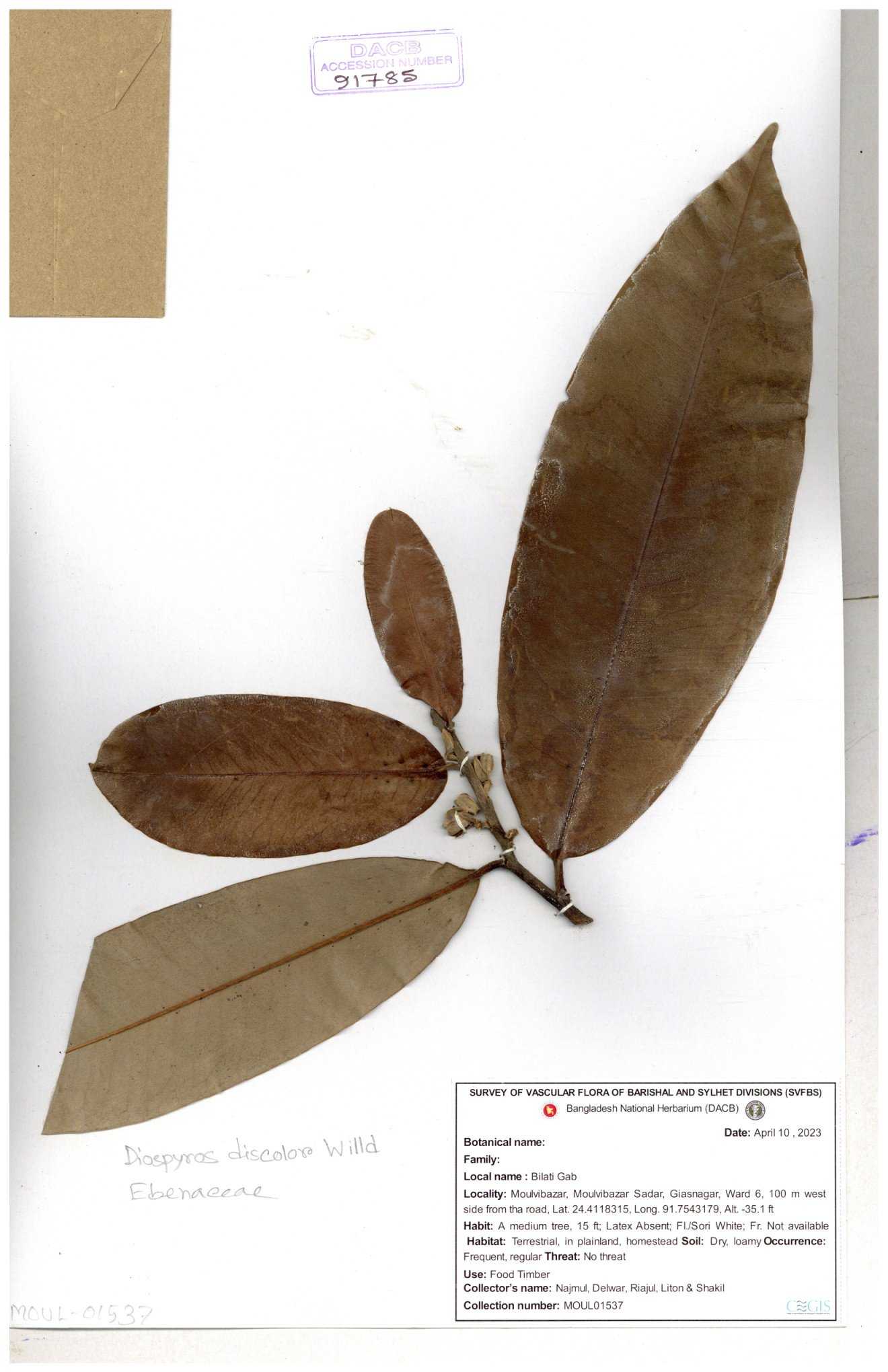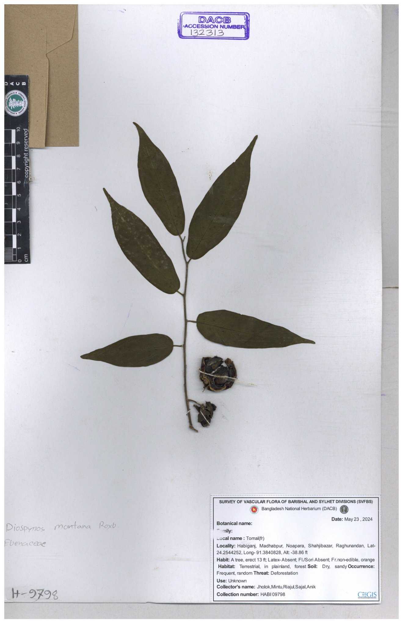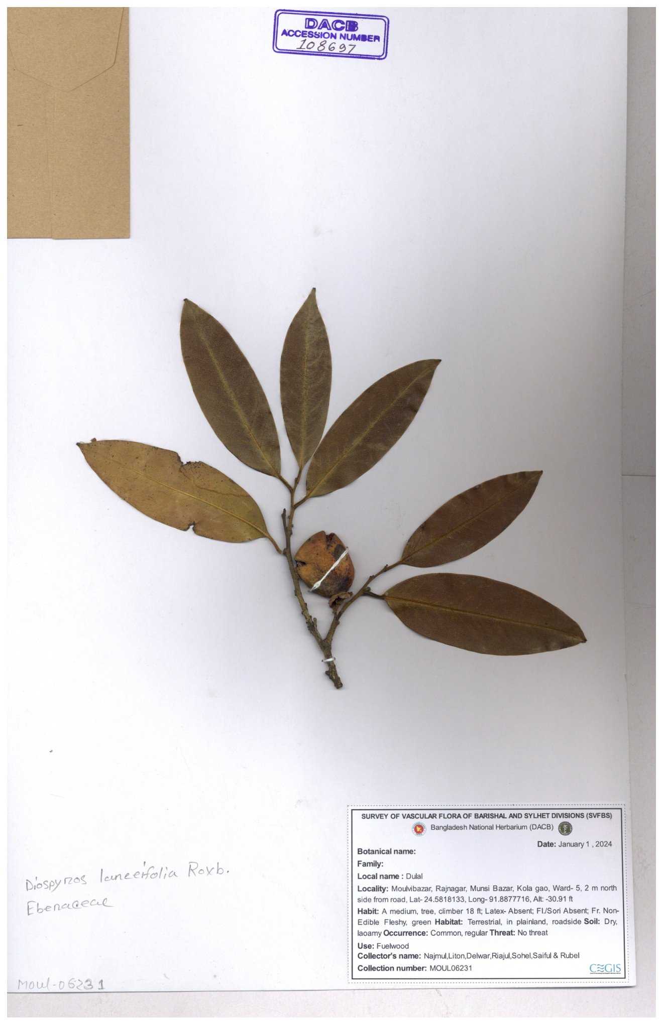| 93053 | Ebenaceae | Diospyros lanceifolia Roxb. | Nazul, Liton, Delwar, Riajul, Shakil, Mahdi & Rubel | MOUL02400 07-06-2023 |