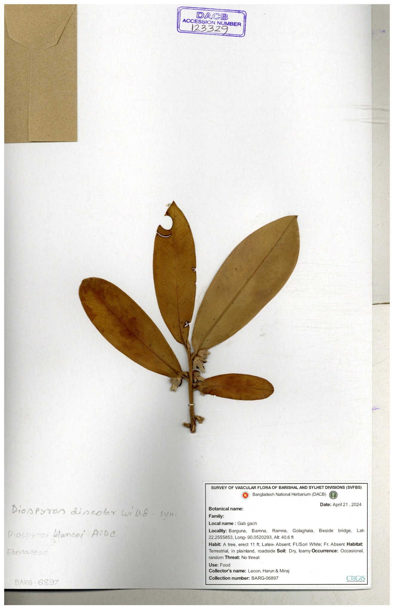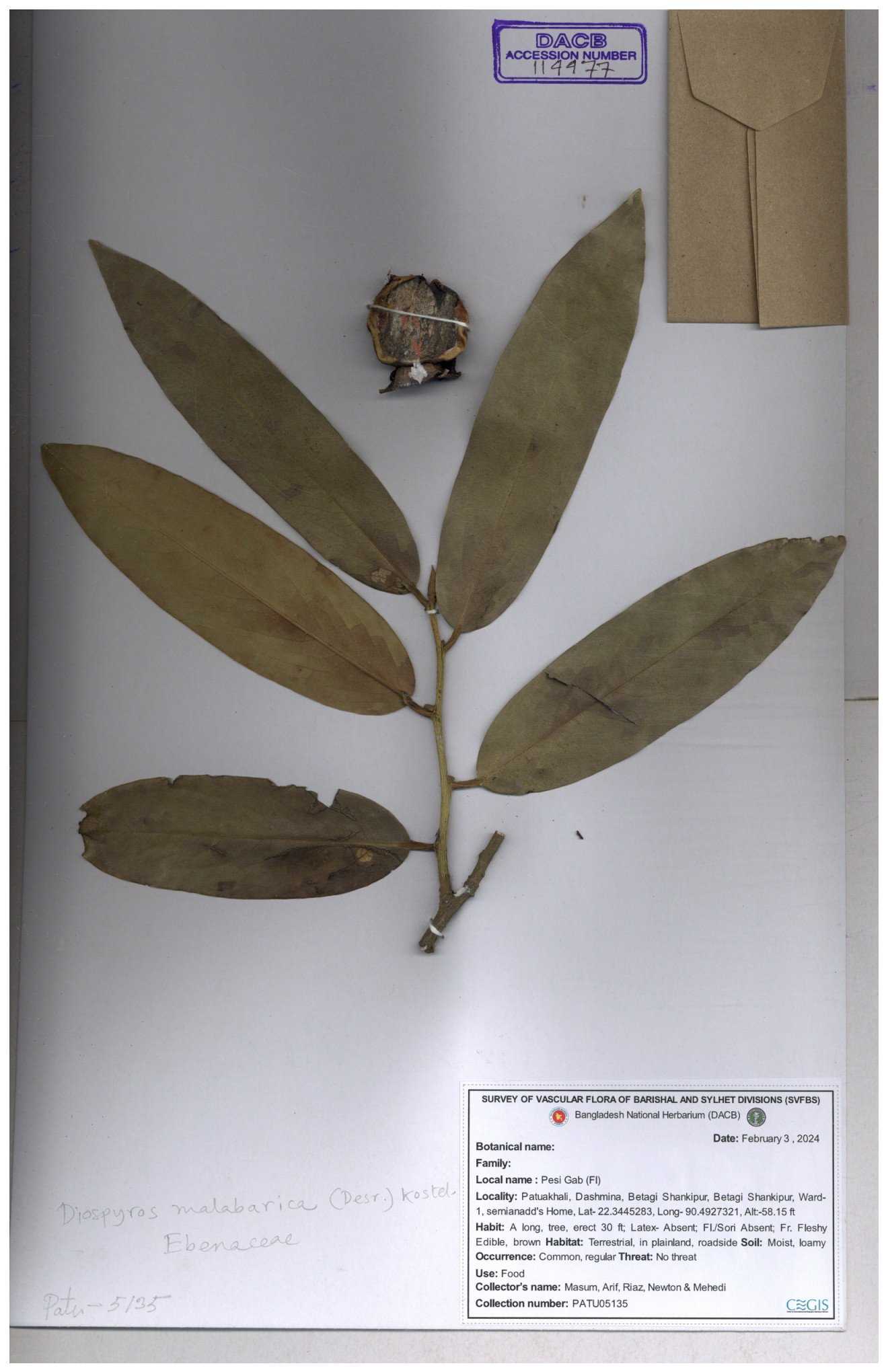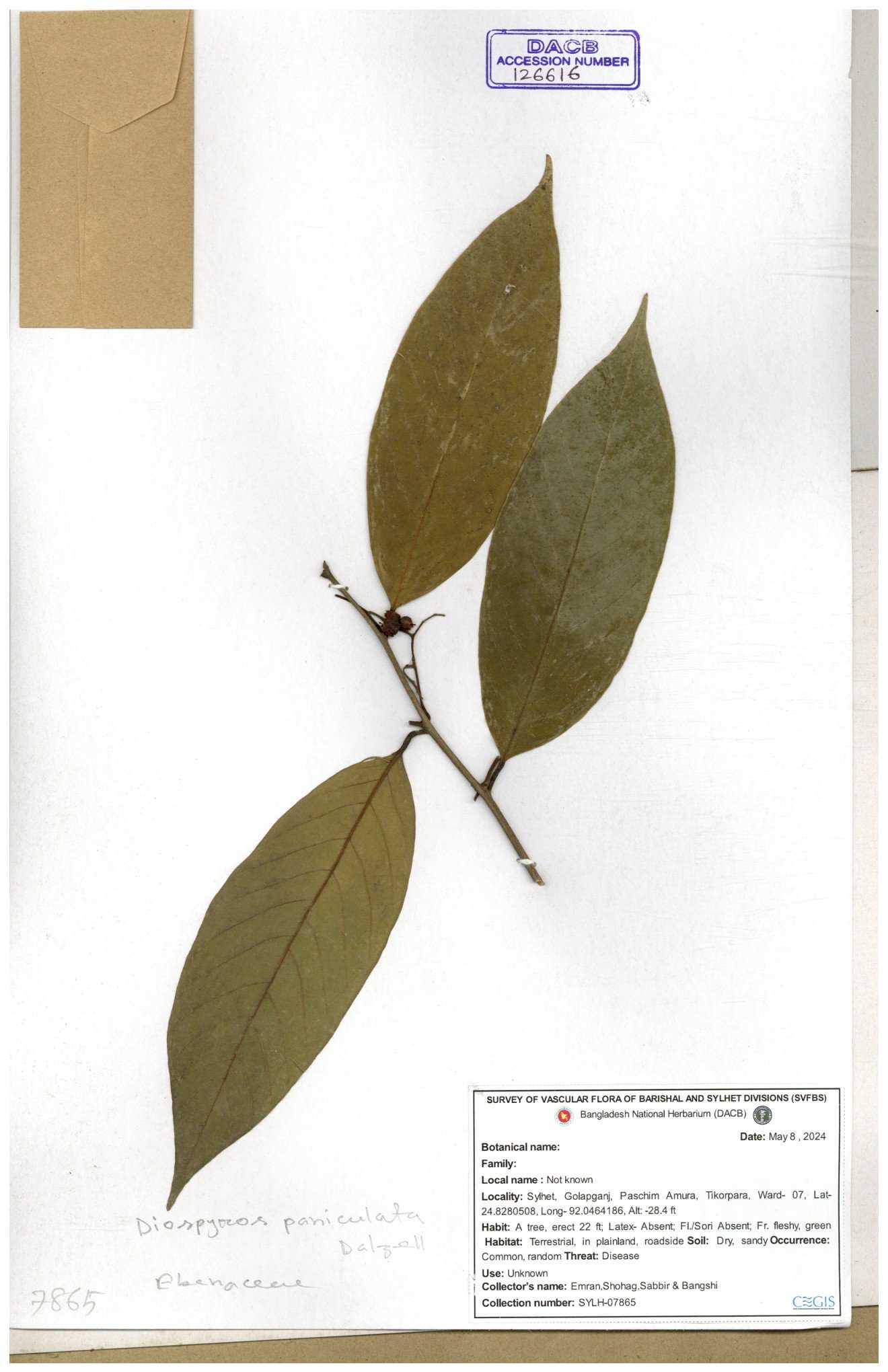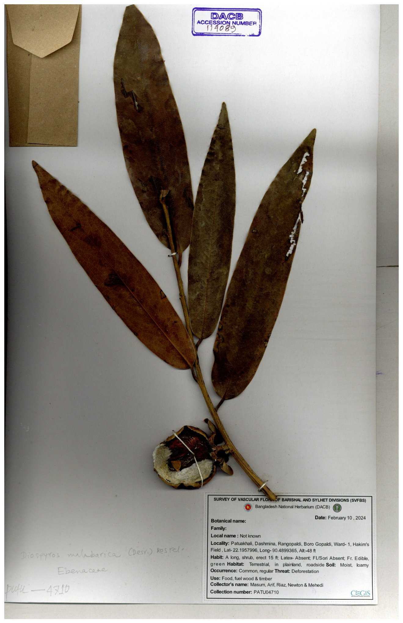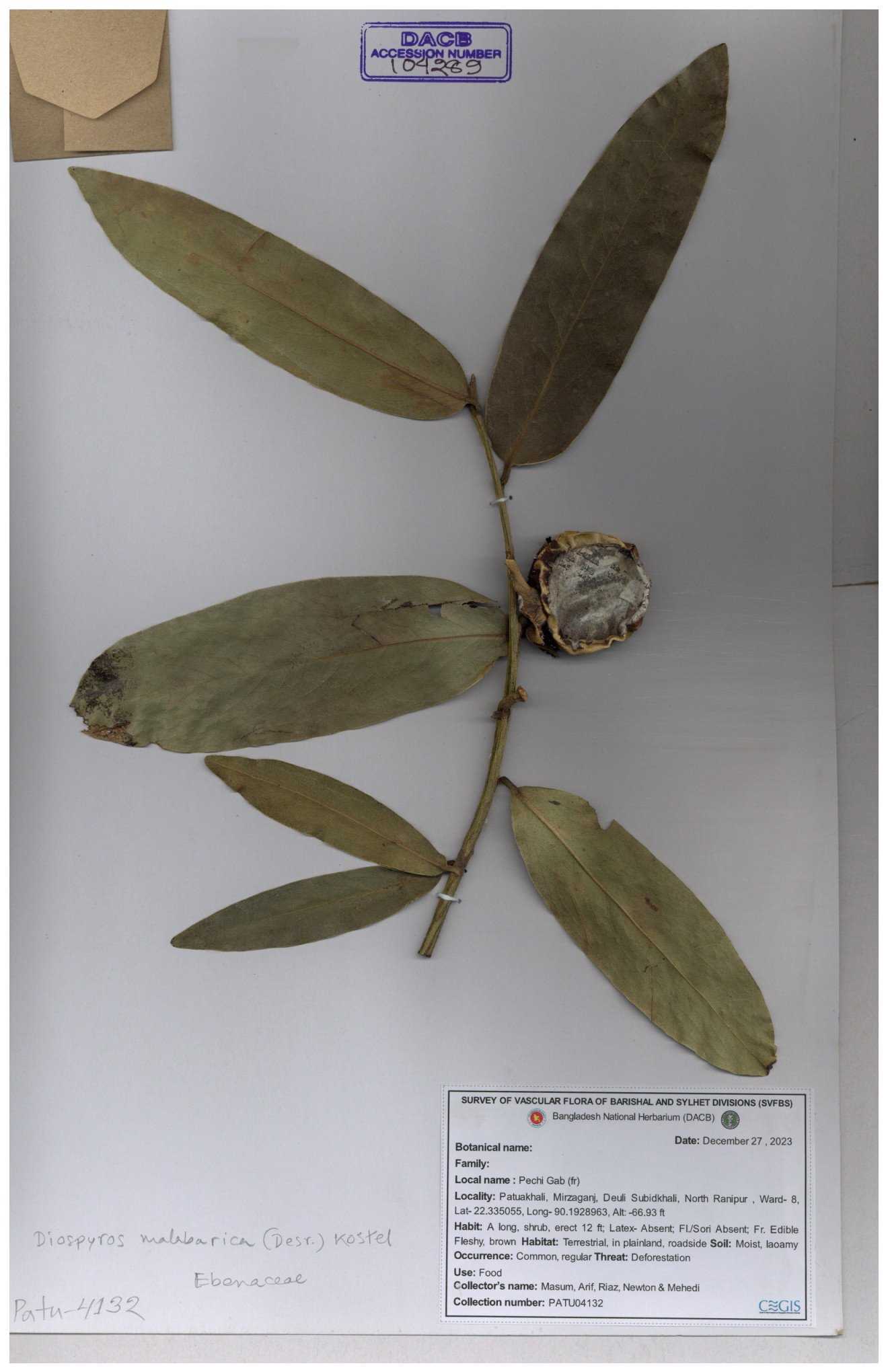 | 93053 | Ebenaceae | Diospyros lanceifolia Roxb. | Nazul, Liton, Delwar, Riajul, Shakil, Mahdi & Rubel | MOUL02400 07-06-2023 |