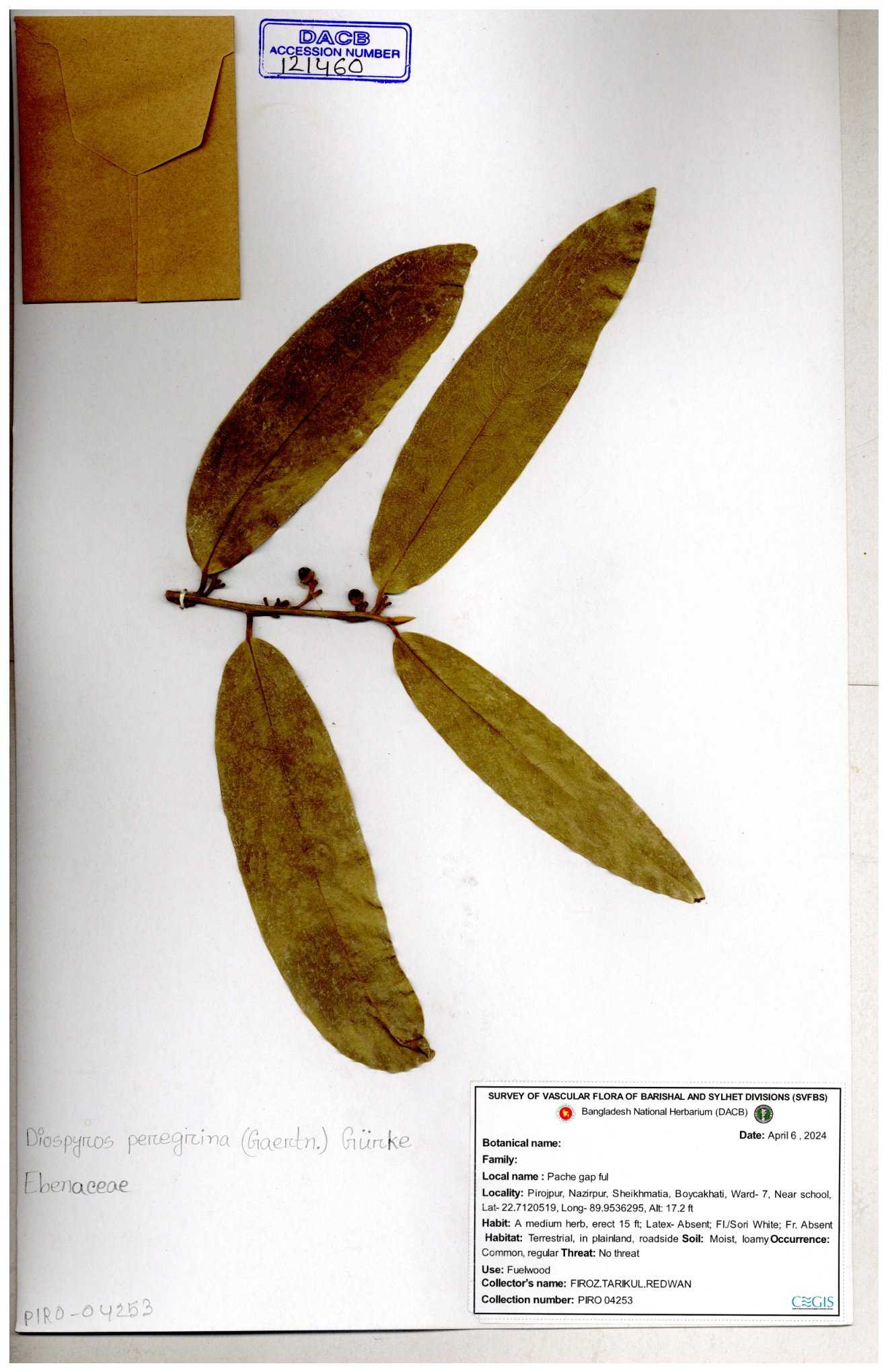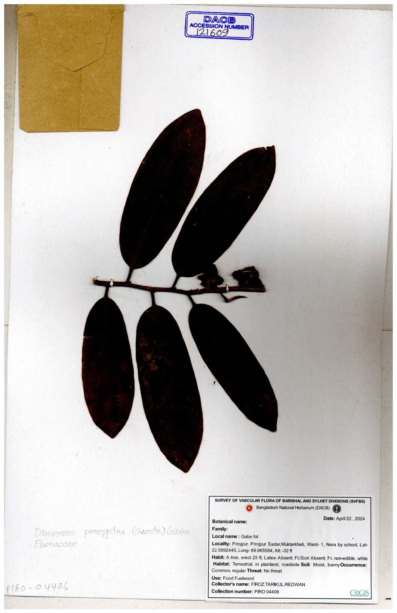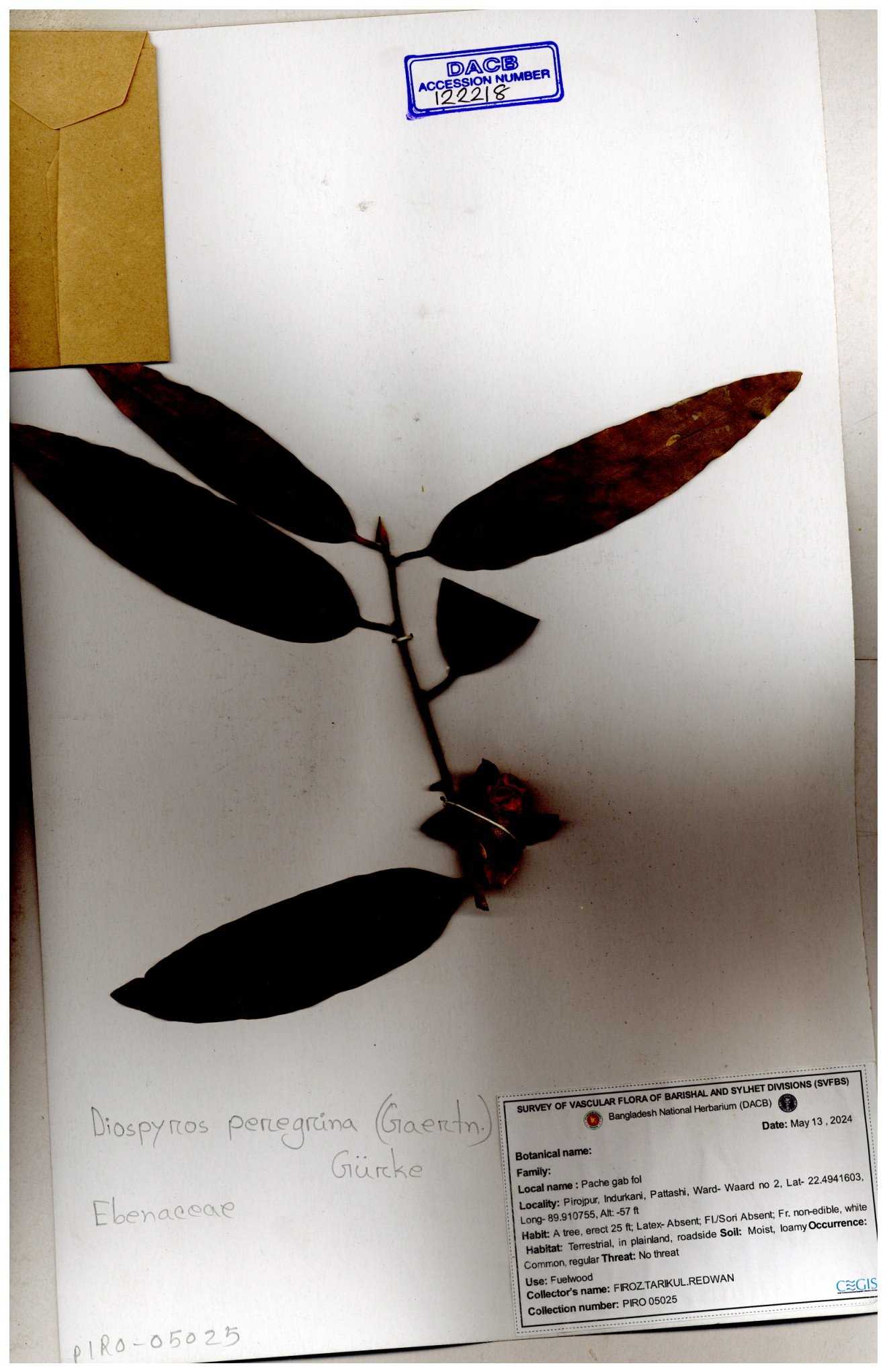 | 15910 | Ebenaceae | Diospyros peregrina Gurke | A.M. Huq | 61 17-06-1970 |