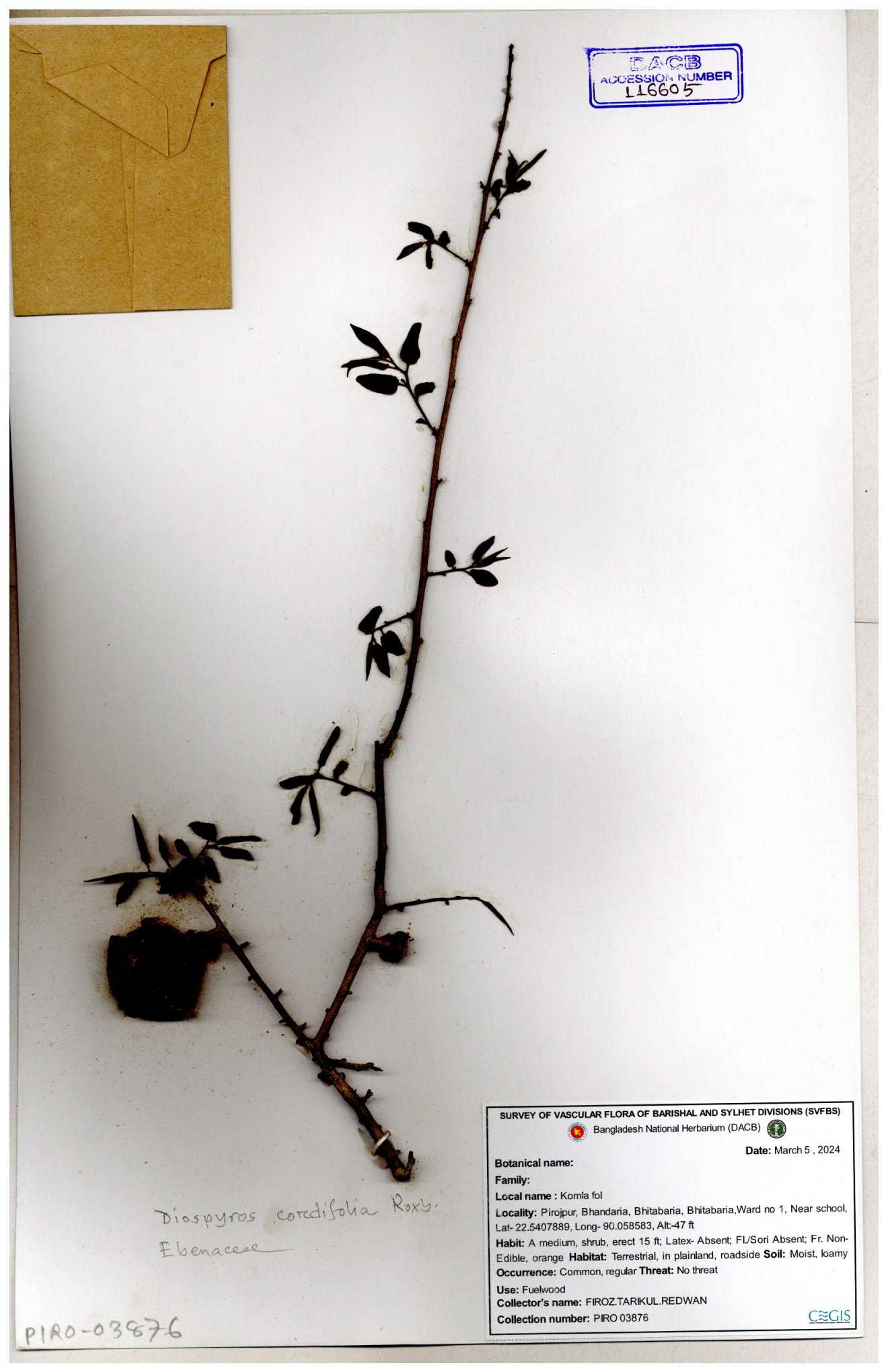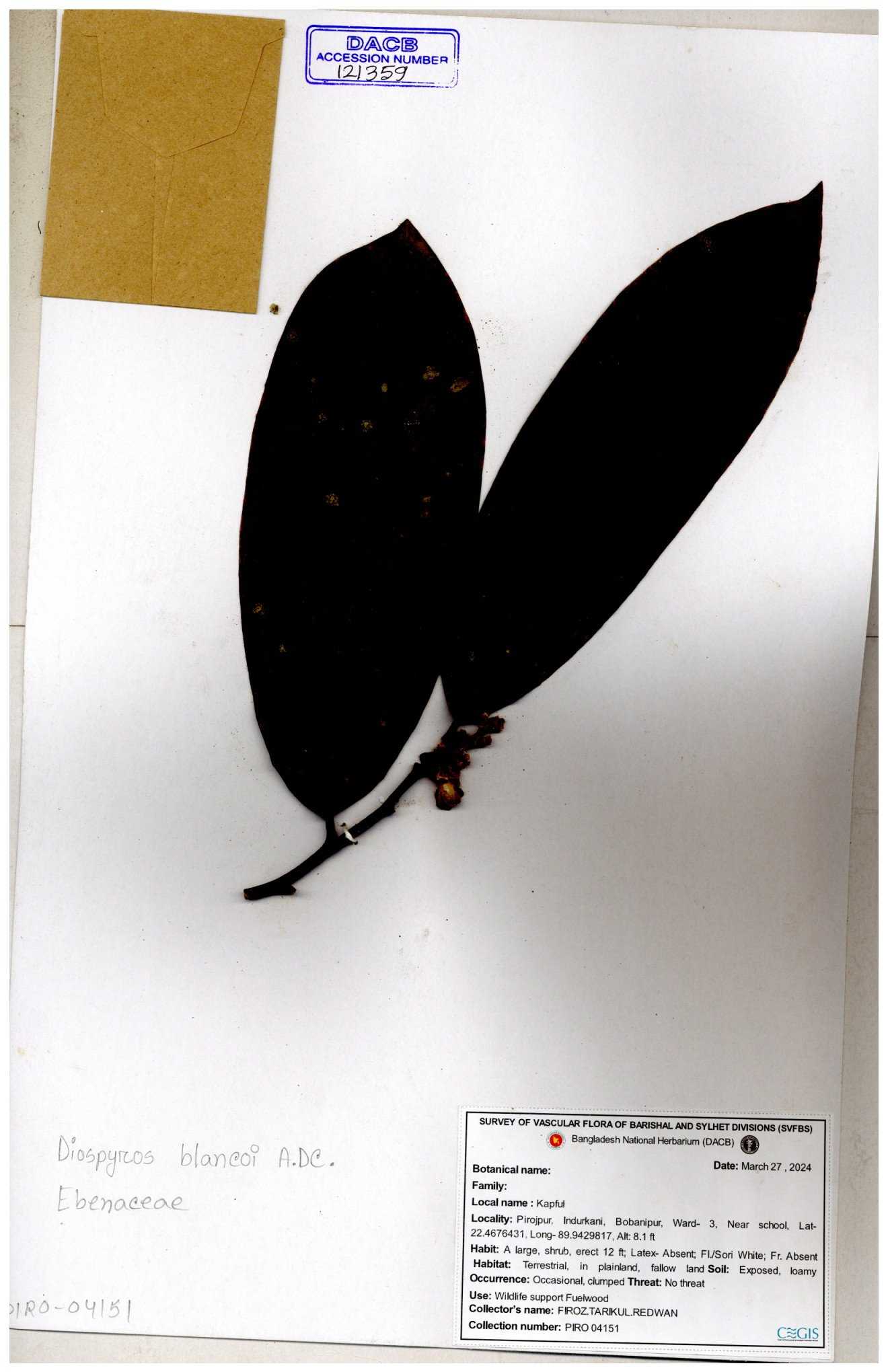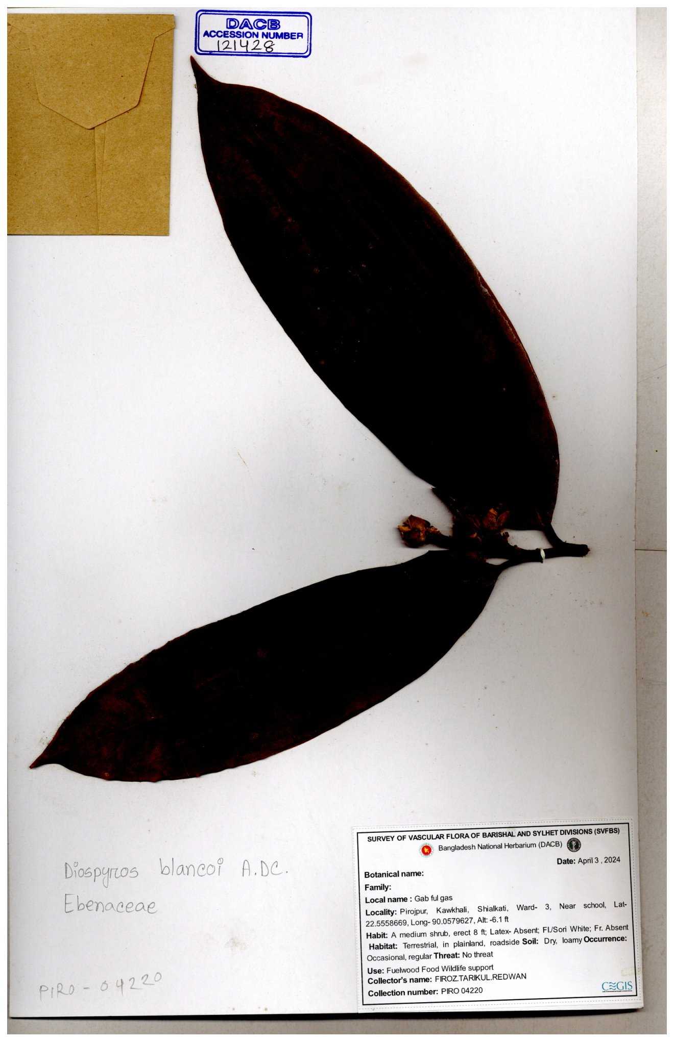 | 46279 | Ebenaceae | Diospyros ramiflora | Khandakar Kamrul Islam | KKI-1998 04-01-2016 |
