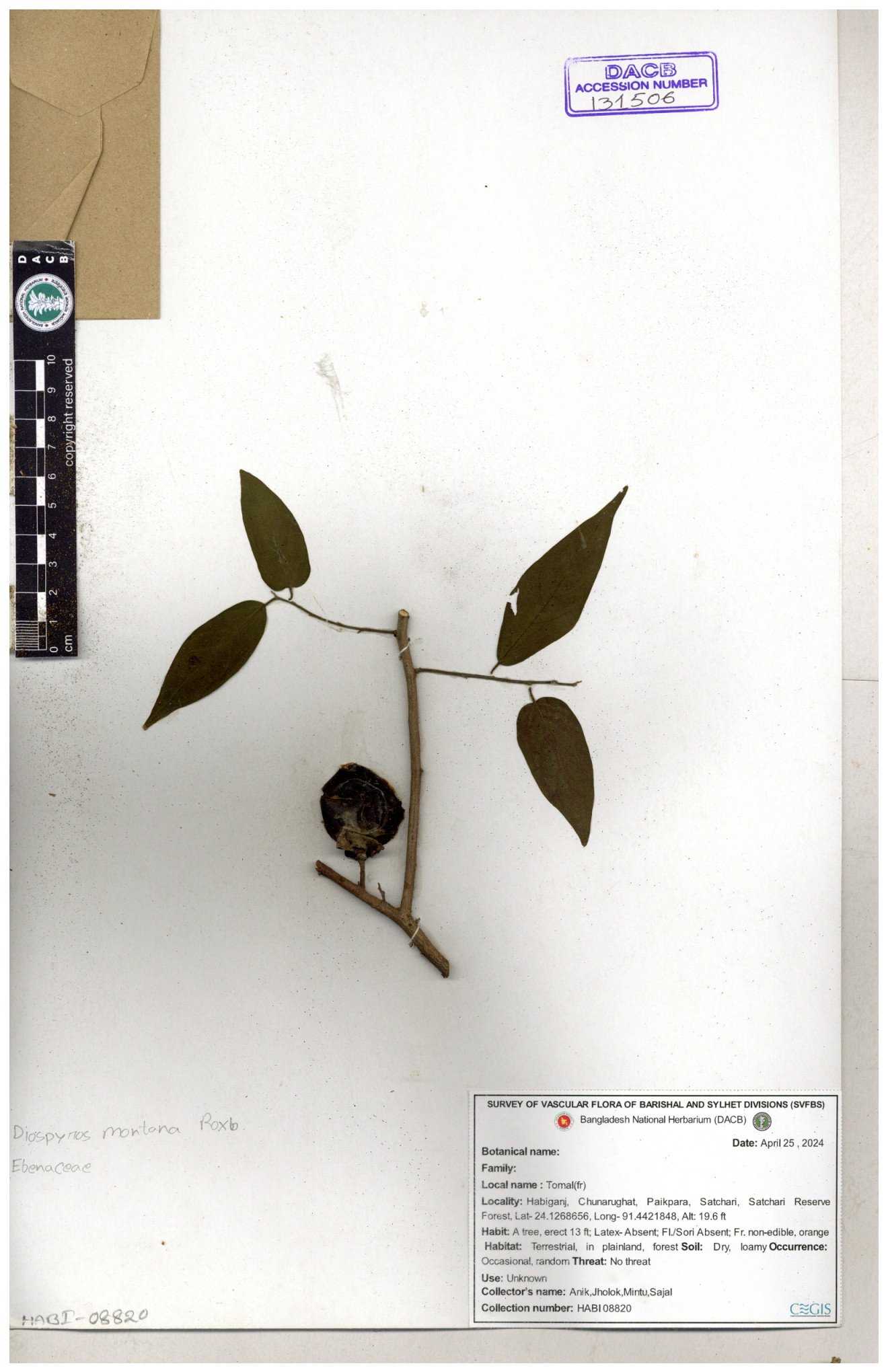 | 25405 | Ebenaceae | Diospyros sp. | Tamal | A. M. Huq | 8447 15-07-1987 |