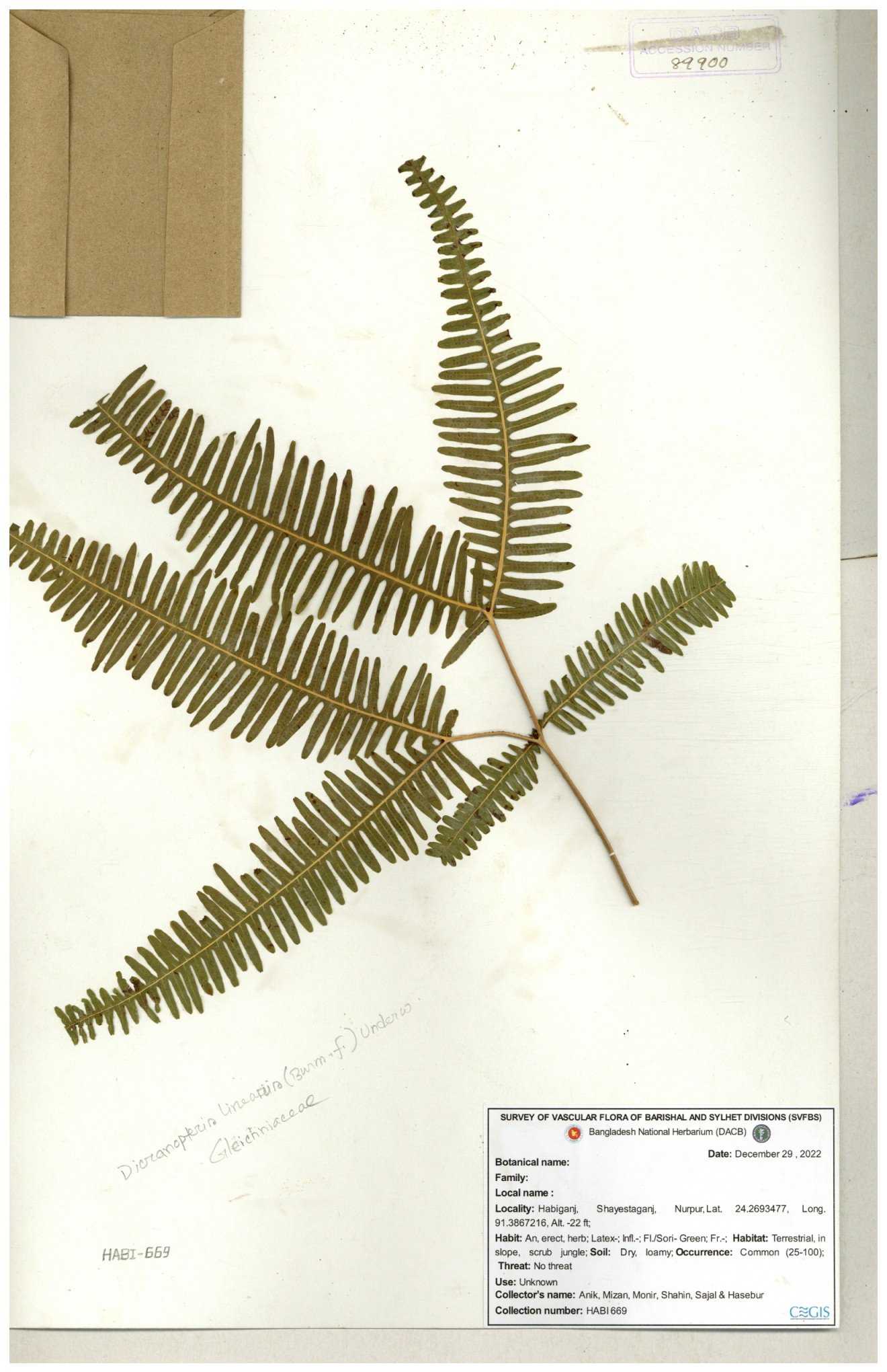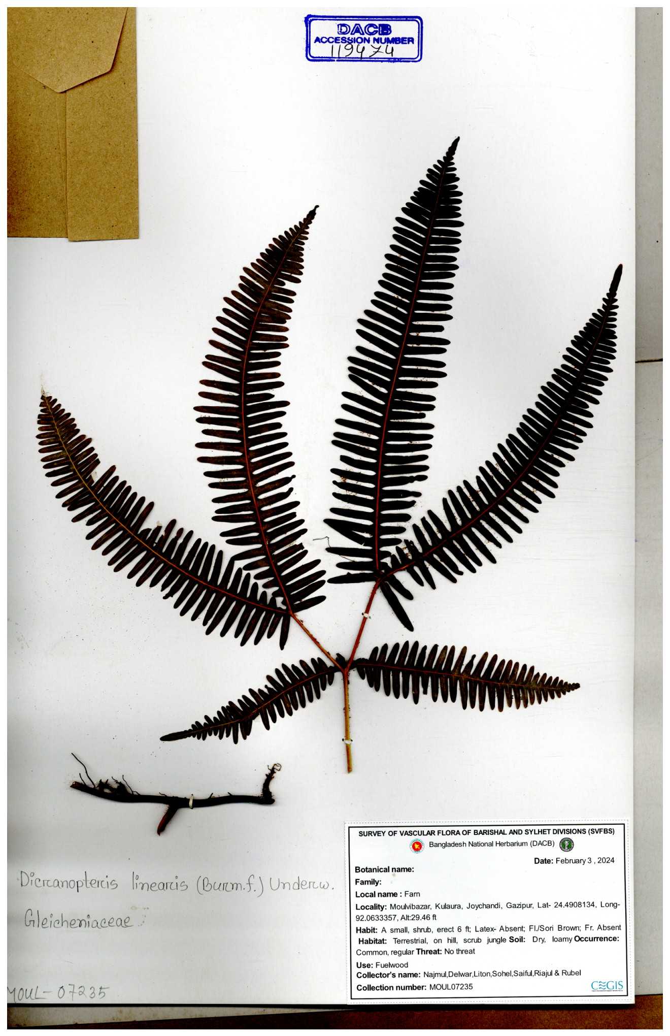 | 63568 | Gleicheniaceae | Dicranopteris lineanis | Niyamul Kabir, Jahid Hasan, Mehedi Hasan | NK-5352 11-07-2017 |