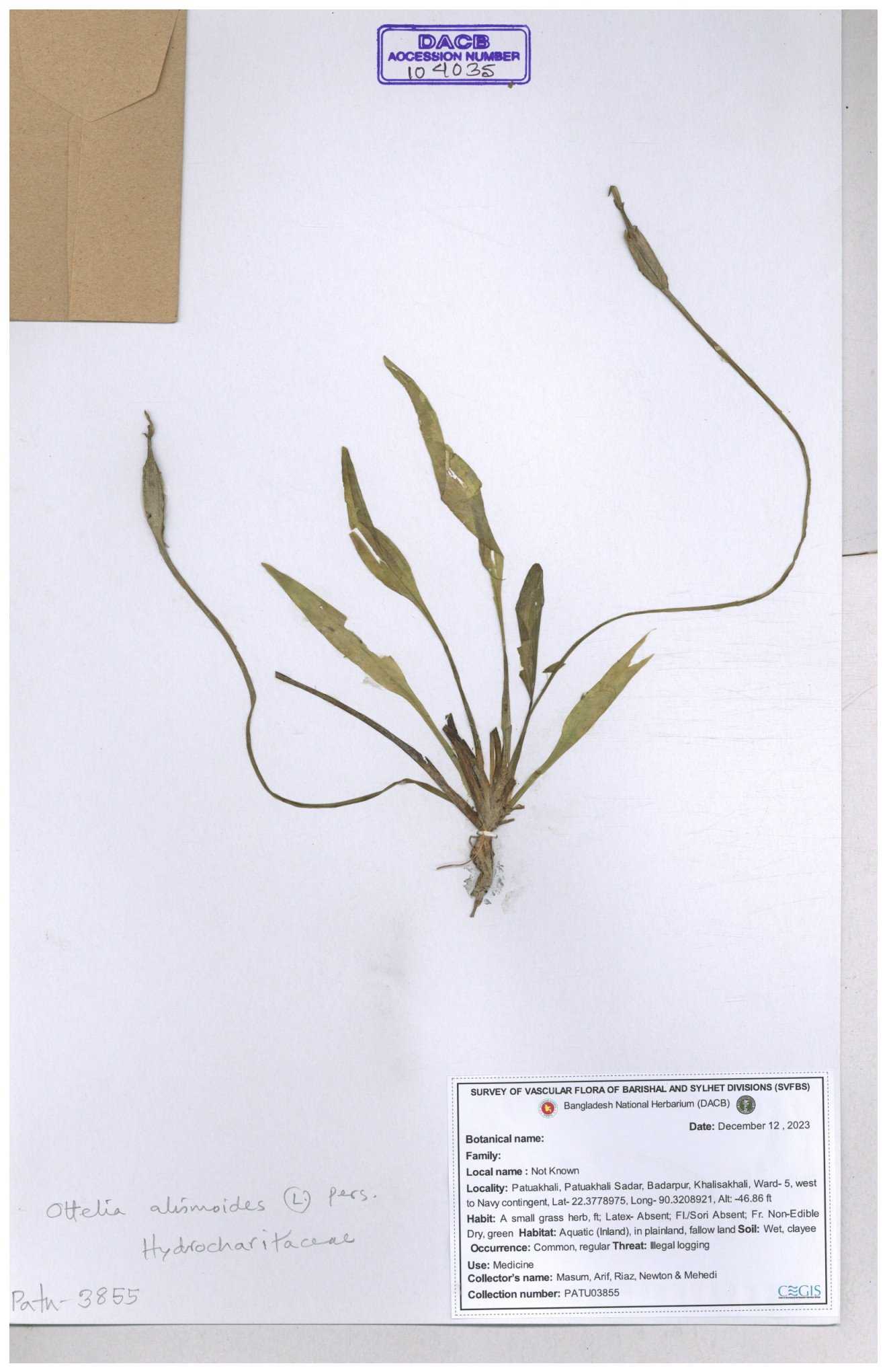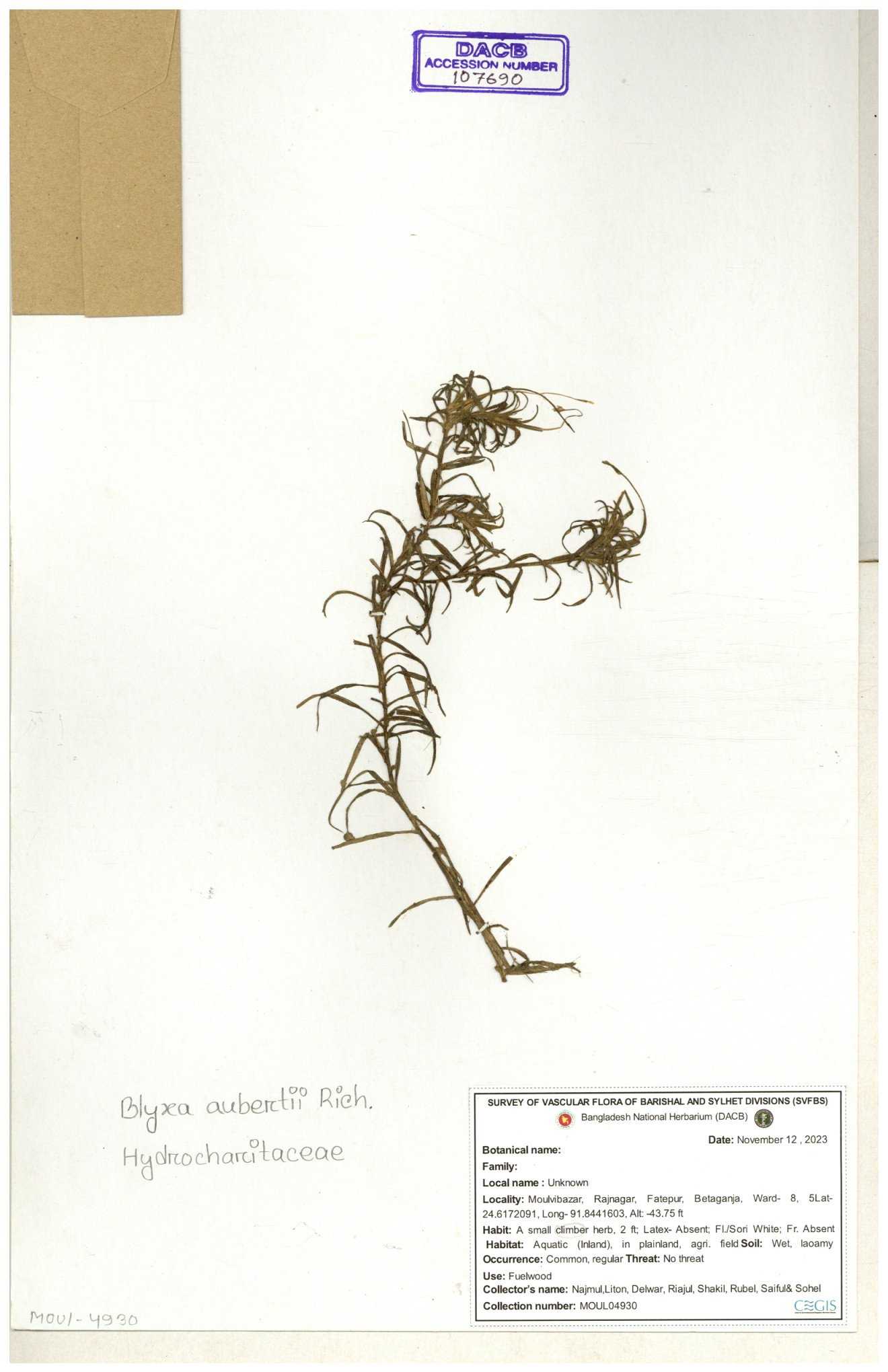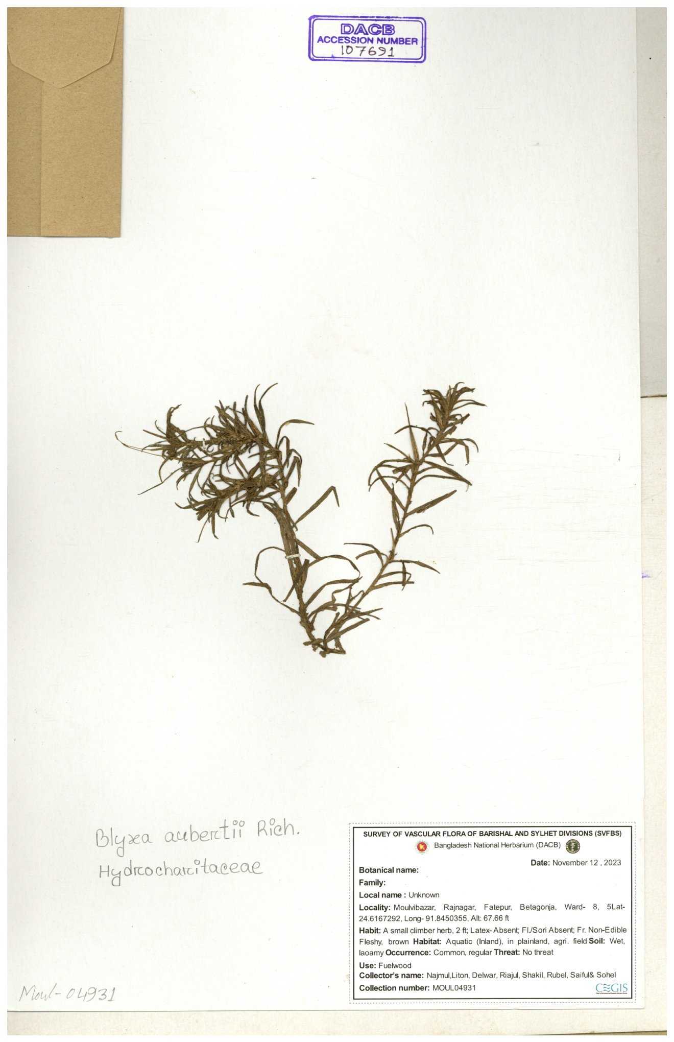 | 31814 | Hydrocharitaceae | Blyxa nechamandra Not known | A.M. Huq & M.K. Mia | Mia. 10642 04-06-1999 |