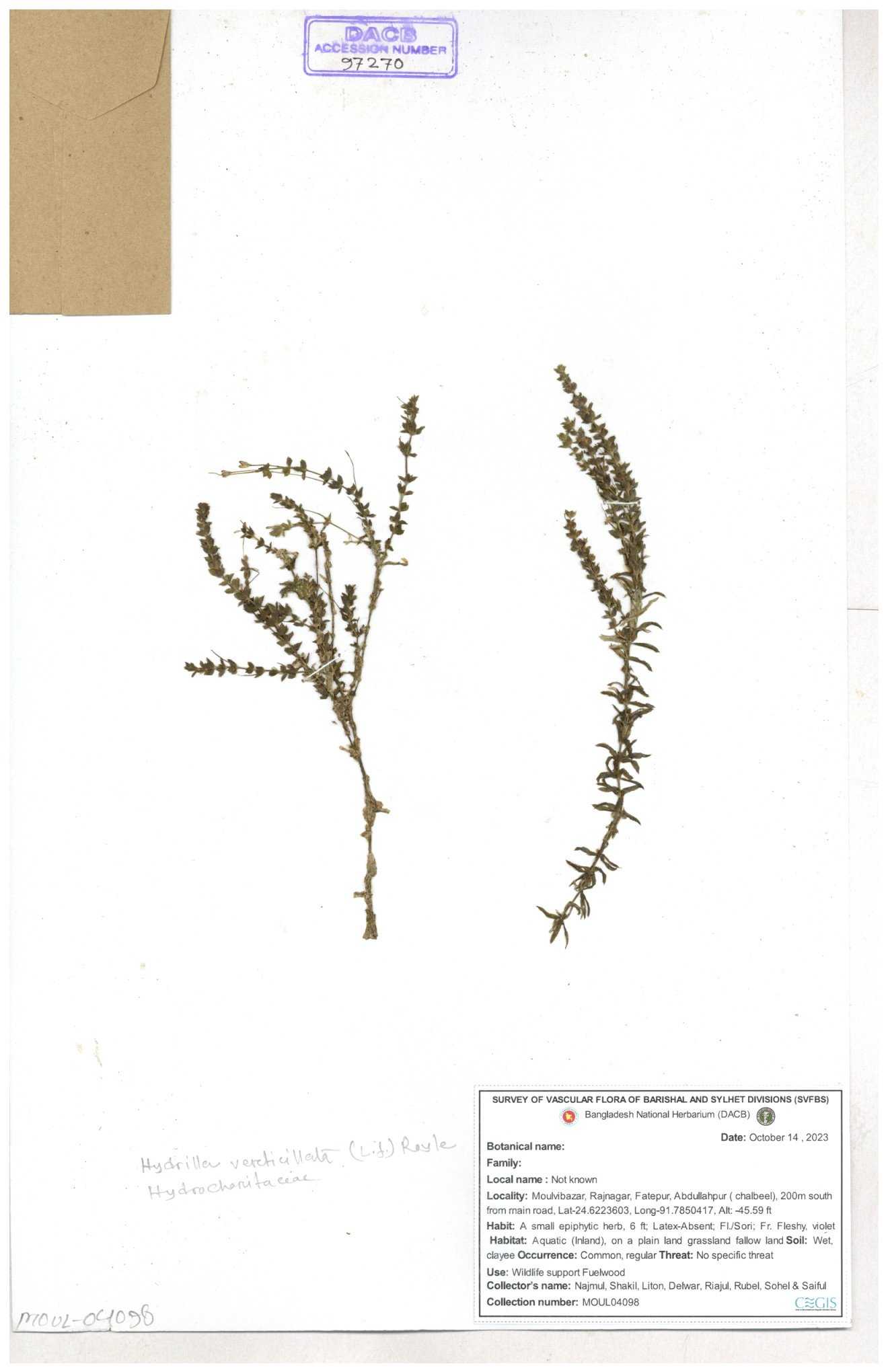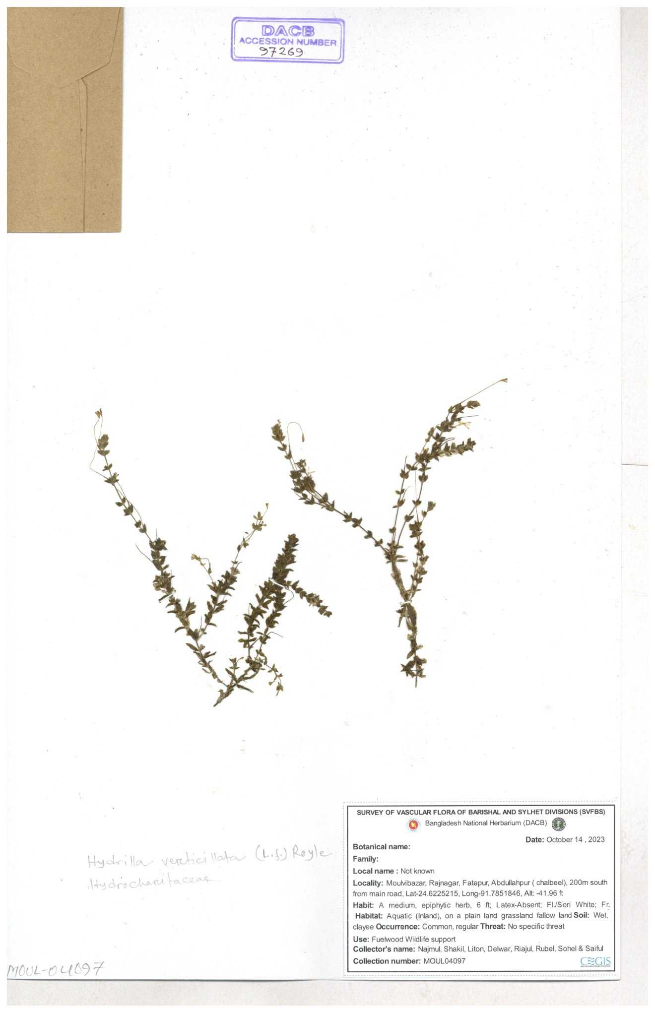 | 97269 | Hydrocharitaceae | Hydrilla verrticillata | 30-11--0001 |
