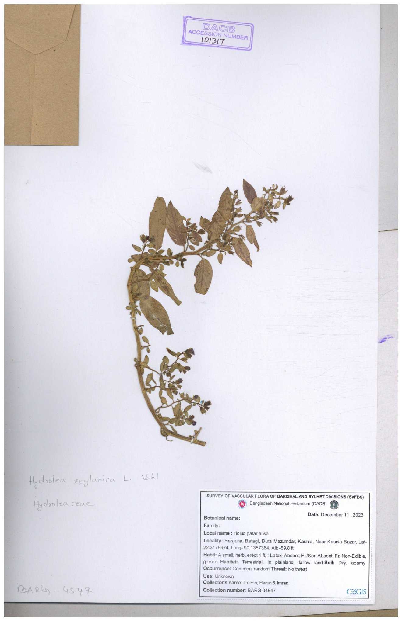 | 101317 | Hydroleaceae | Hydrolea zeylanica | 30-11--0001 |