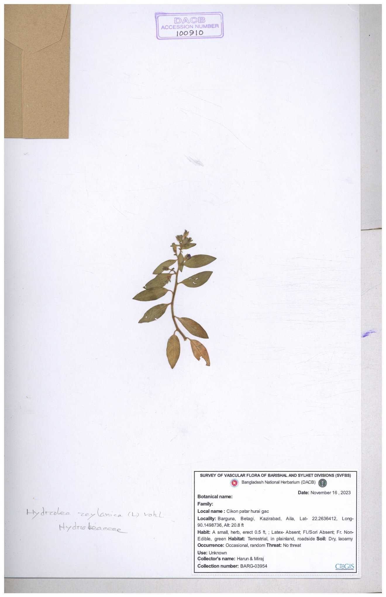 | 100910 | Hydroleaceae | Hydrolea zeylanica | 30-11--0001 |