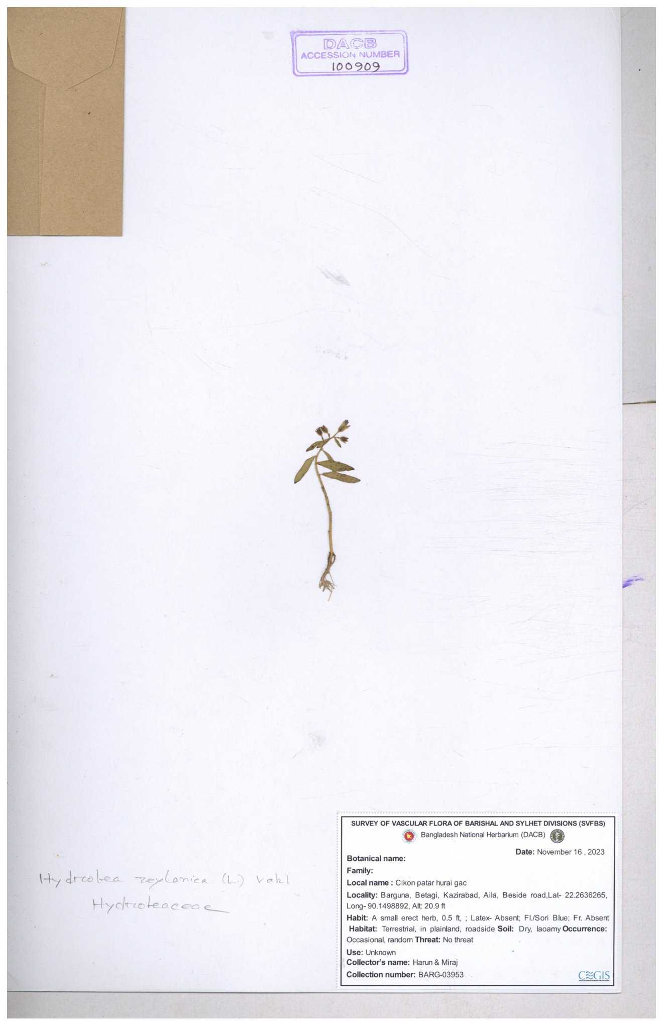 | 100909 | Hydroleaceae | Hydrolea zeylanica | 30-11--0001 |