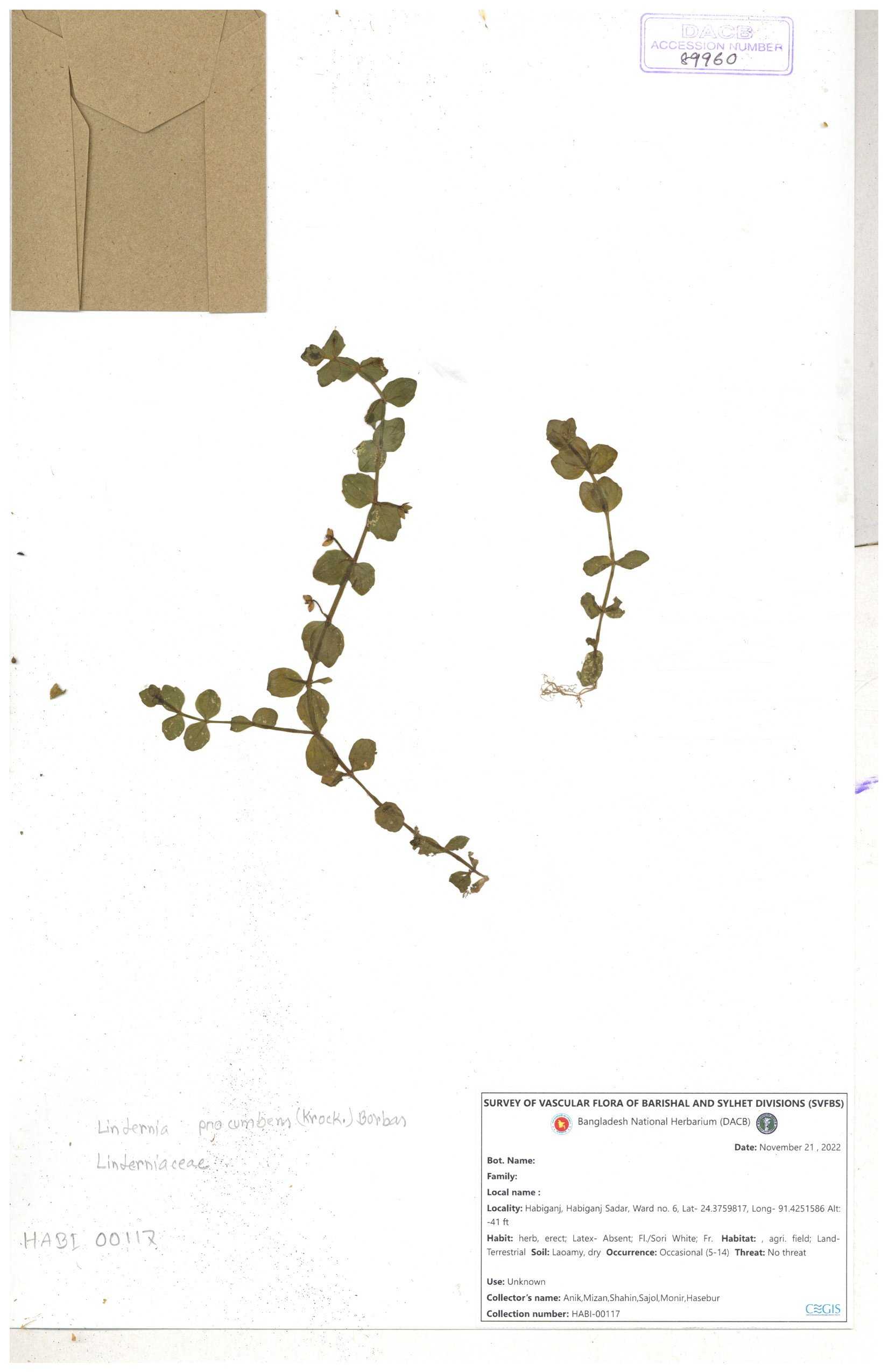 | 20559 | Linderniaceae | Lindernia antipoda (L.) Alston | Khan & Huq | K. 3429 29-11-1973 |