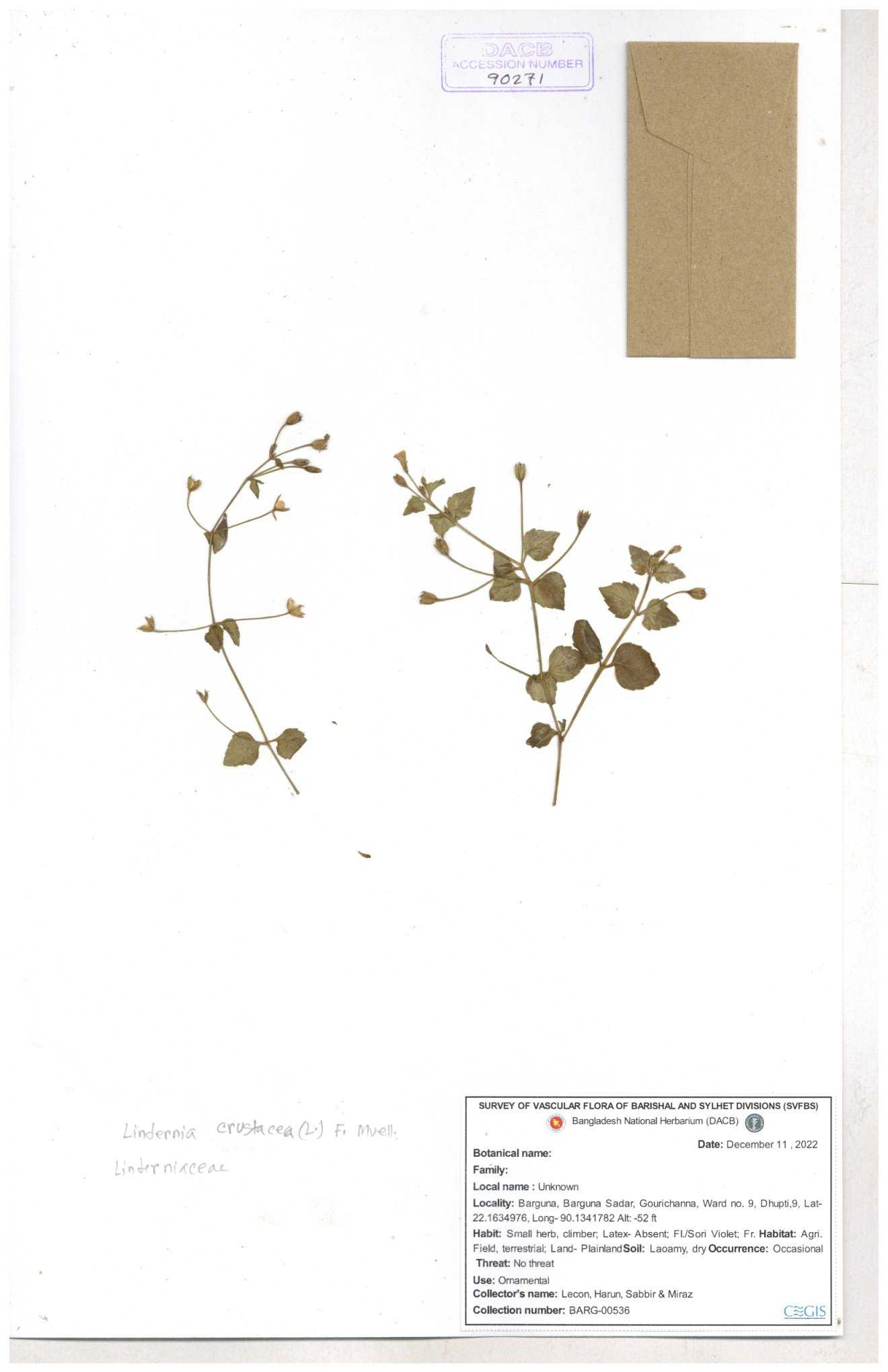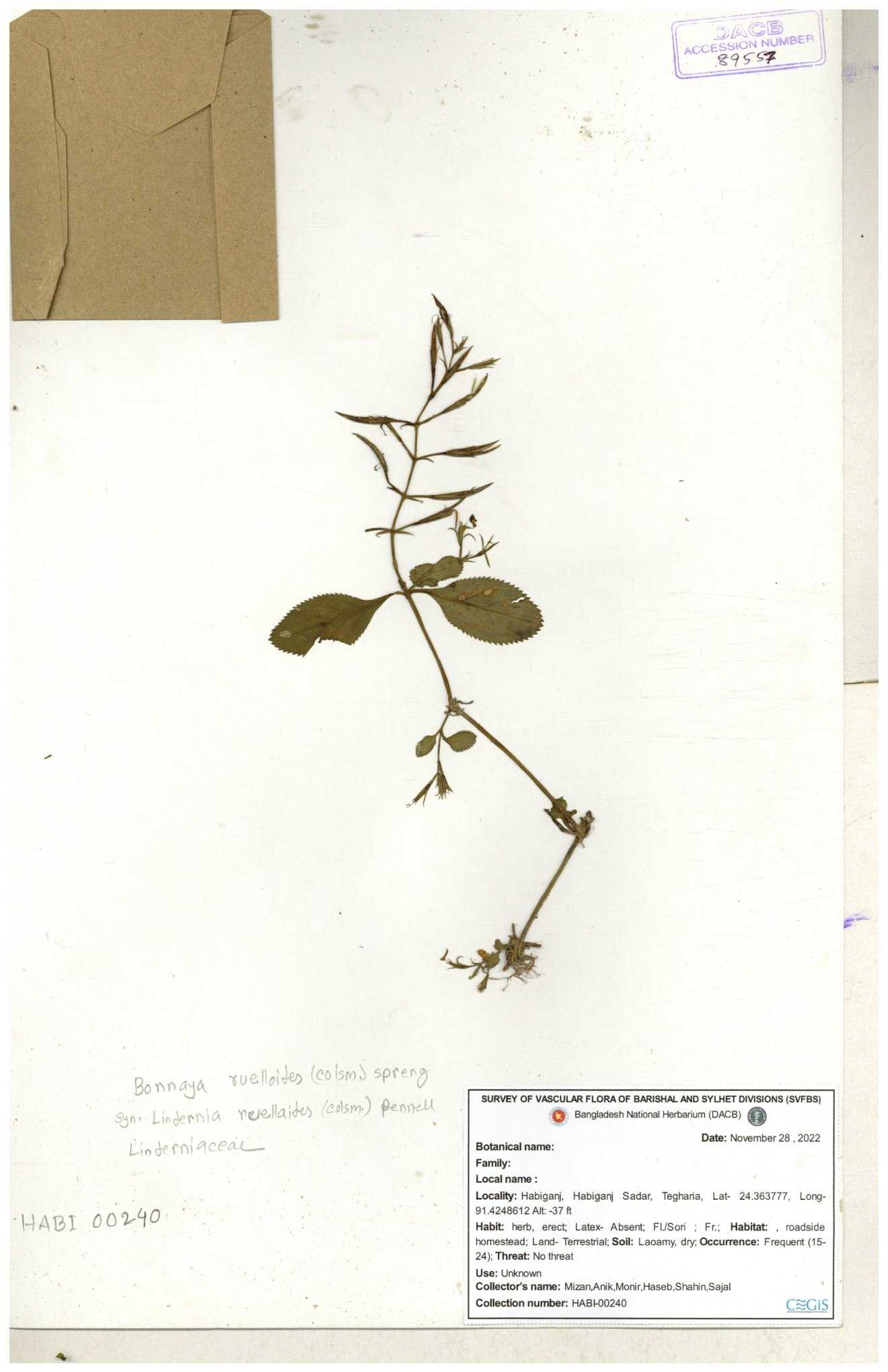 | 20504 | Linderniaceae | Lindernia anagallis (Burm.f.) Pennell | Mahfuz et al. | Mz. 50 05-04-1988 |