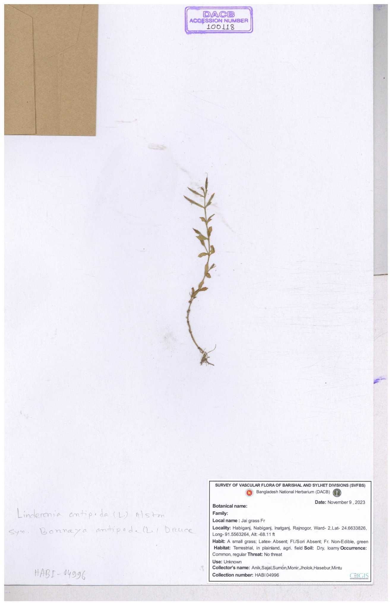 | 20542 | Linderniaceae | Lindernia antipoda (L.) Alston | Huq et al | H. 4818 13-10-1980 |