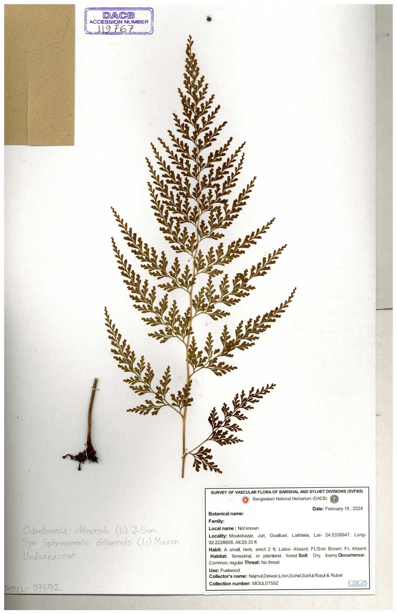 | 63563 | Lindsaeaceae | Sphenomeris chinensis (L.) Maxon | I Hossen, MS Islam, MKR Rahman & MR Miah | IH-4974 30-11--0001 |