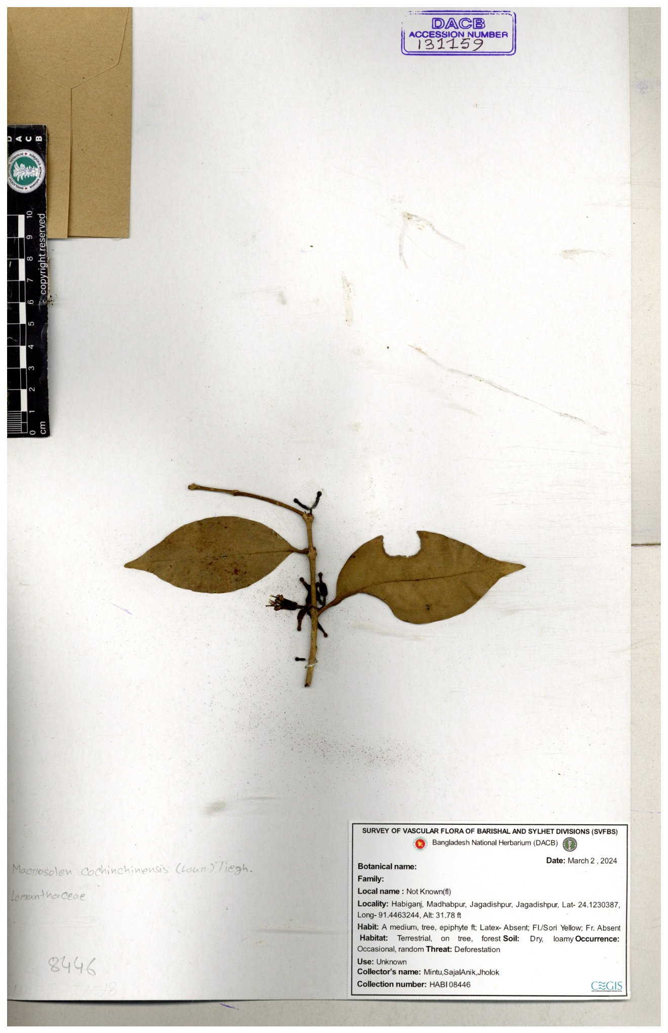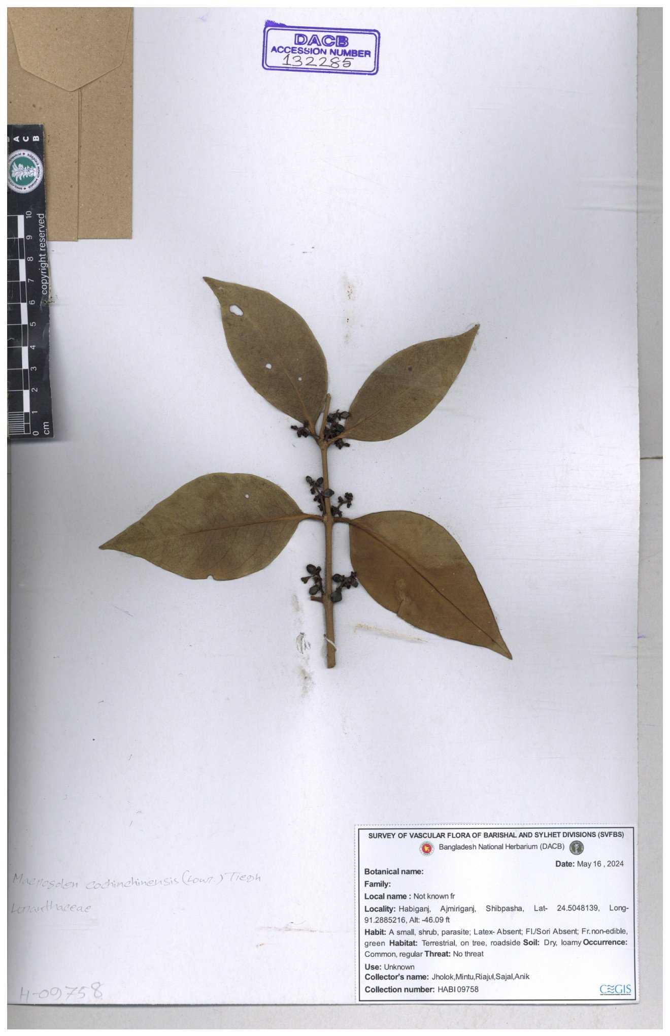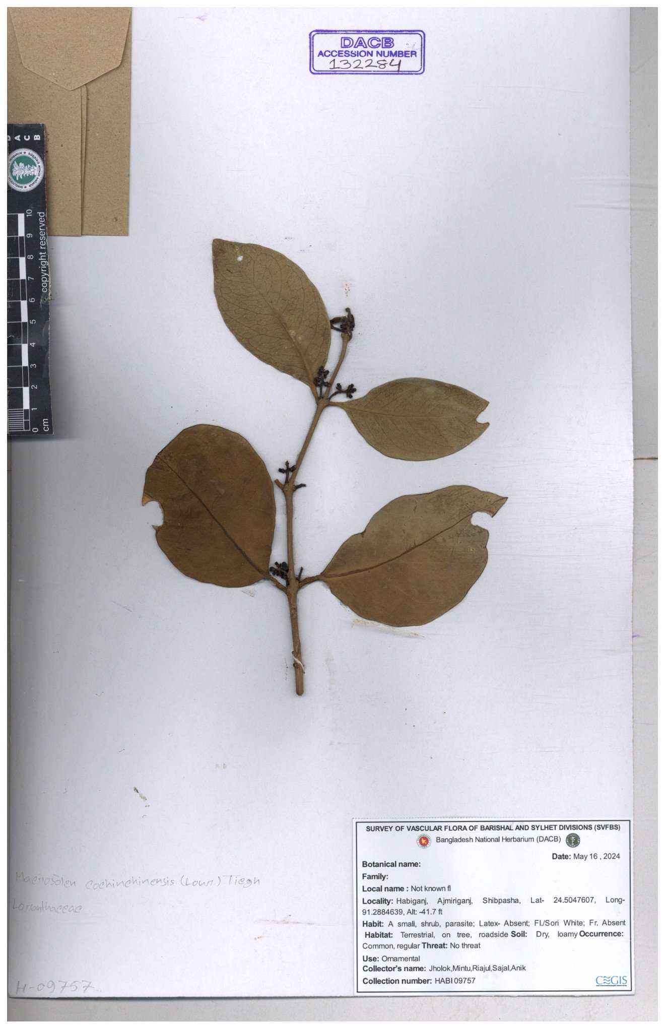 | 6337 | Loranthaceae | Macrosolen cochichinensis (Loun) | Huq & Rahman & Mia | H-5912 30-11--0001 |